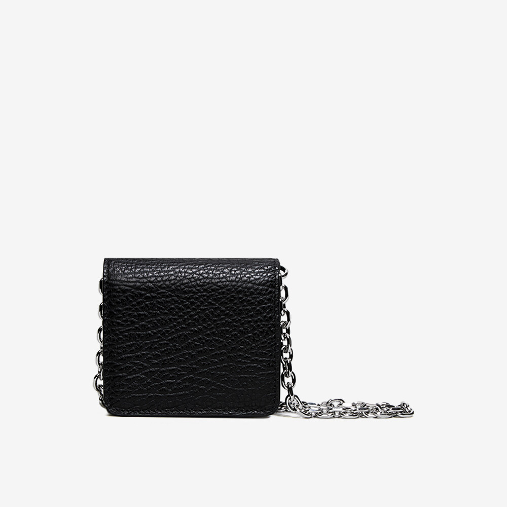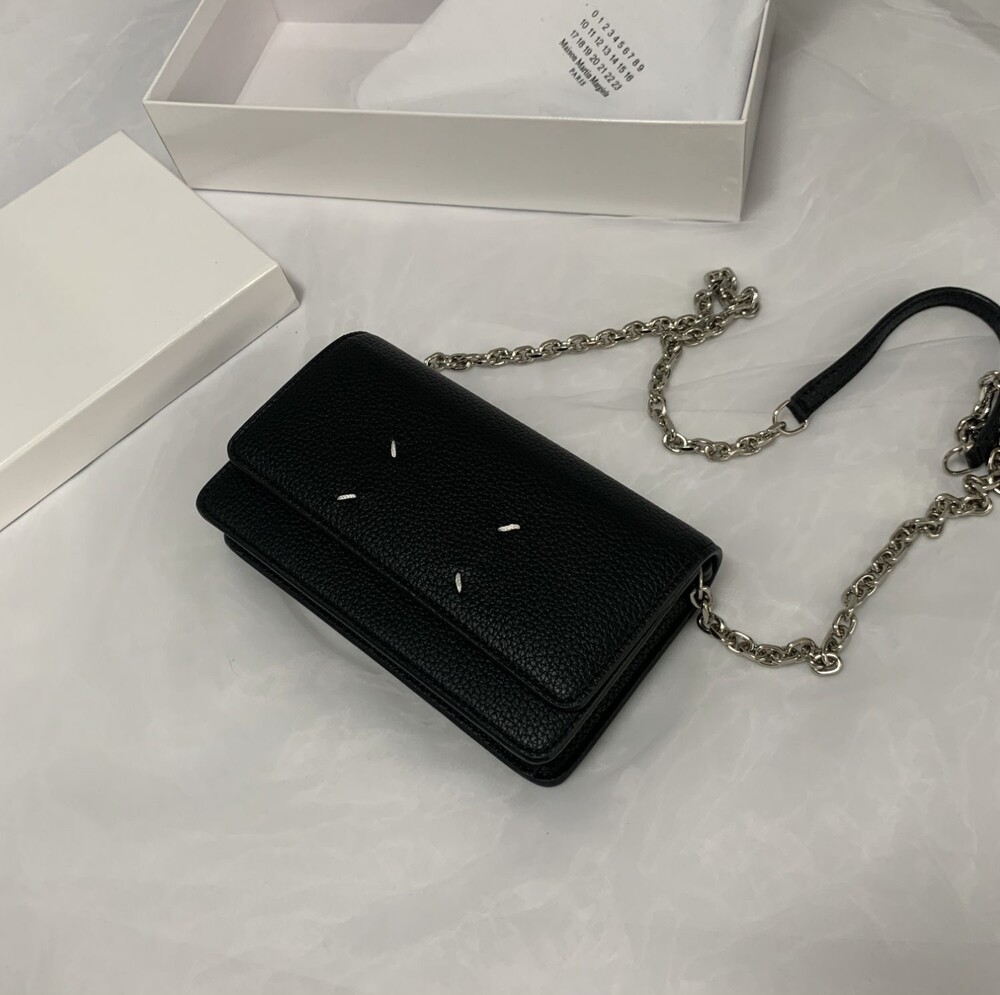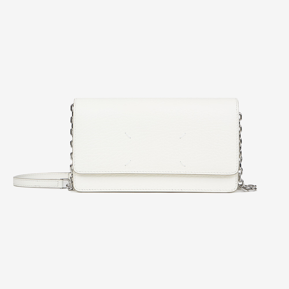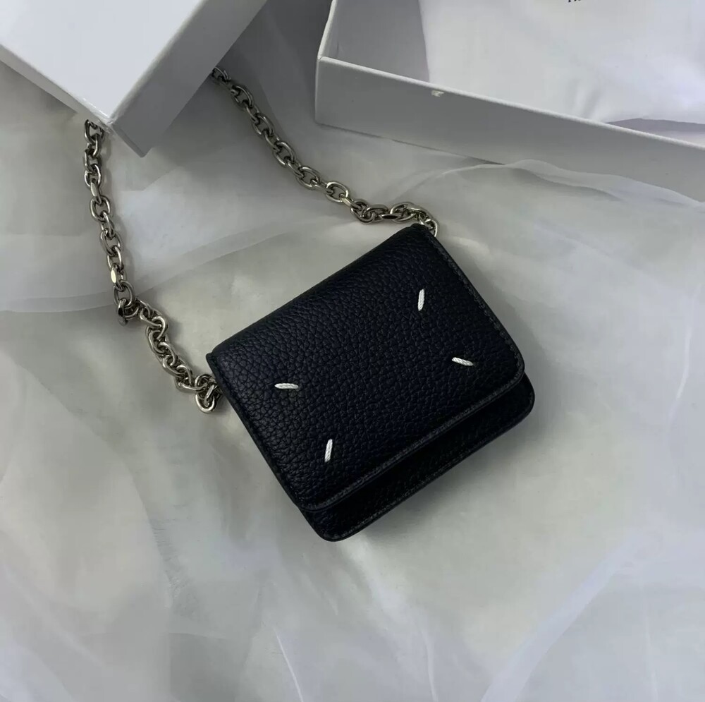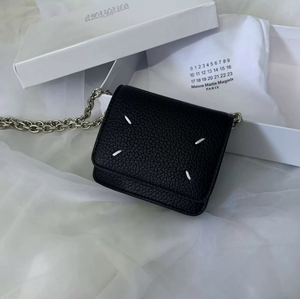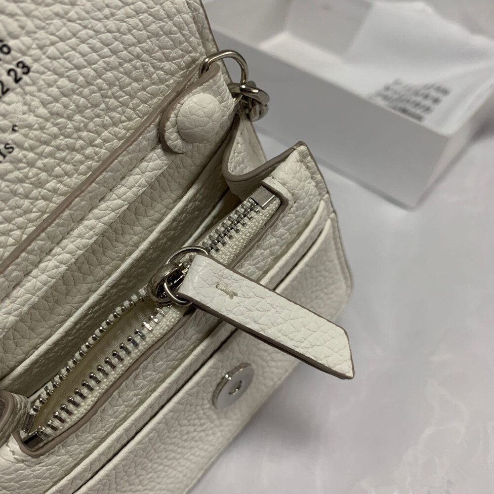 그레인 가죽 소재의 지갑. 체인. 내부에 숫자 로고, 지퍼 동전 지갑, 카드 및 지폐 슬롯. 뒷면에 메종 마르지엘라의 손길을 보여주는 라벨 반대편에서 보이는 4개의 화이트 스티치