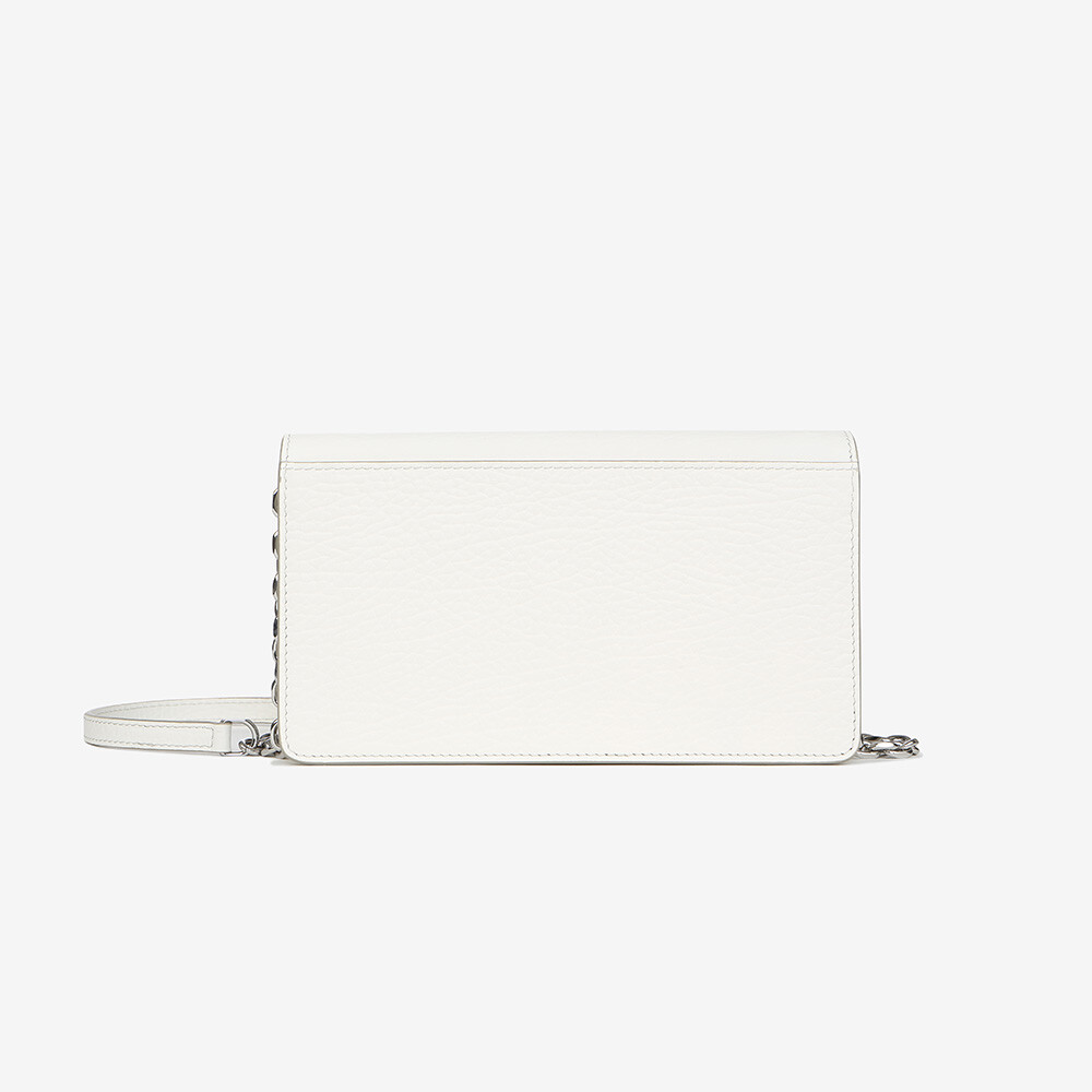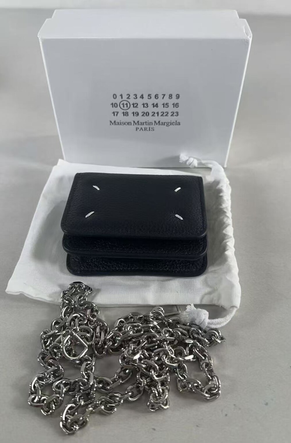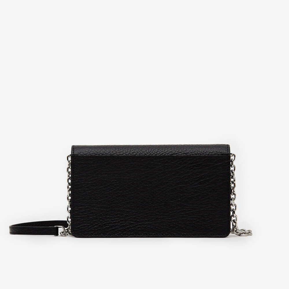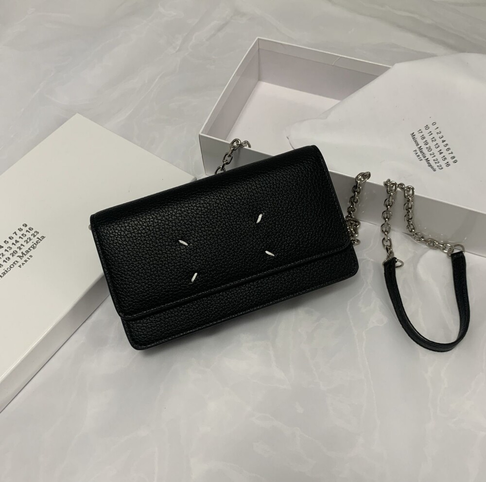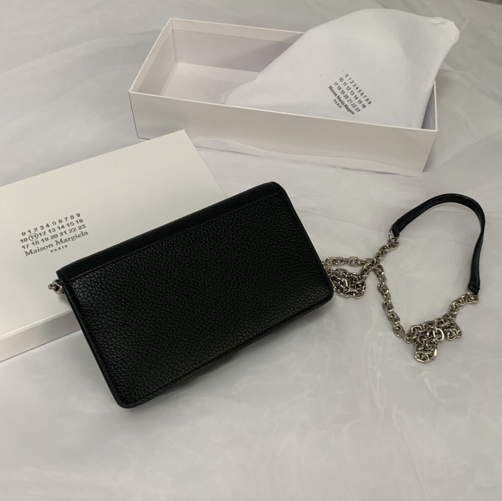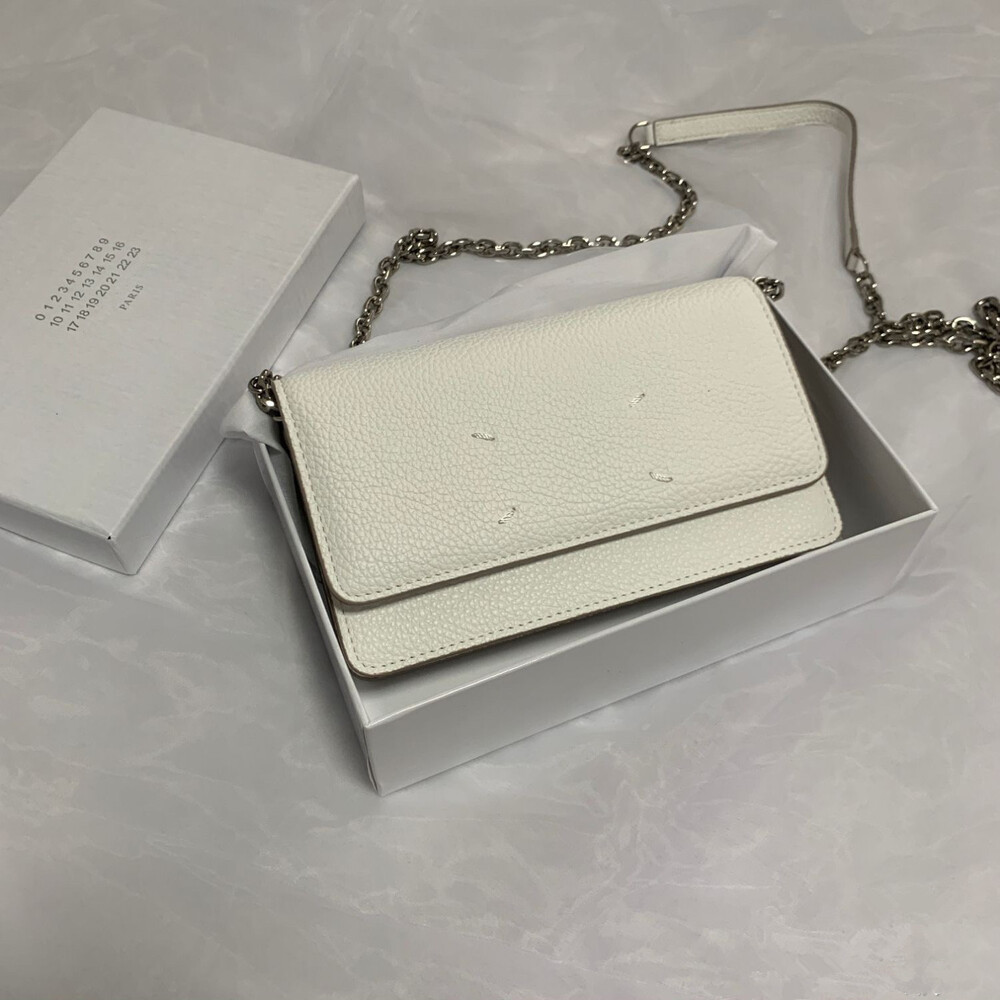 그레인 가죽 소재의 지갑. 체인. 내부에 숫자 로고, 지퍼 동전 지갑, 카드 및 지폐 슬롯. 뒷면에 메종 마르지엘라의 손길을 보여주는 라벨 반대편에서 보이는 4개의 화이트 스티치