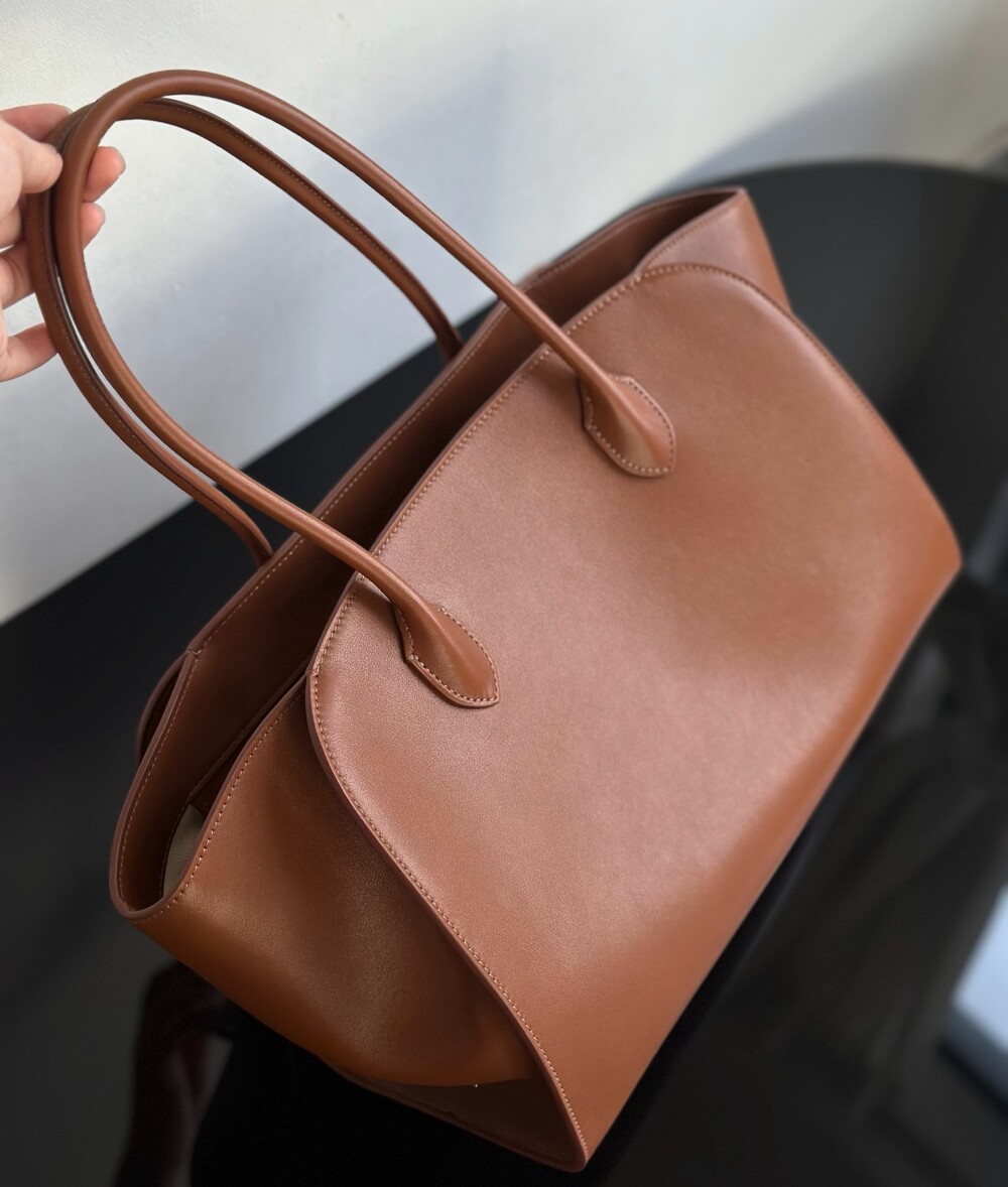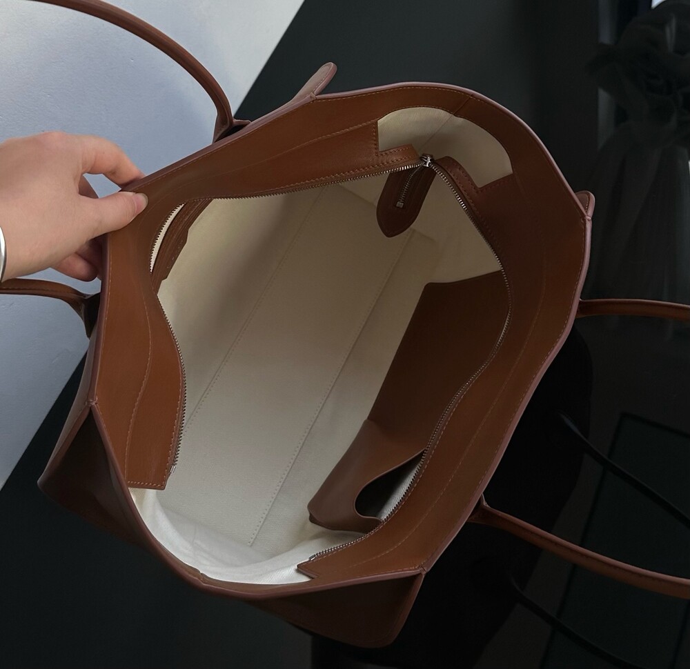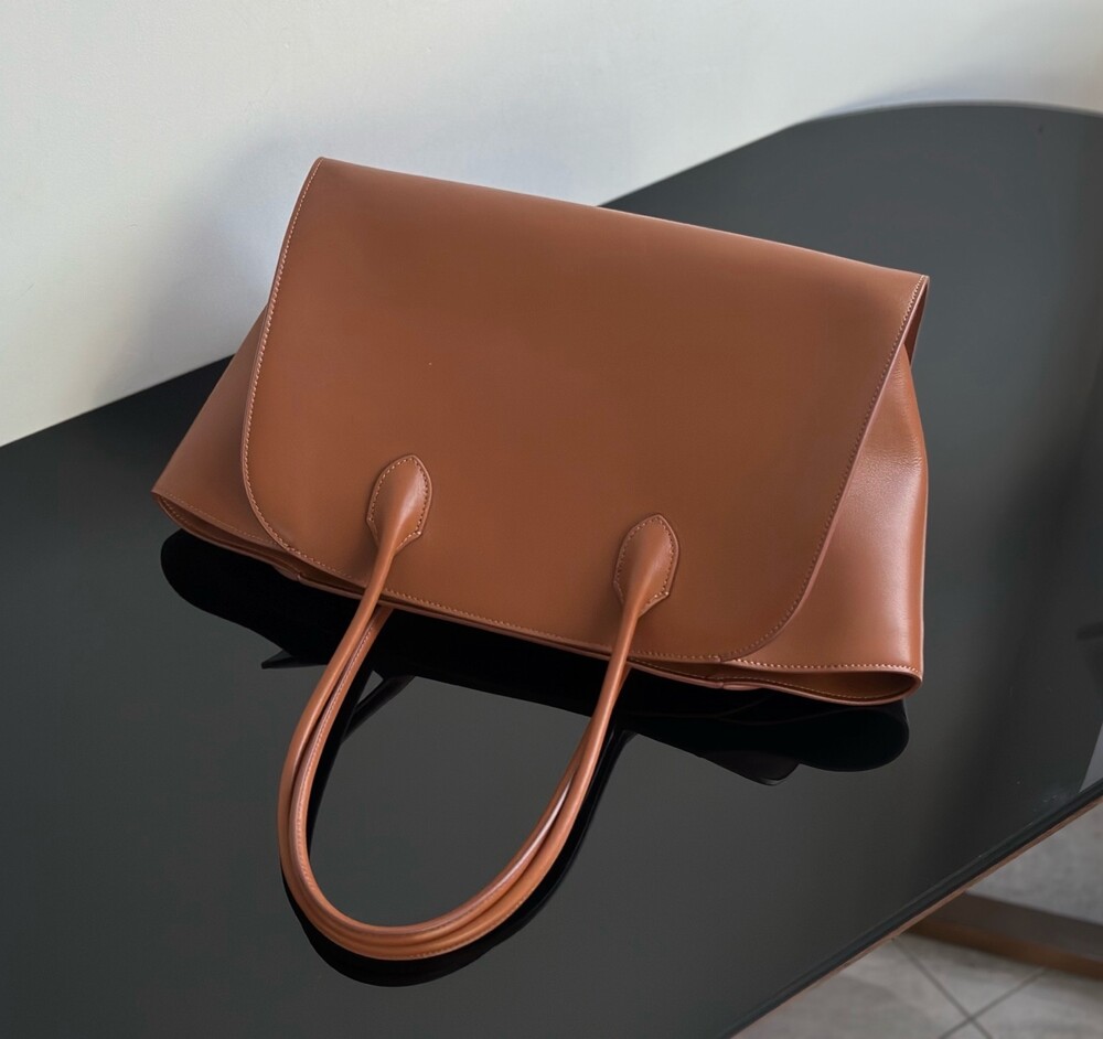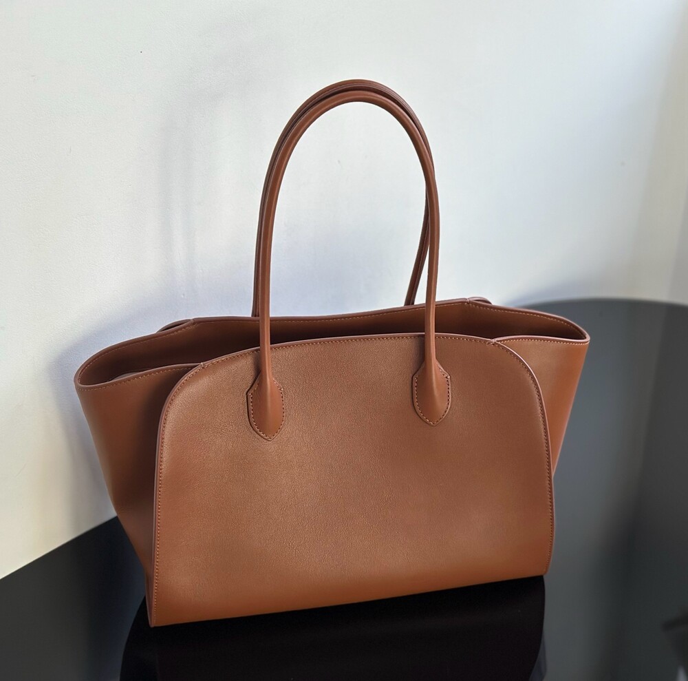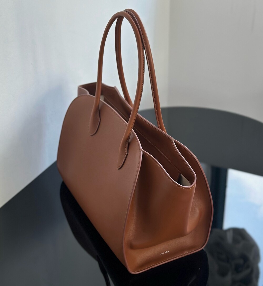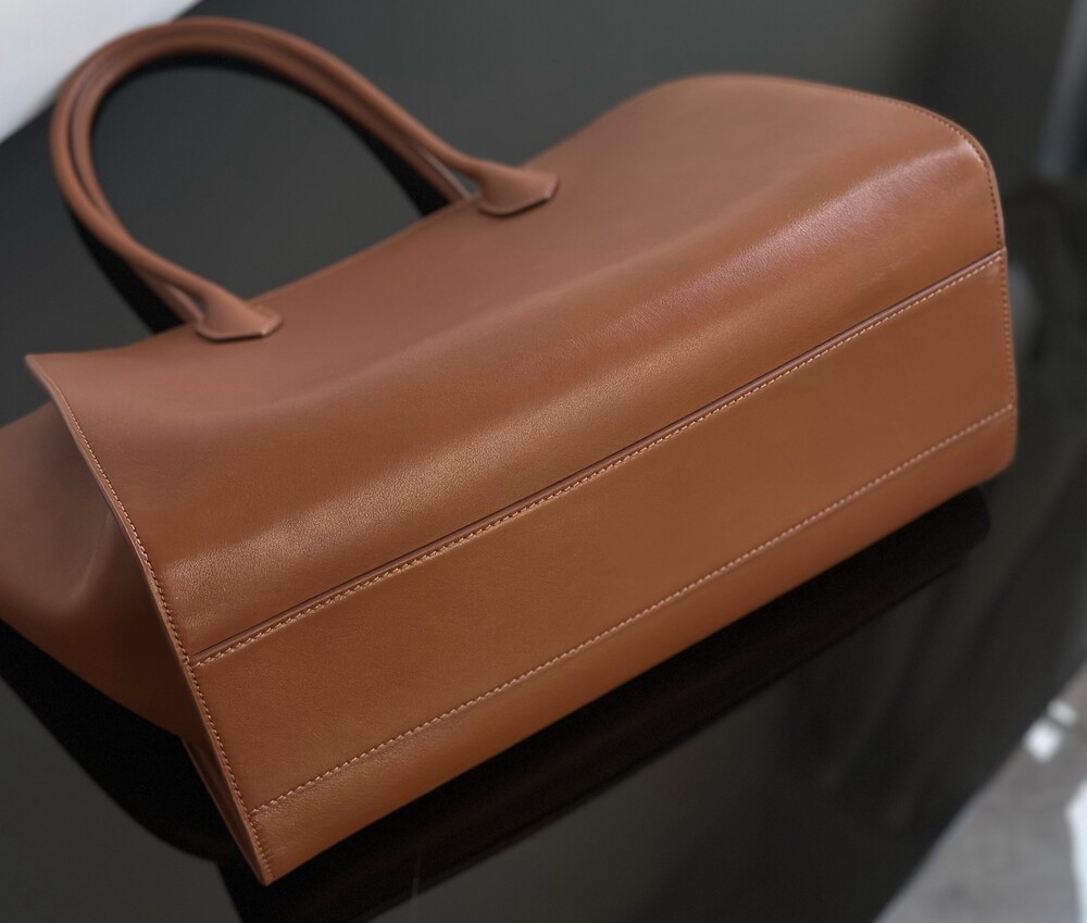 광택 마감된 새들 가죽 소재의 소프트 스트럭처 토트 백으로, 튜브형 핸들과 거싯 디테일의 옆면 패널이 특징입니다.