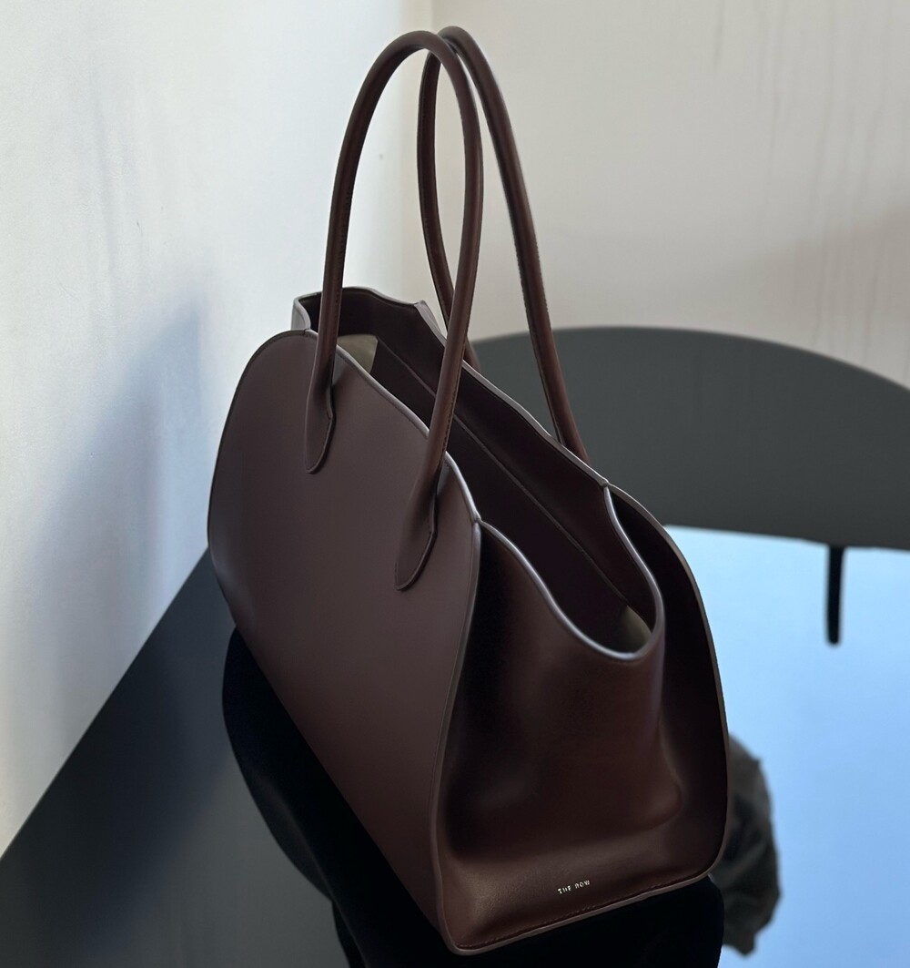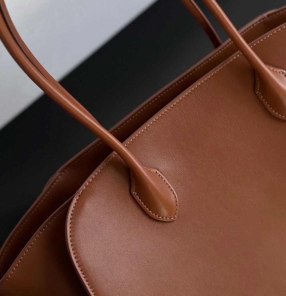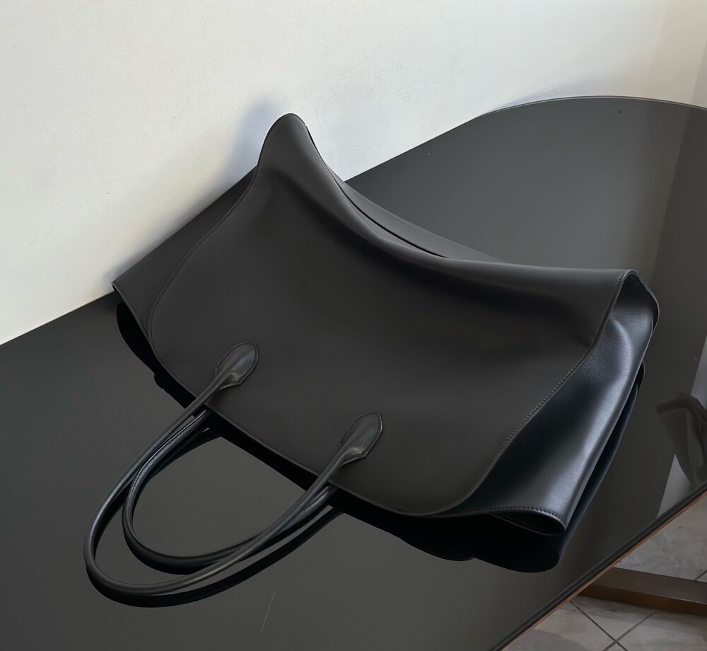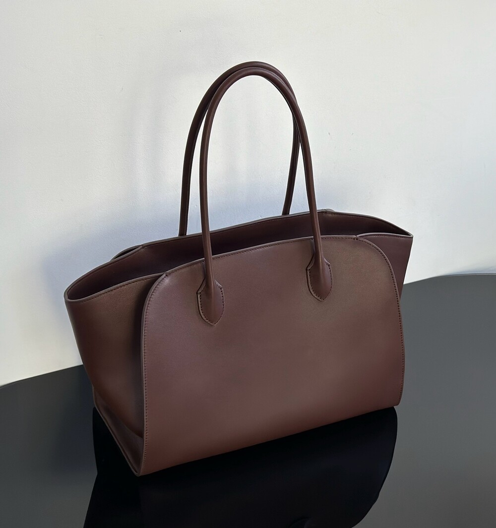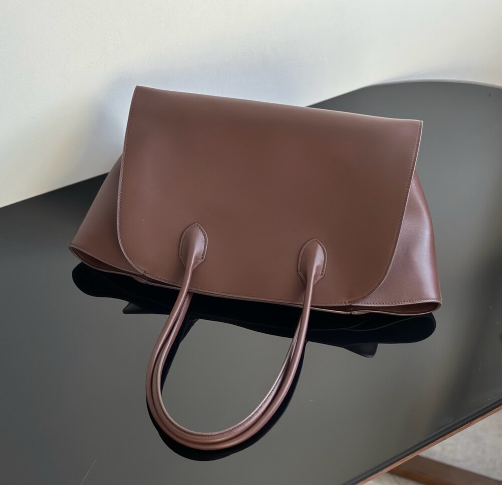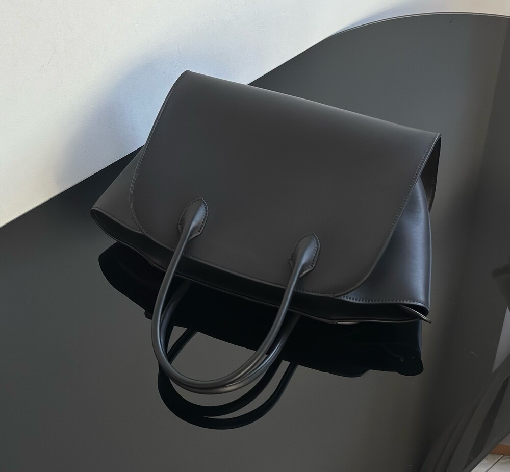 광택 마감된 새들 가죽 소재의 소프트 스트럭처 토트 백으로, 튜브형 핸들과 거싯 디테일의 옆면 패널이 특징입니다.