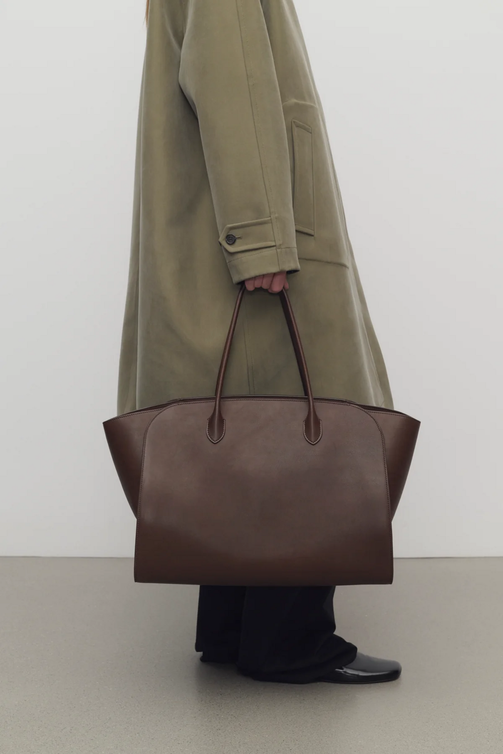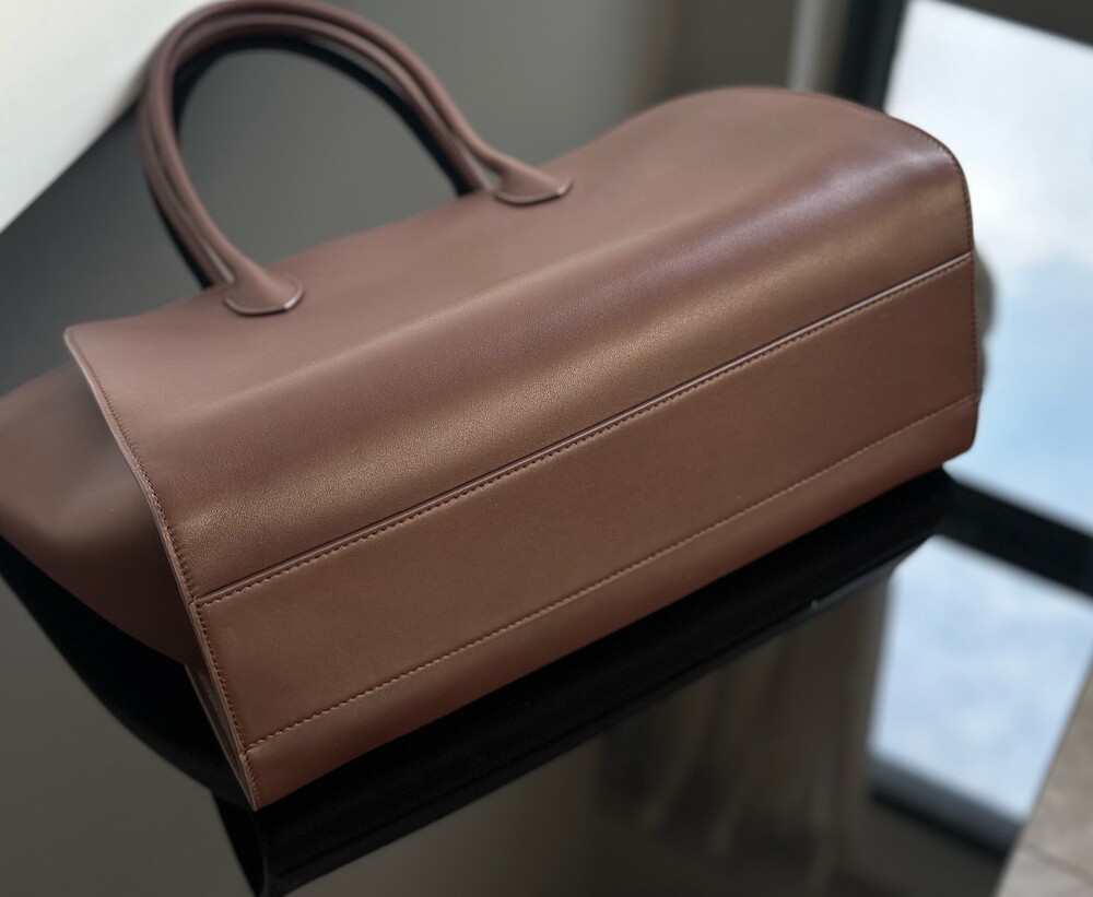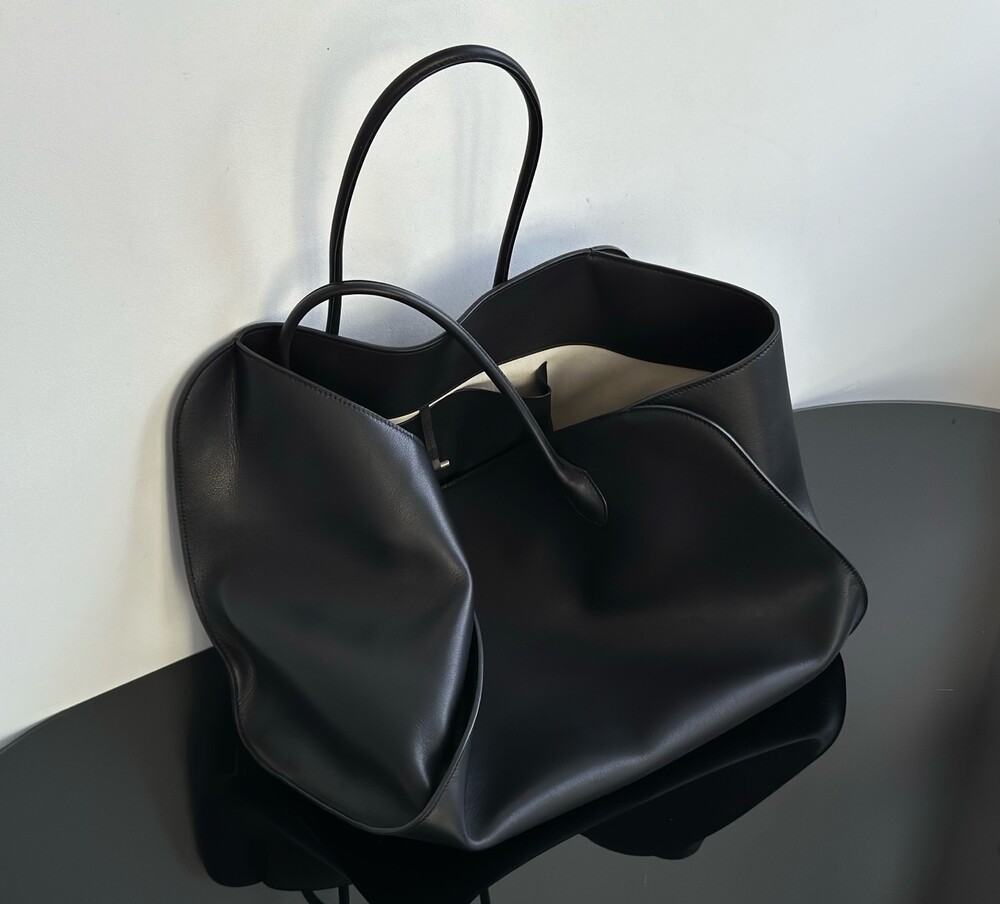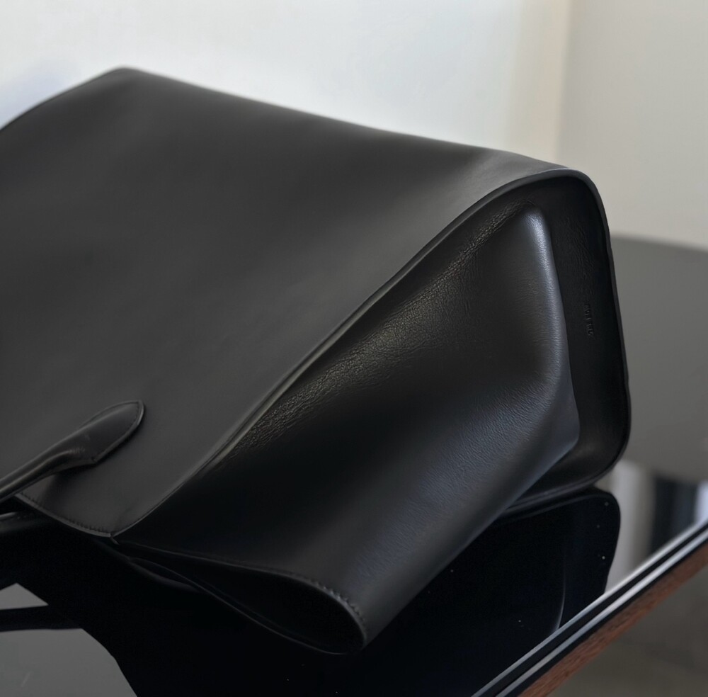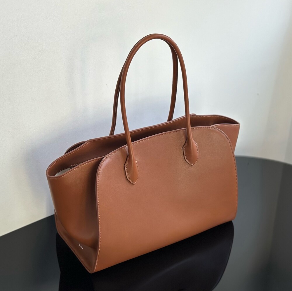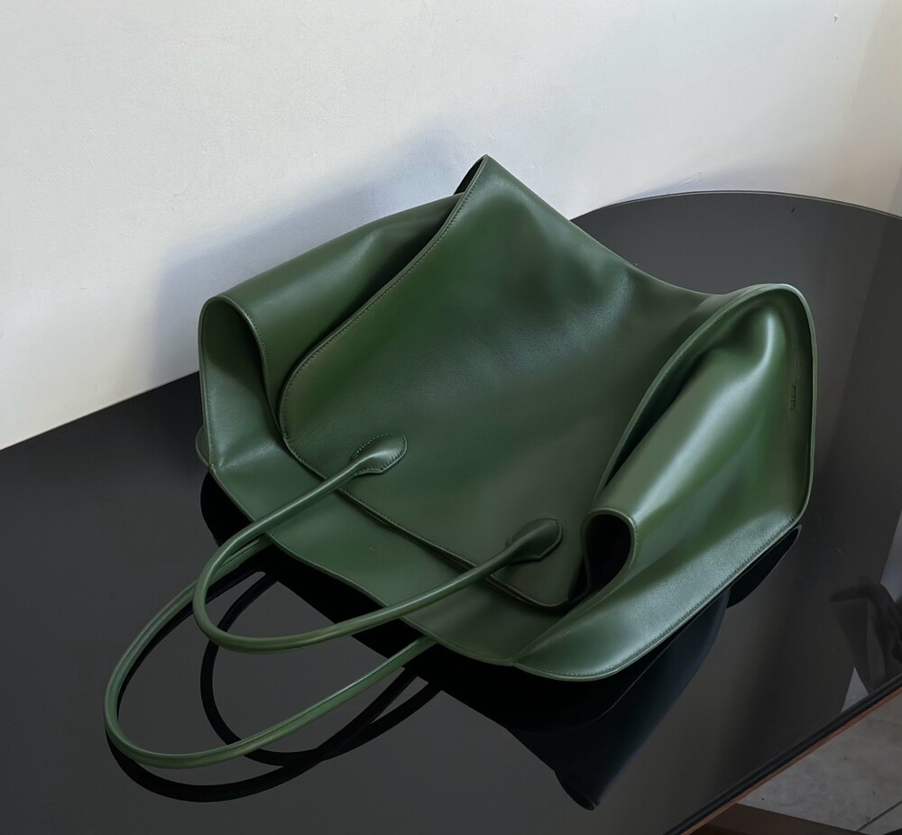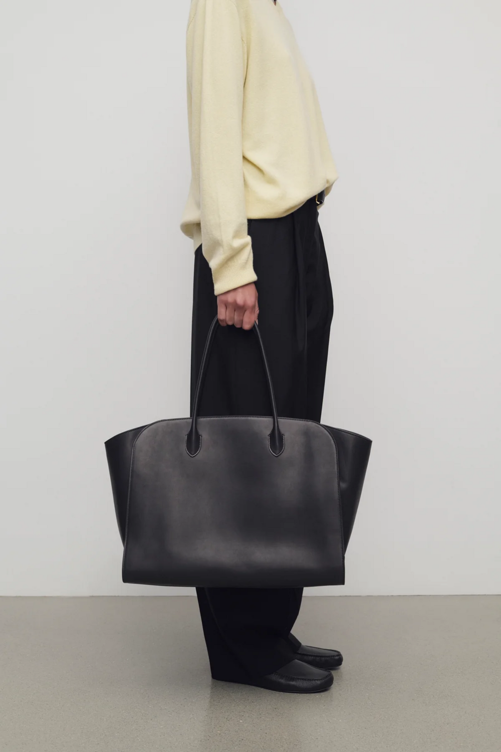 광택 마감된 새들 가죽 소재의 소프트 스트럭처 토트 백으로, 튜브형 핸들과 거싯 디테일의 옆면 패널이 특징입니다.