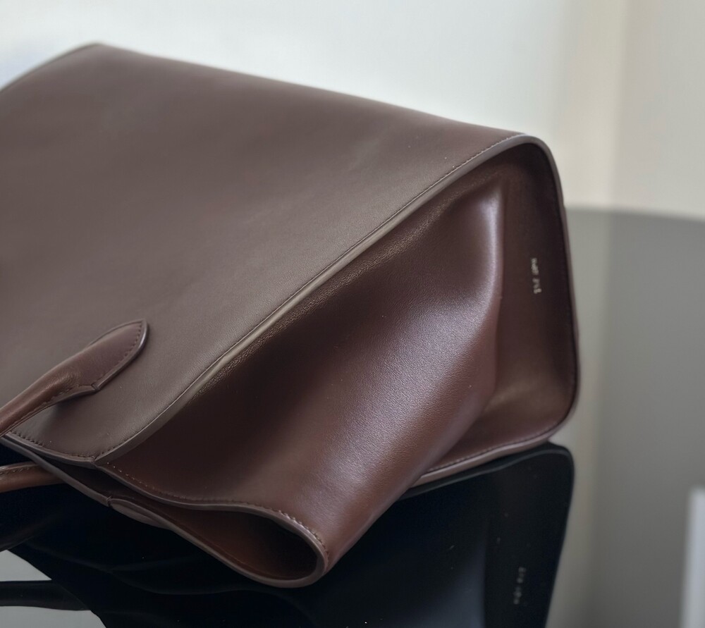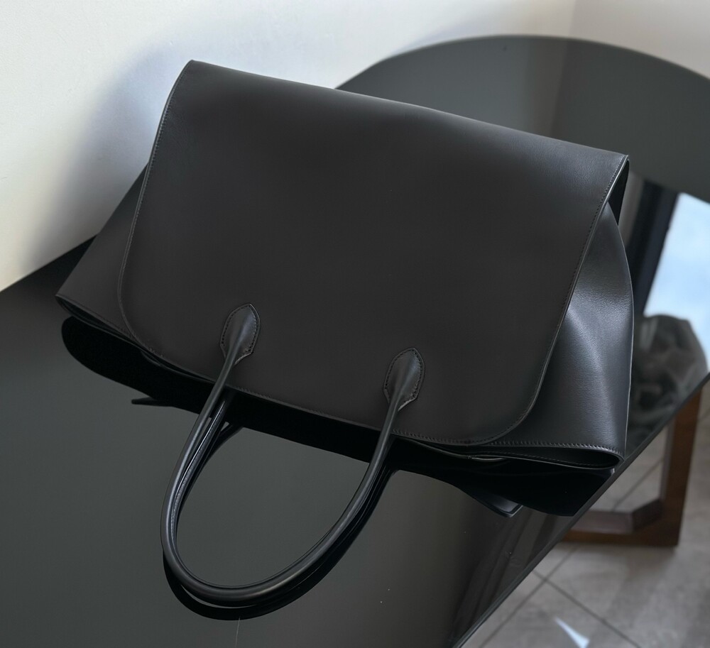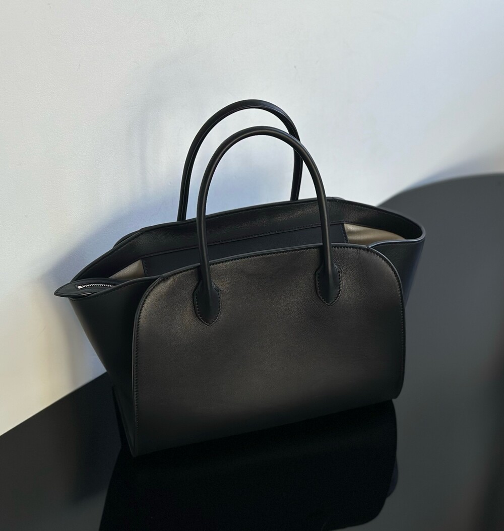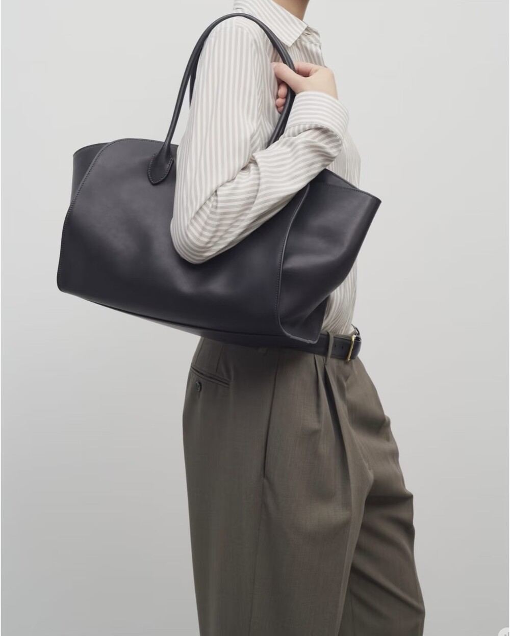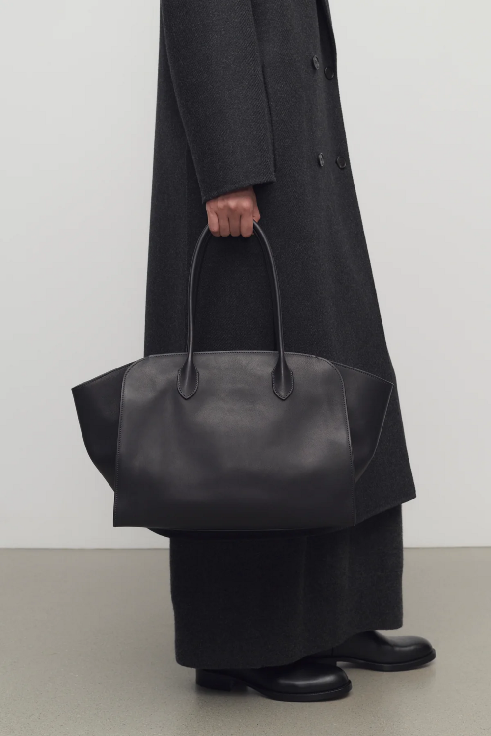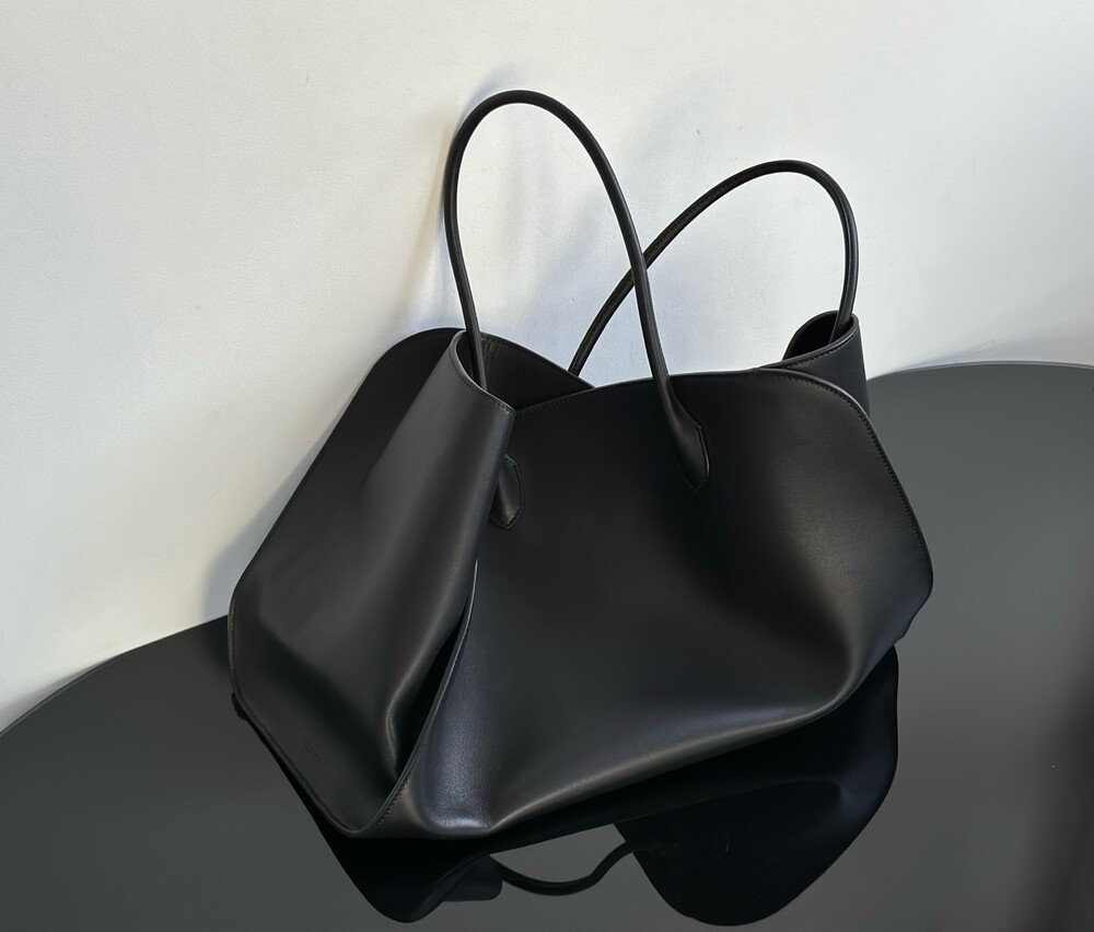 광택 마감된 새들 가죽 소재의 소프트 스트럭처 토트 백으로, 튜브형 핸들과 거싯 디테일의 옆면 패널이 특징입니다.