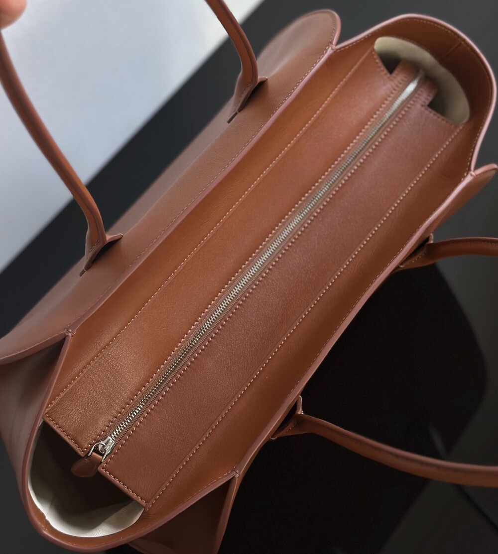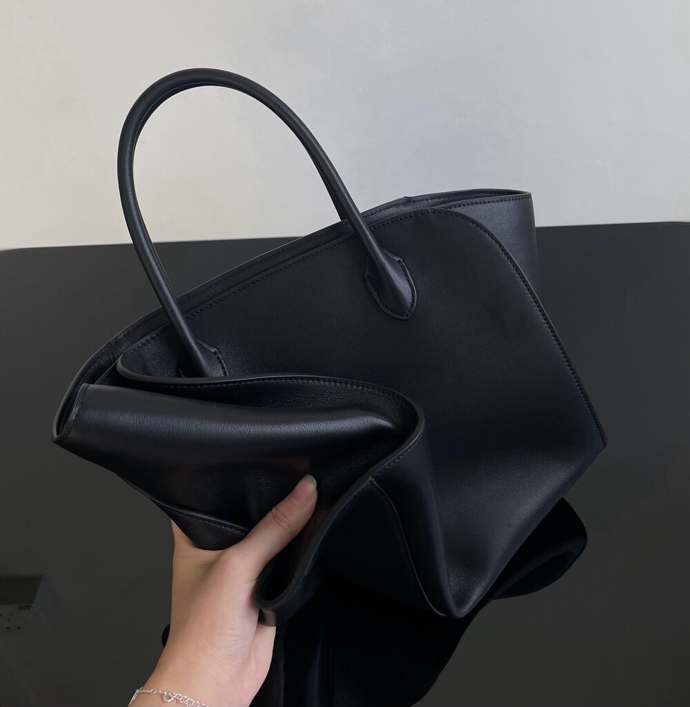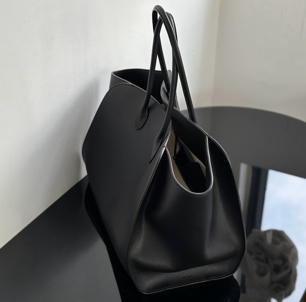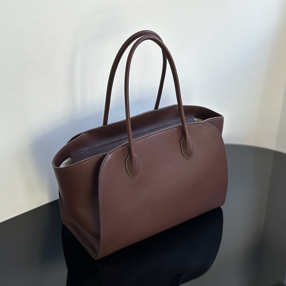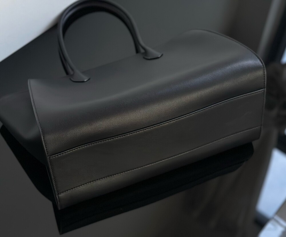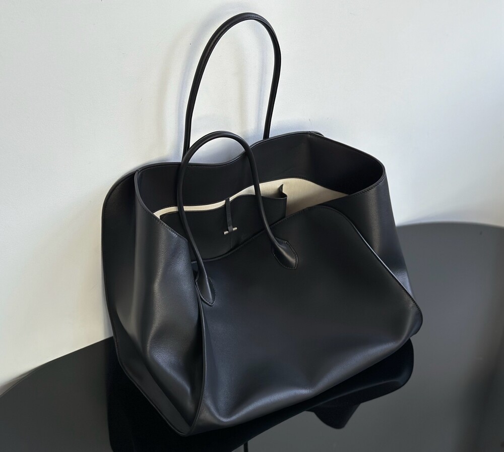 광택 마감된 새들 가죽 소재의 소프트 스트럭처 토트 백으로, 튜브형 핸들과 거싯 디테일의 옆면 패널이 특징입니다.
