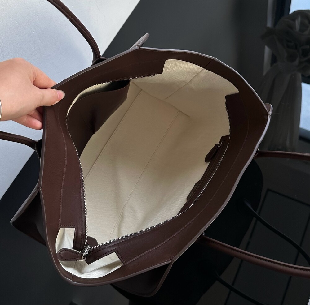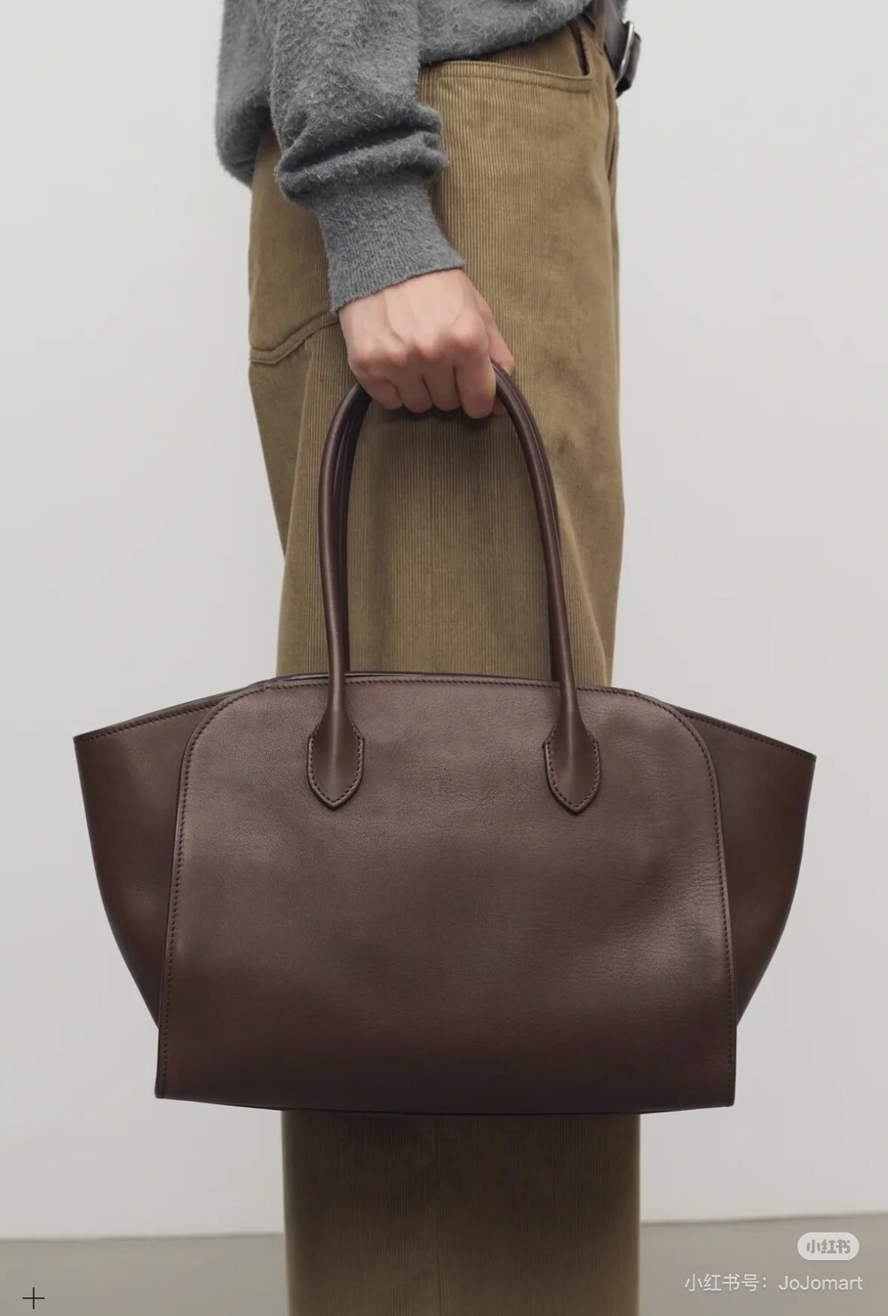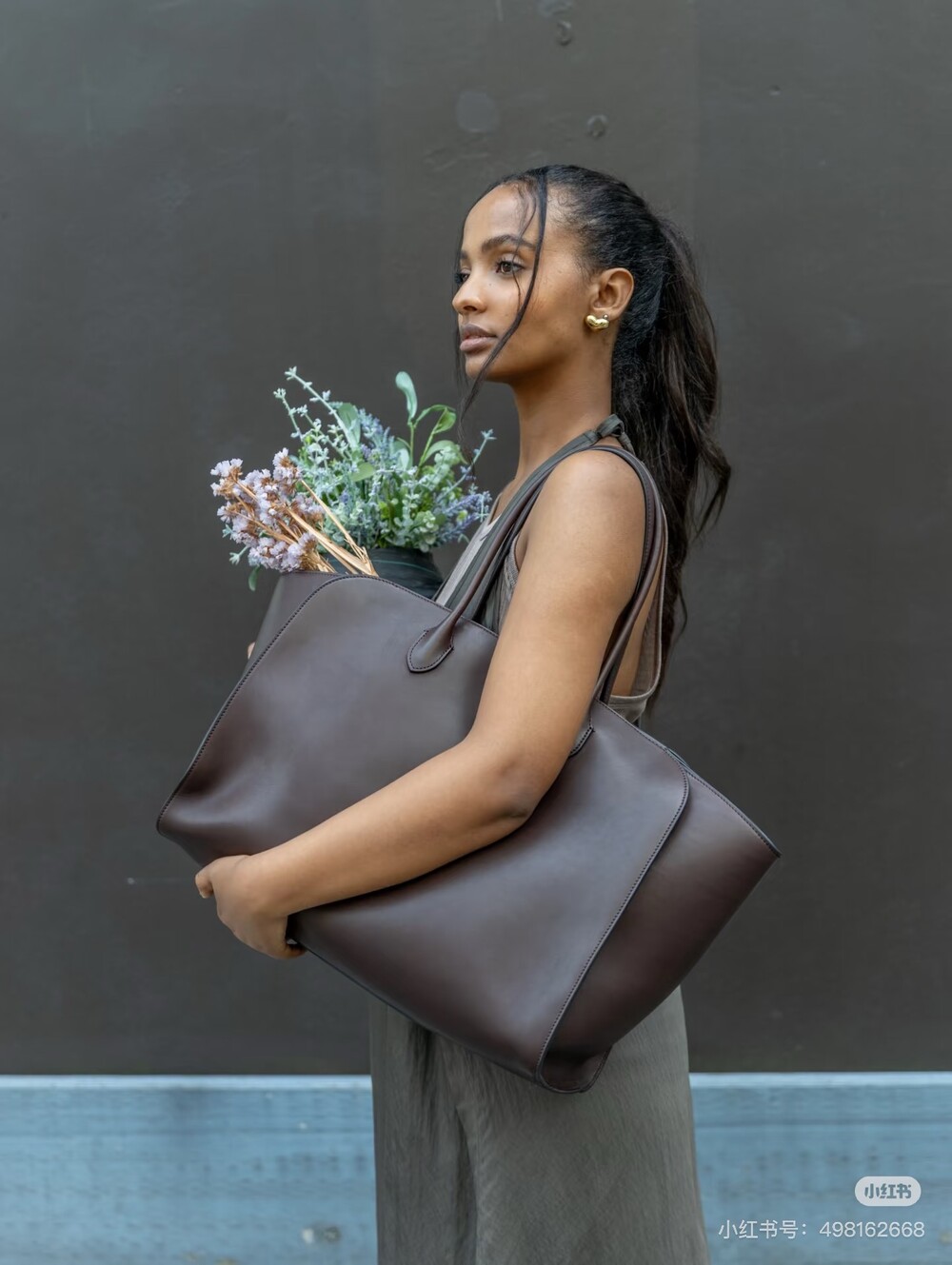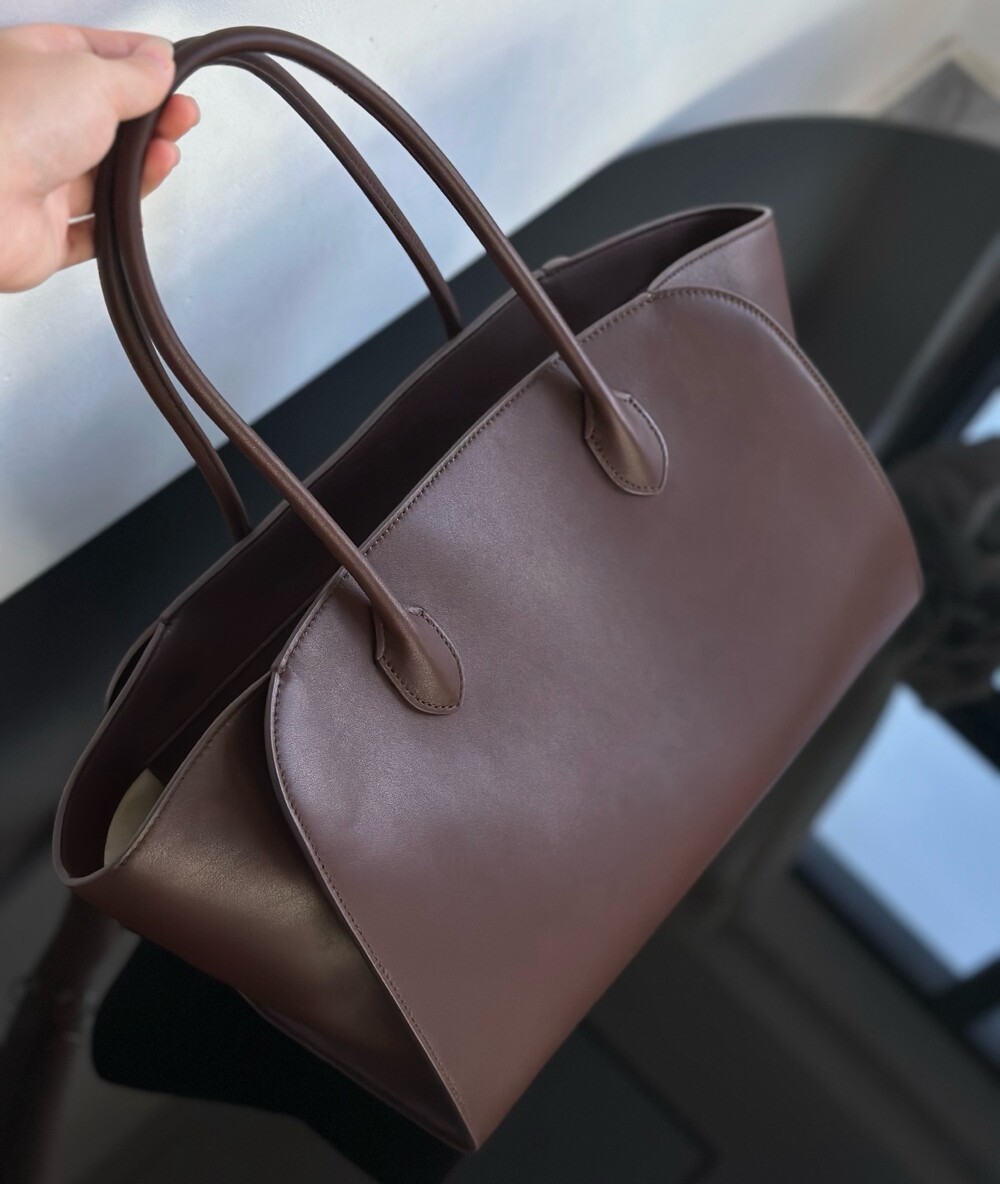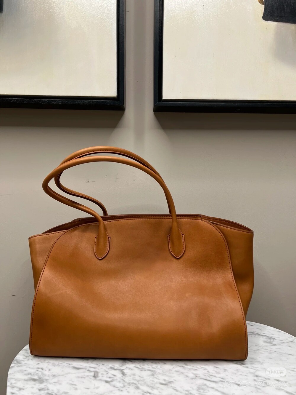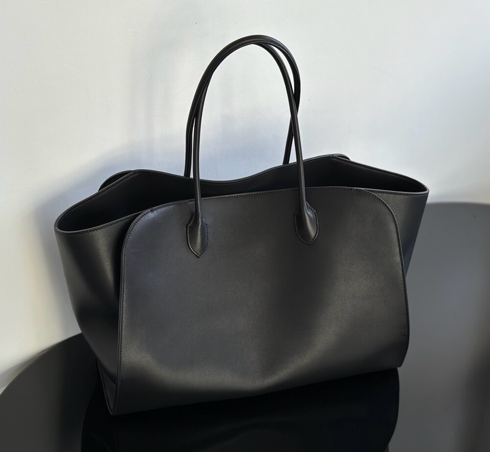 광택 마감된 새들 가죽 소재의 소프트 스트럭처 토트 백으로, 튜브형 핸들과 거싯 디테일의 옆면 패널이 특징입니다.