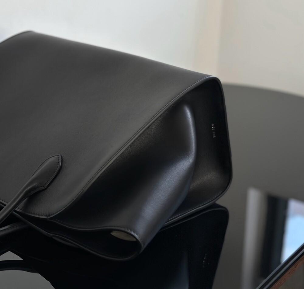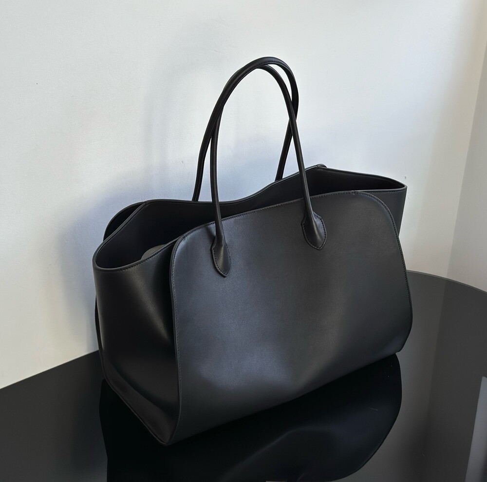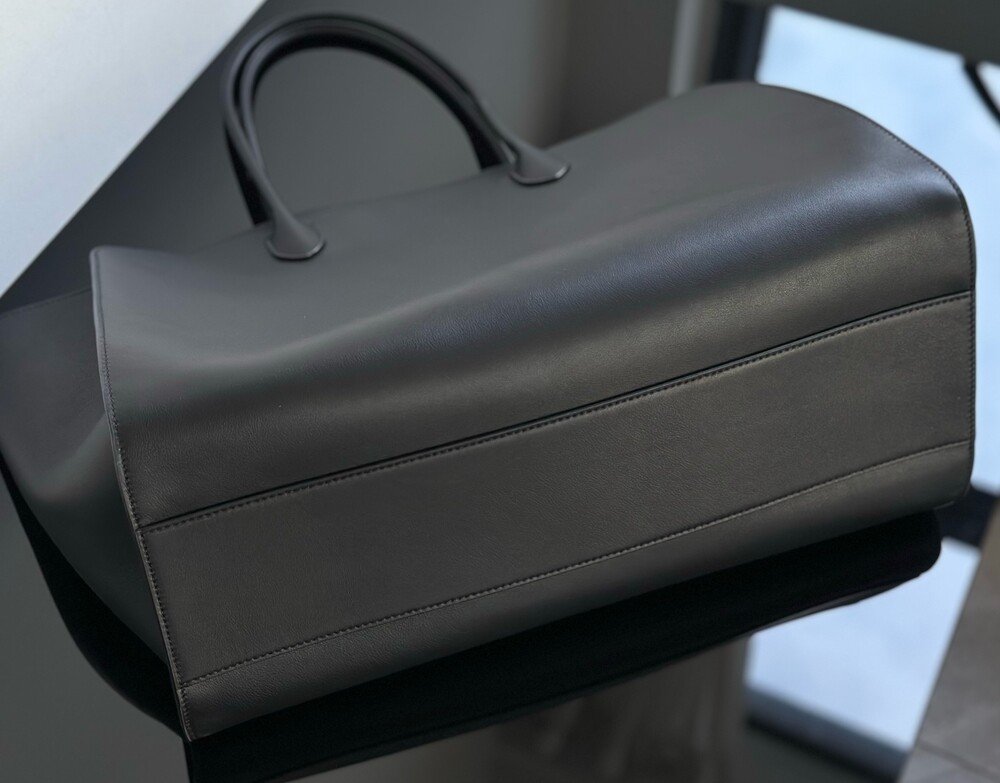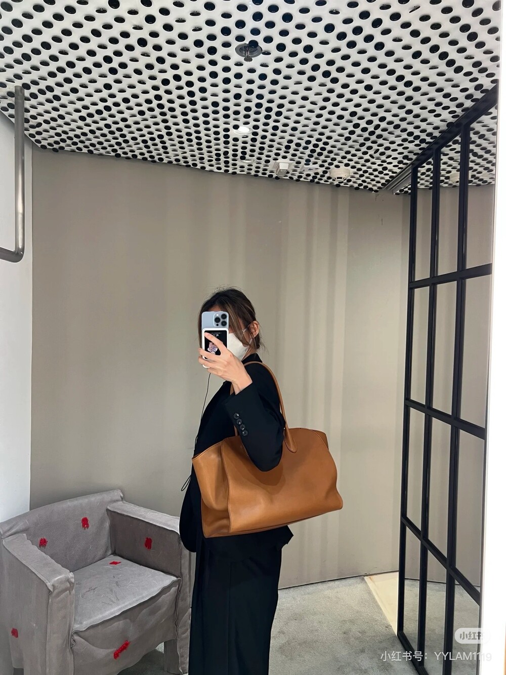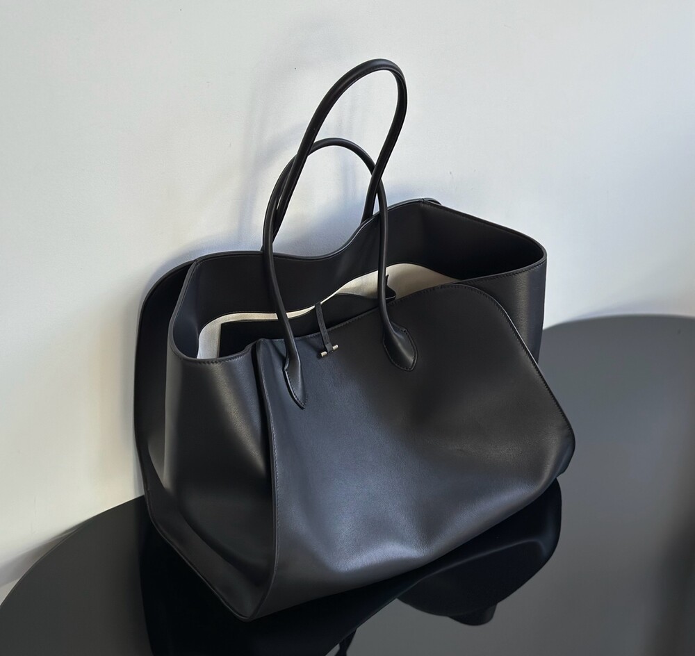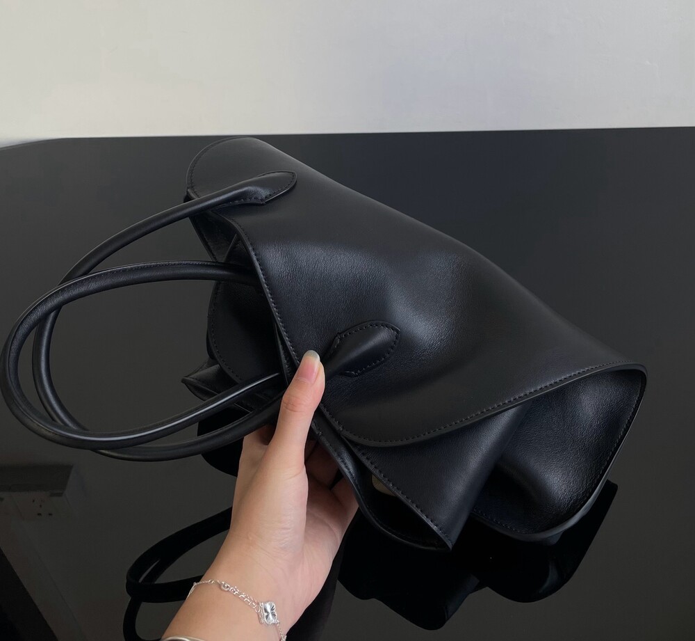 광택 마감된 새들 가죽 소재의 소프트 스트럭처 토트 백으로, 튜브형 핸들과 거싯 디테일의 옆면 패널이 특징입니다.