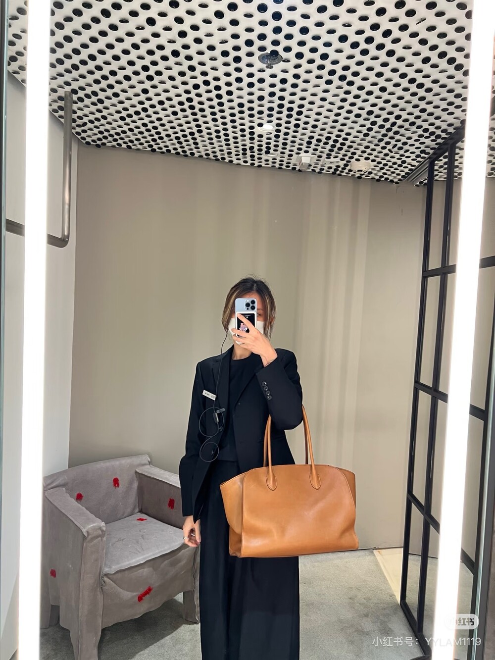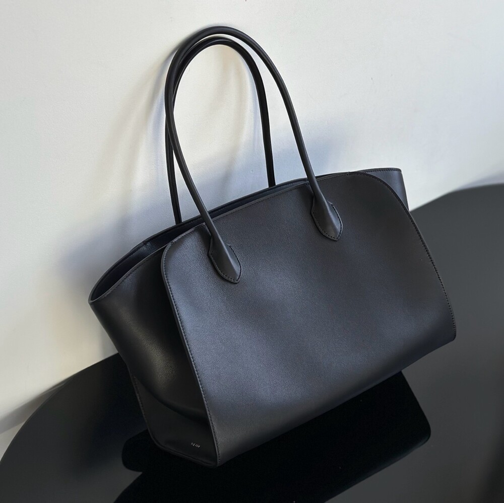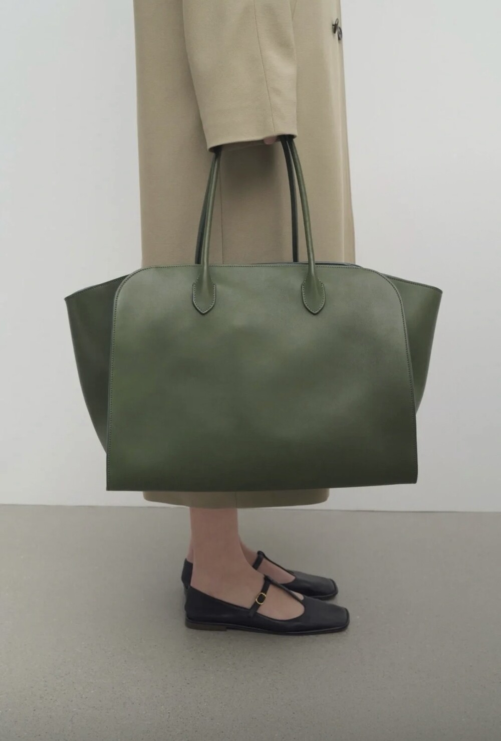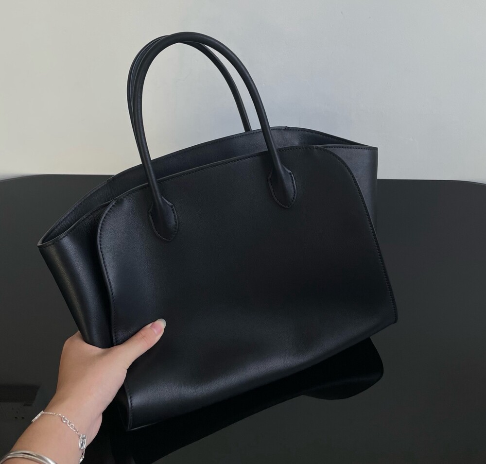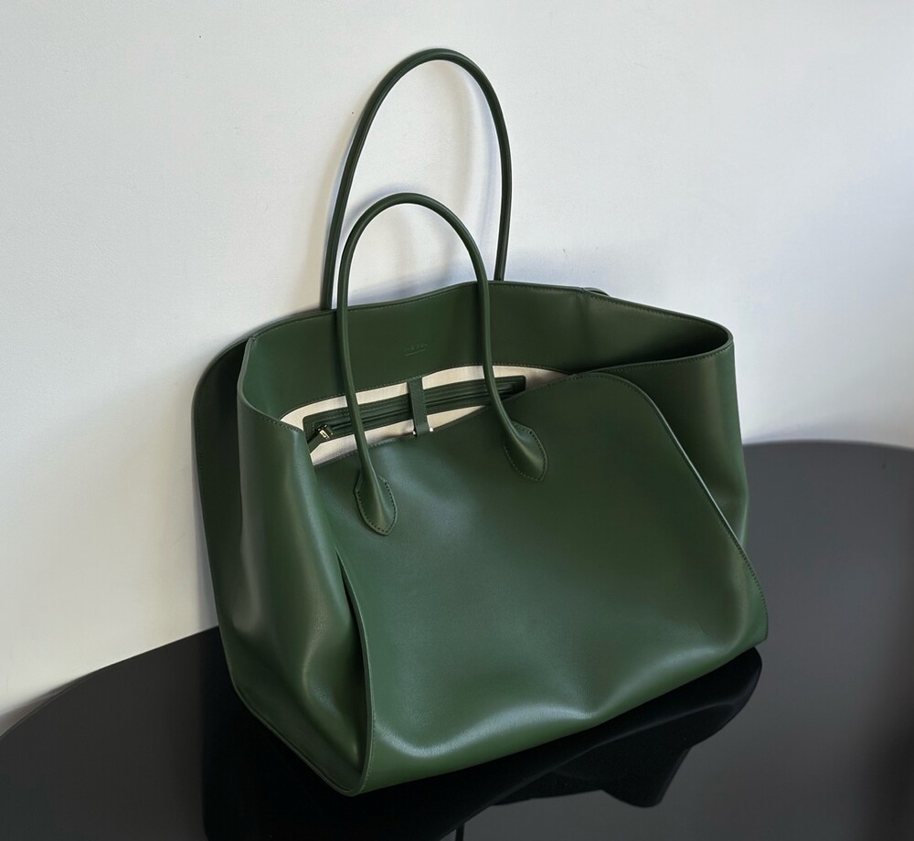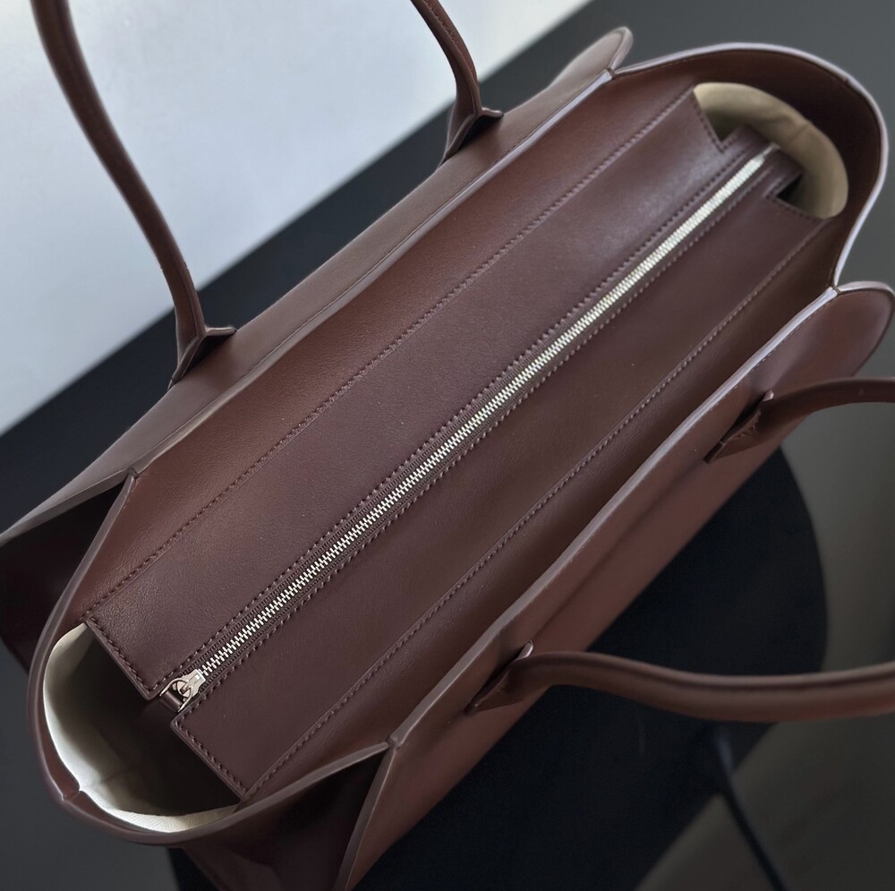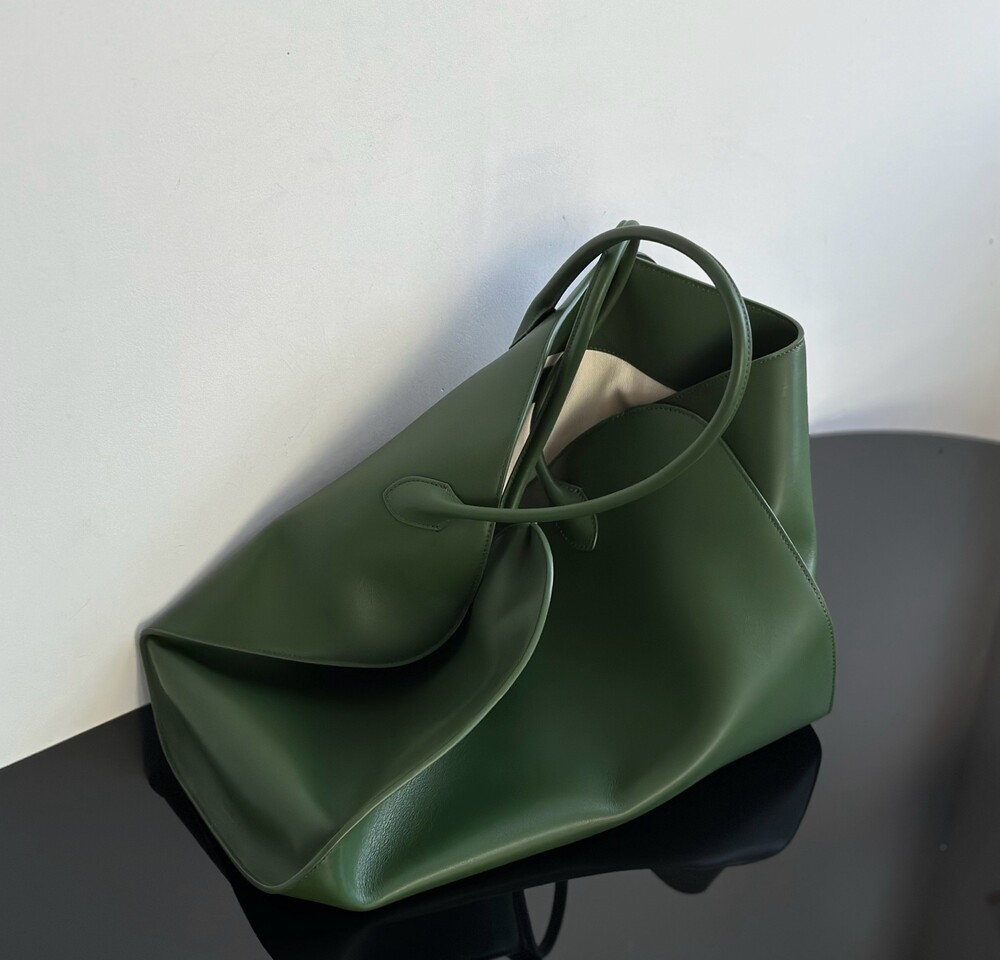 광택 마감된 새들 가죽 소재의 소프트 스트럭처 토트 백으로, 튜브형 핸들과 거싯 디테일의 옆면 패널이 특징입니다.