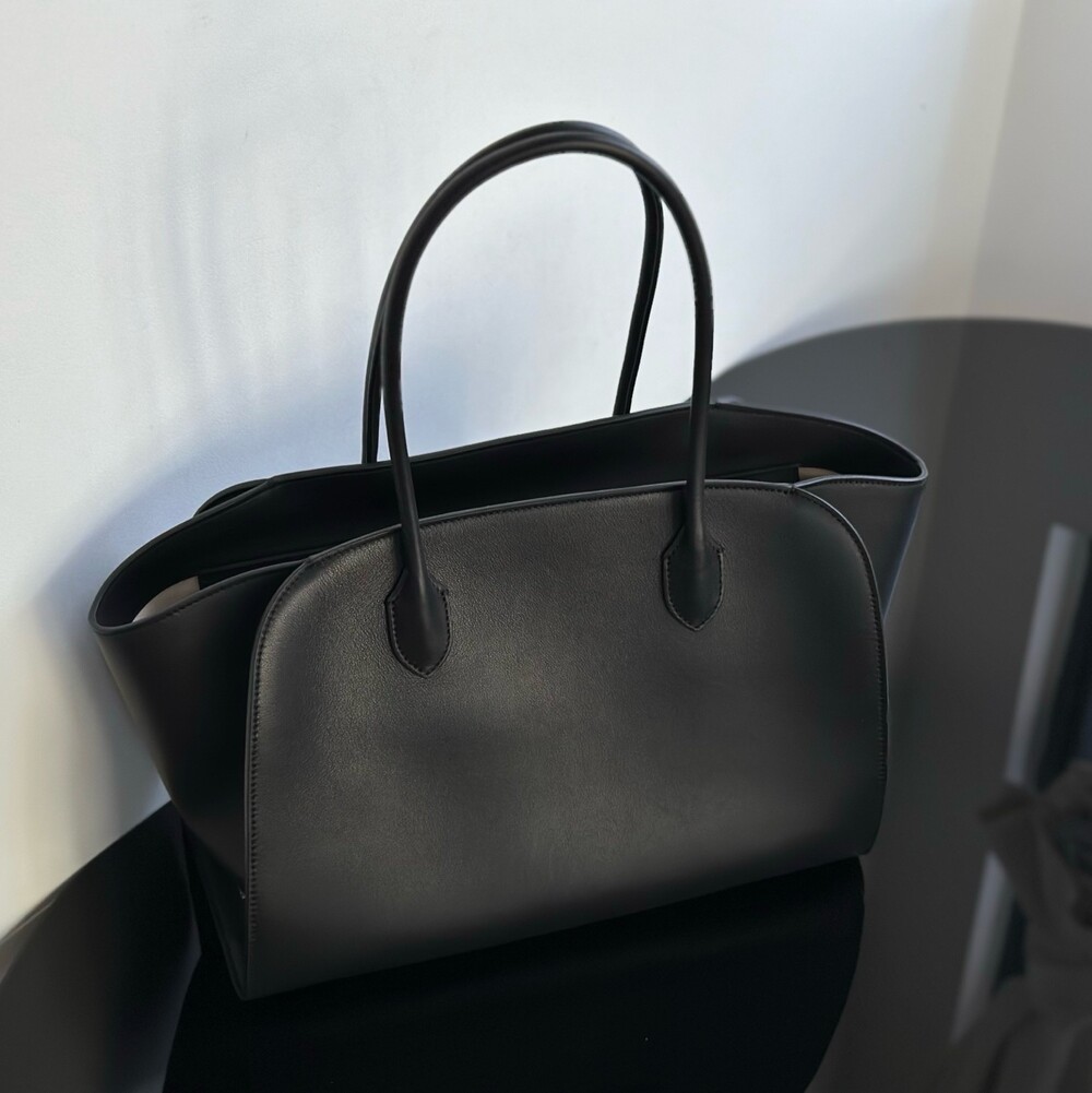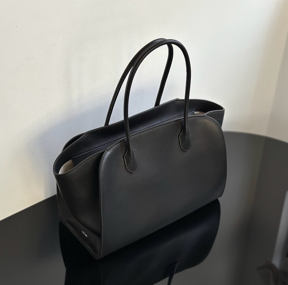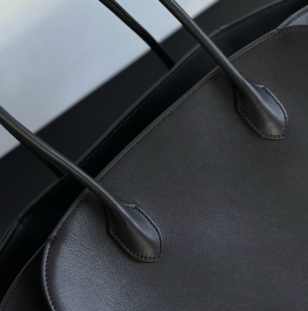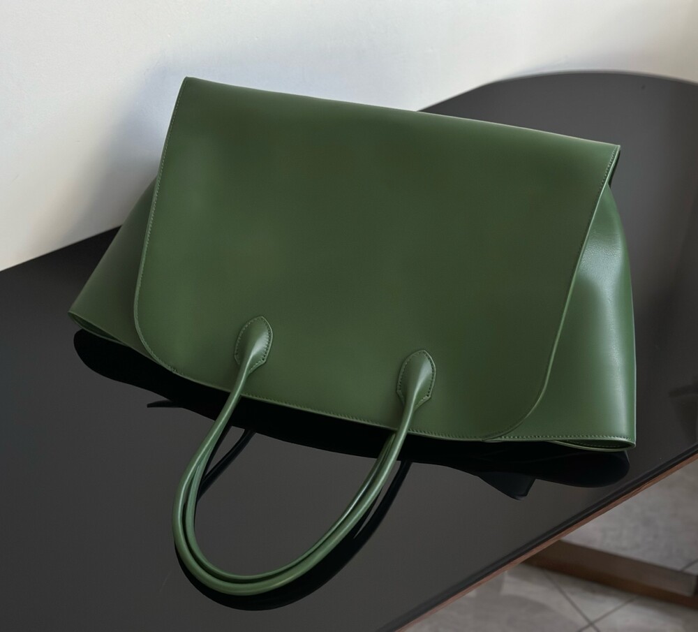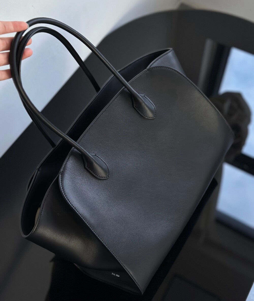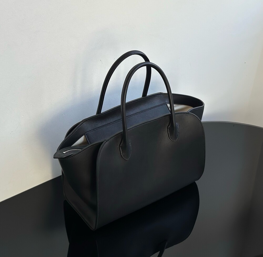 광택 마감된 새들 가죽 소재의 소프트 스트럭처 토트 백으로, 튜브형 핸들과 거싯 디테일의 옆면 패널이 특징입니다.