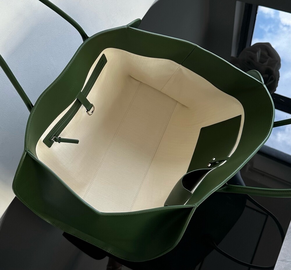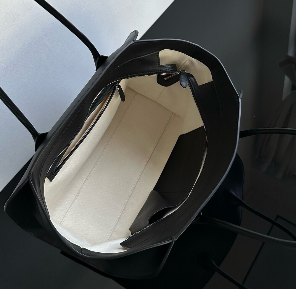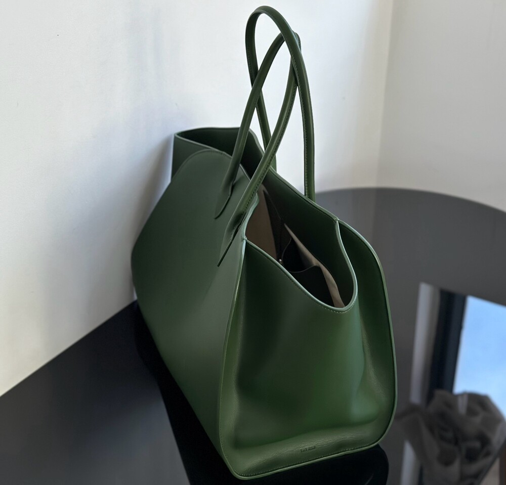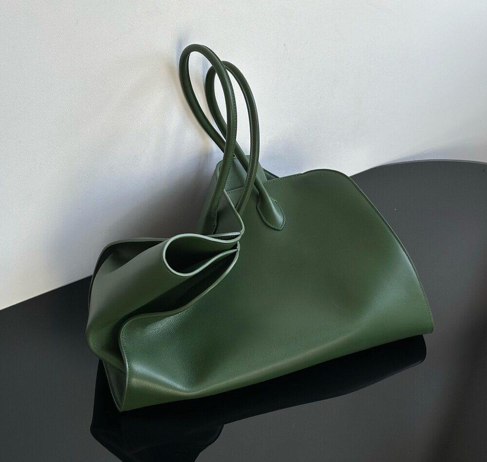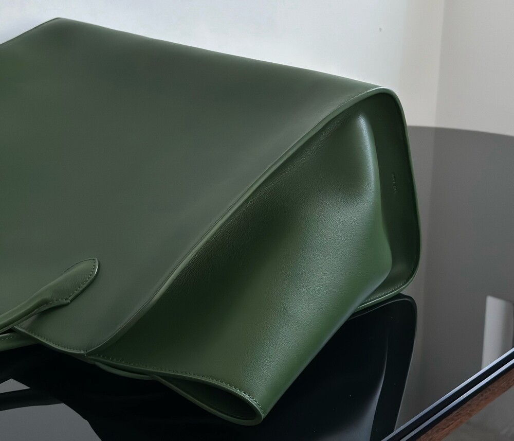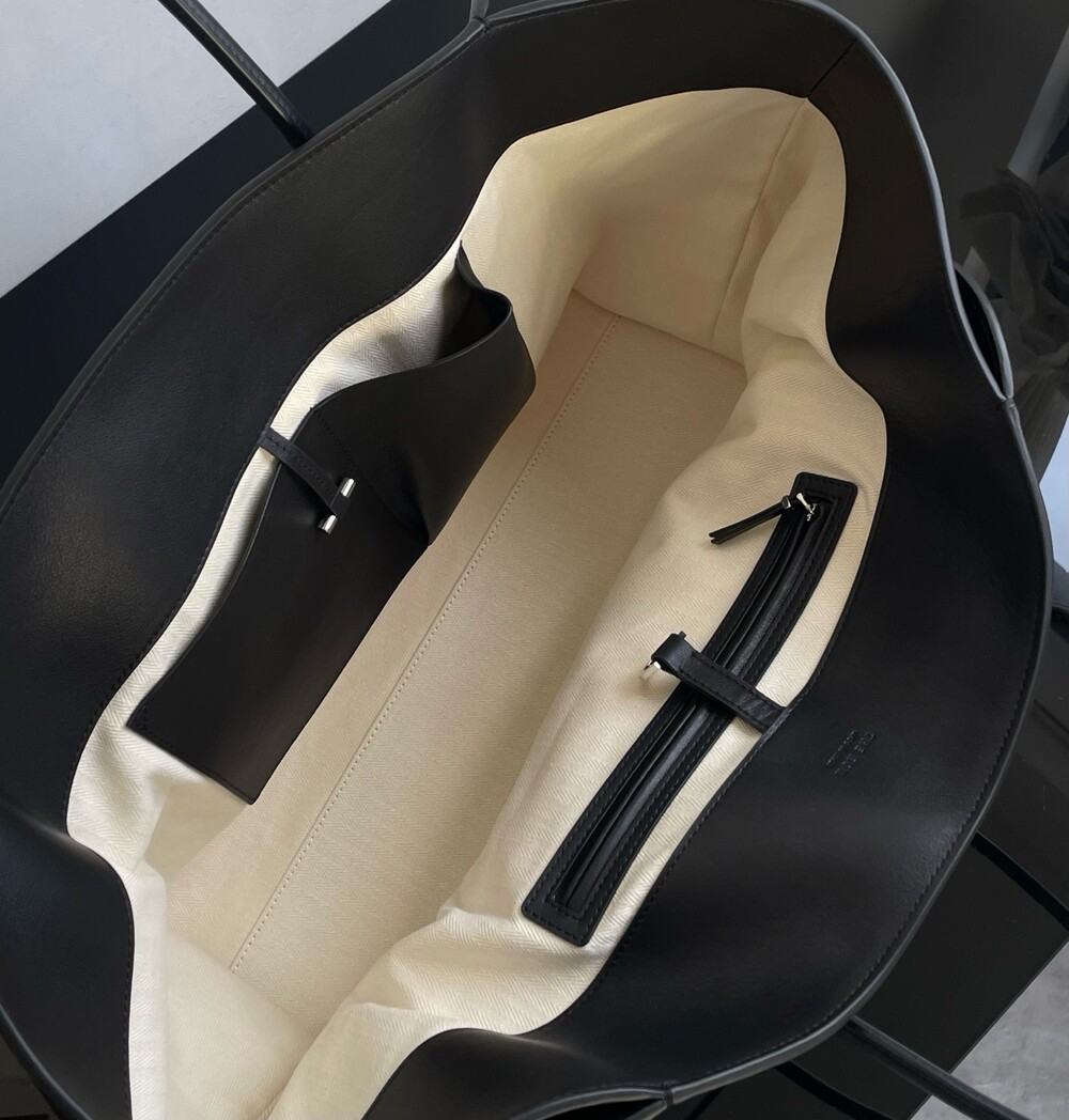 광택 마감된 새들 가죽 소재의 소프트 스트럭처 토트 백으로, 튜브형 핸들과 거싯 디테일의 옆면 패널이 특징입니다.