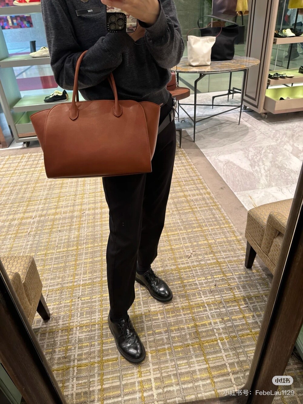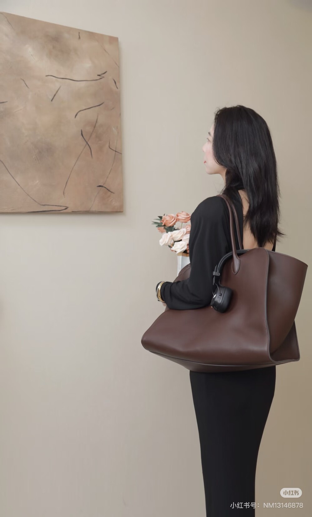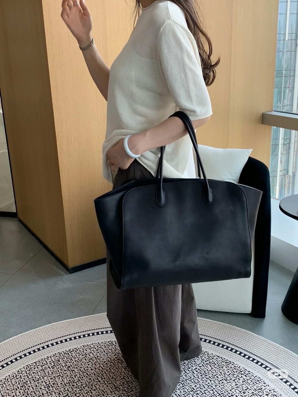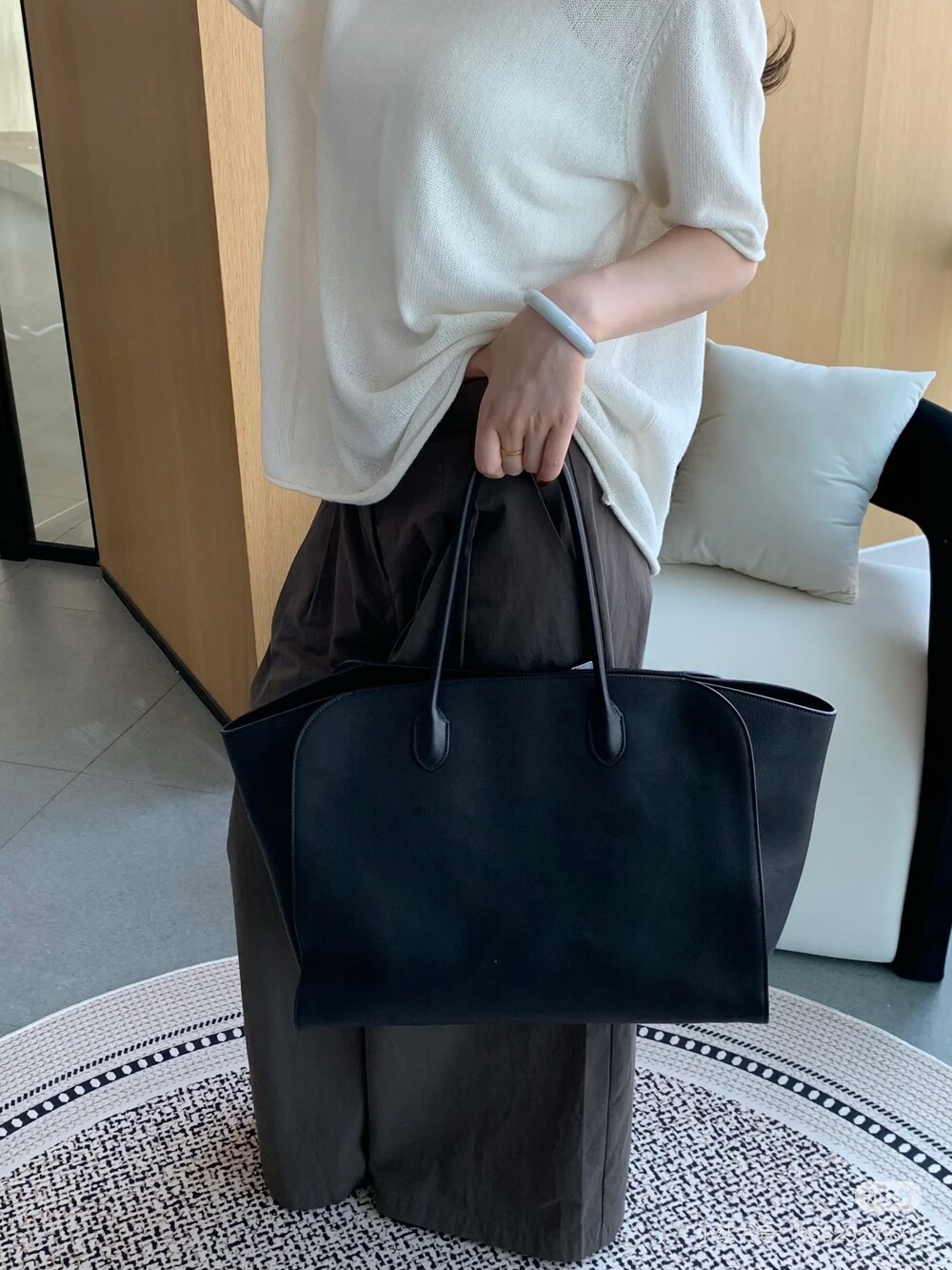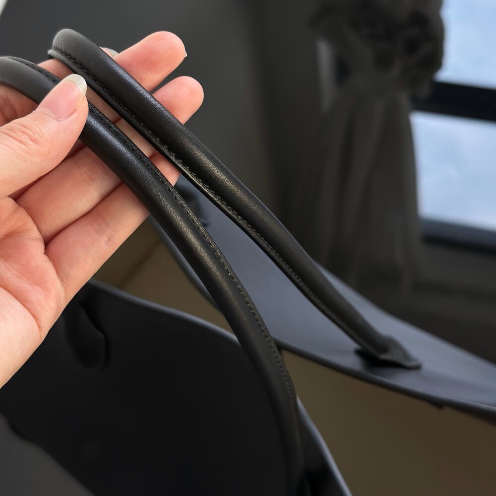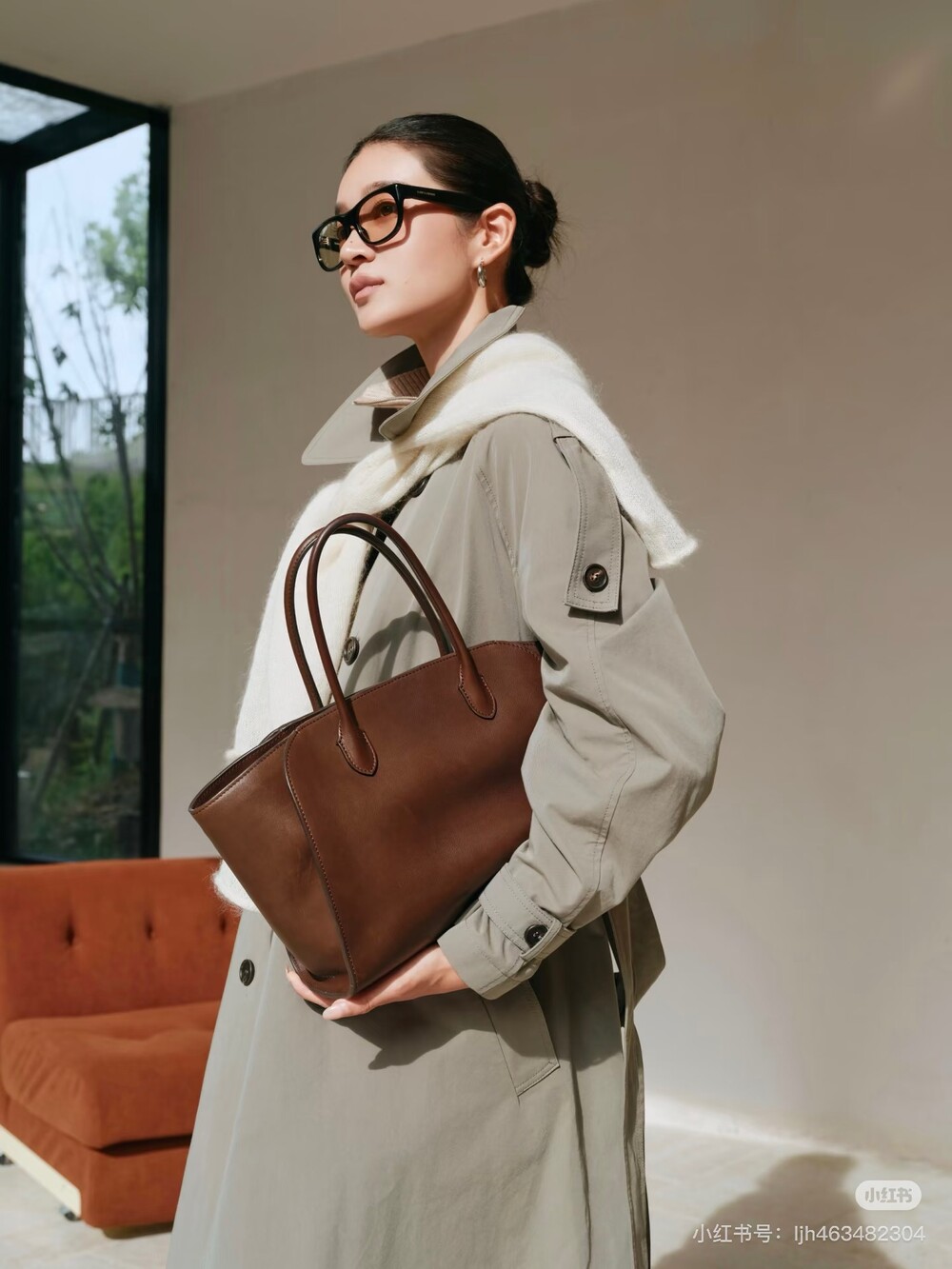 광택 마감된 새들 가죽 소재의 소프트 스트럭처 토트 백으로, 튜브형 핸들과 거싯 디테일의 옆면 패널이 특징입니다.