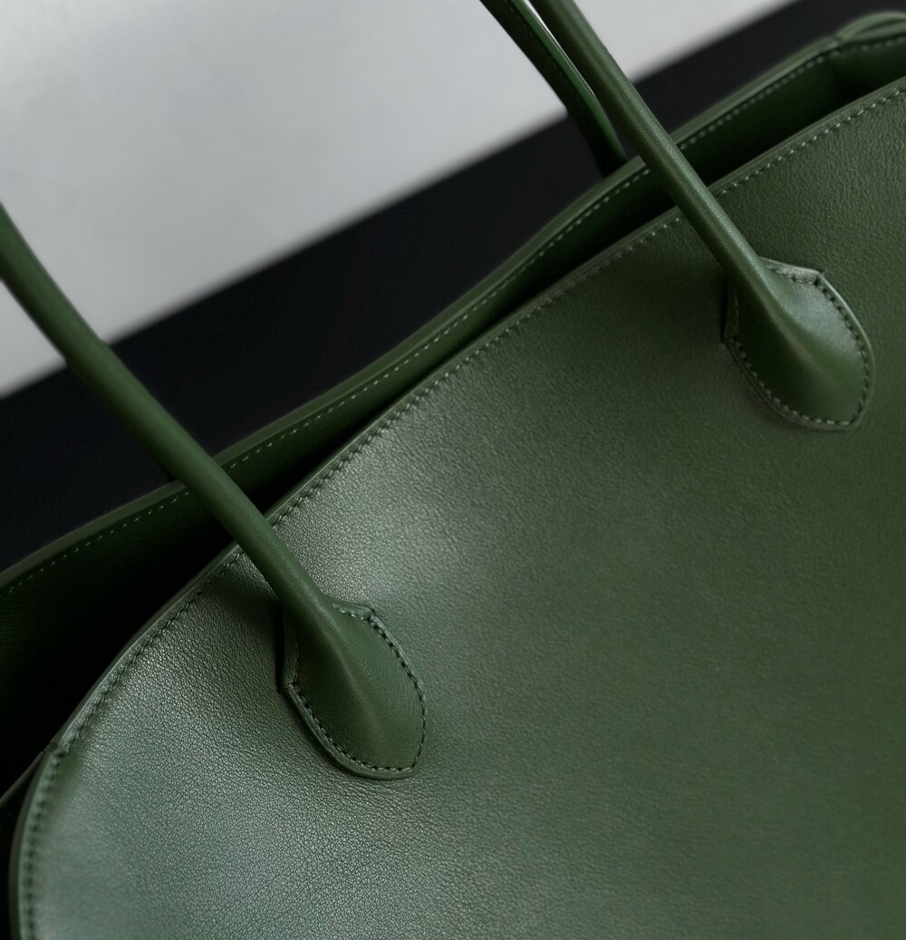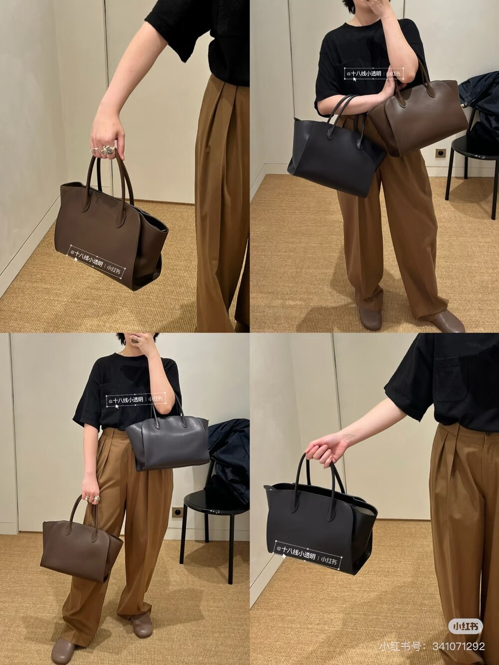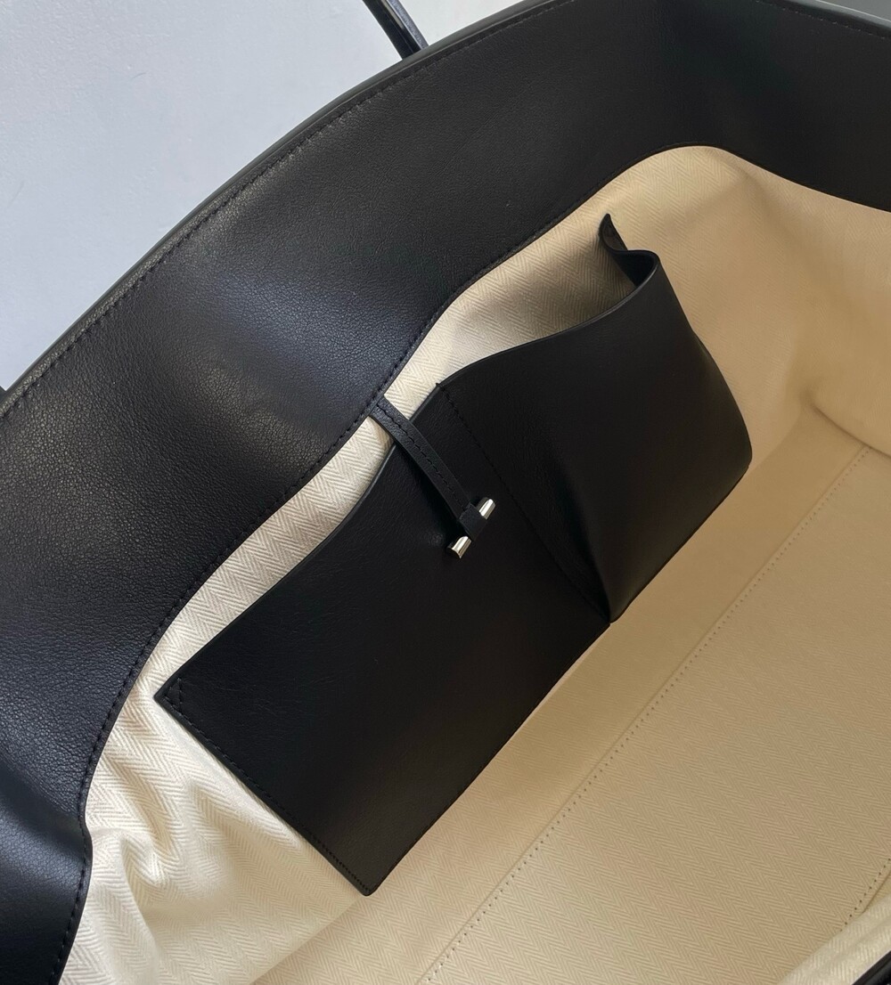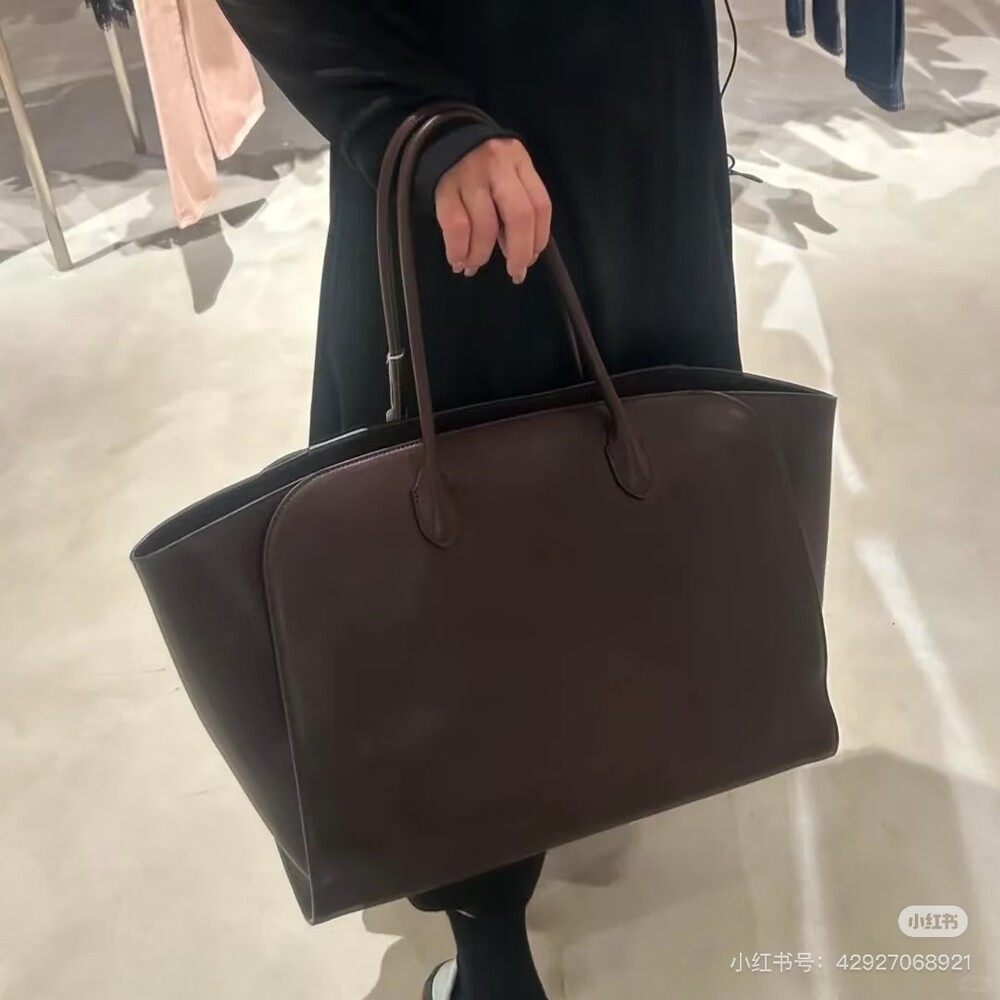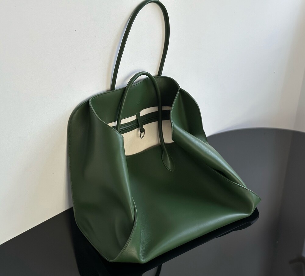 광택 마감된 새들 가죽 소재의 소프트 스트럭처 토트 백으로, 튜브형 핸들과 거싯 디테일의 옆면 패널이 특징입니다.