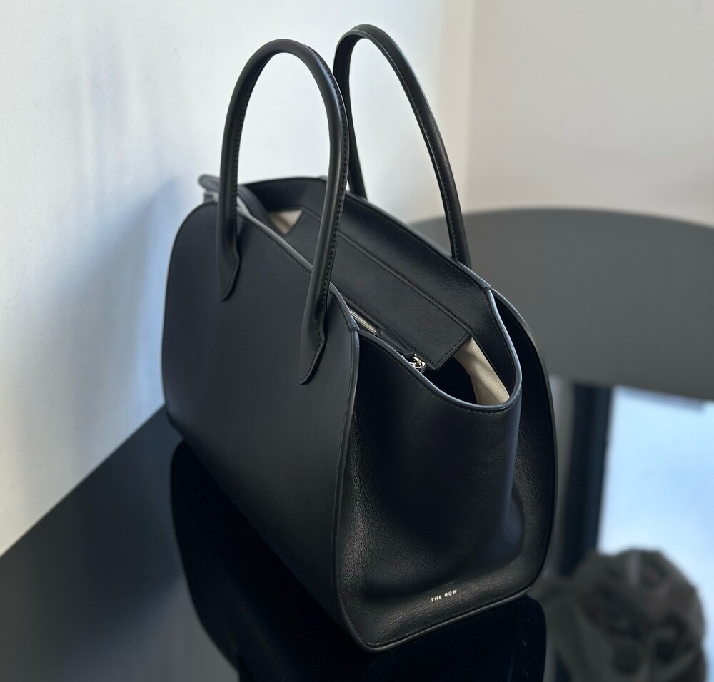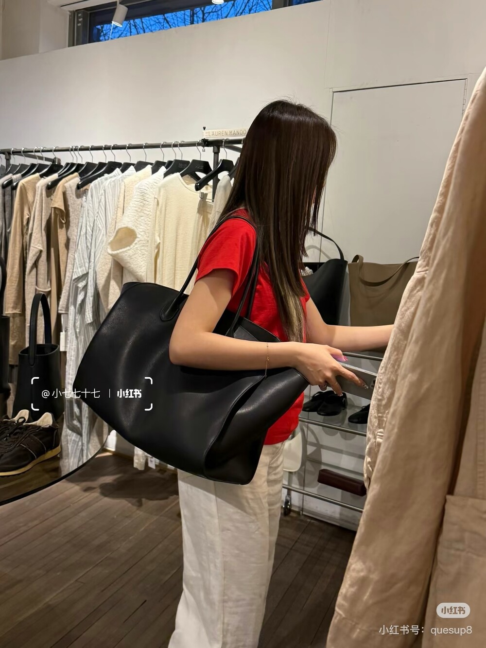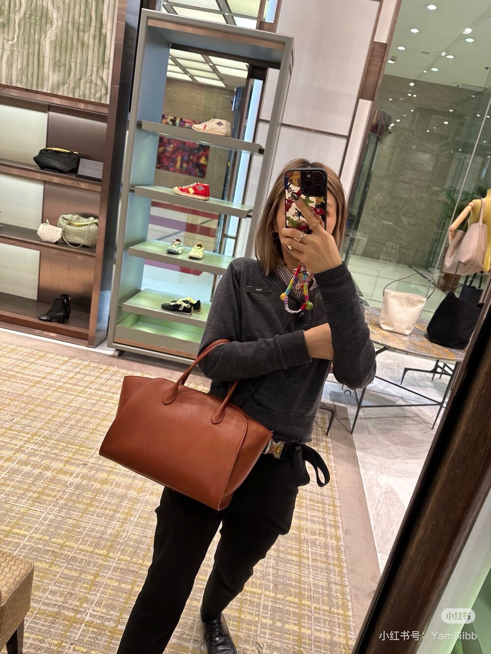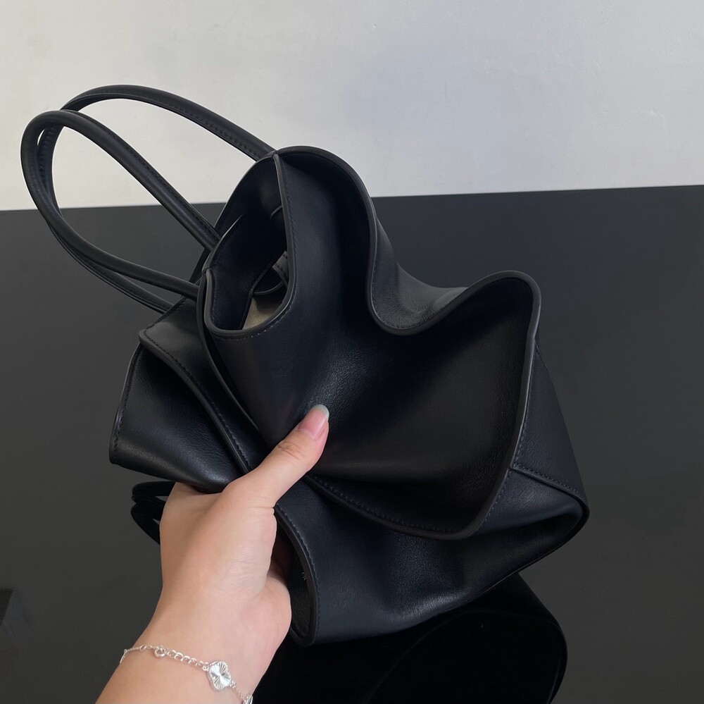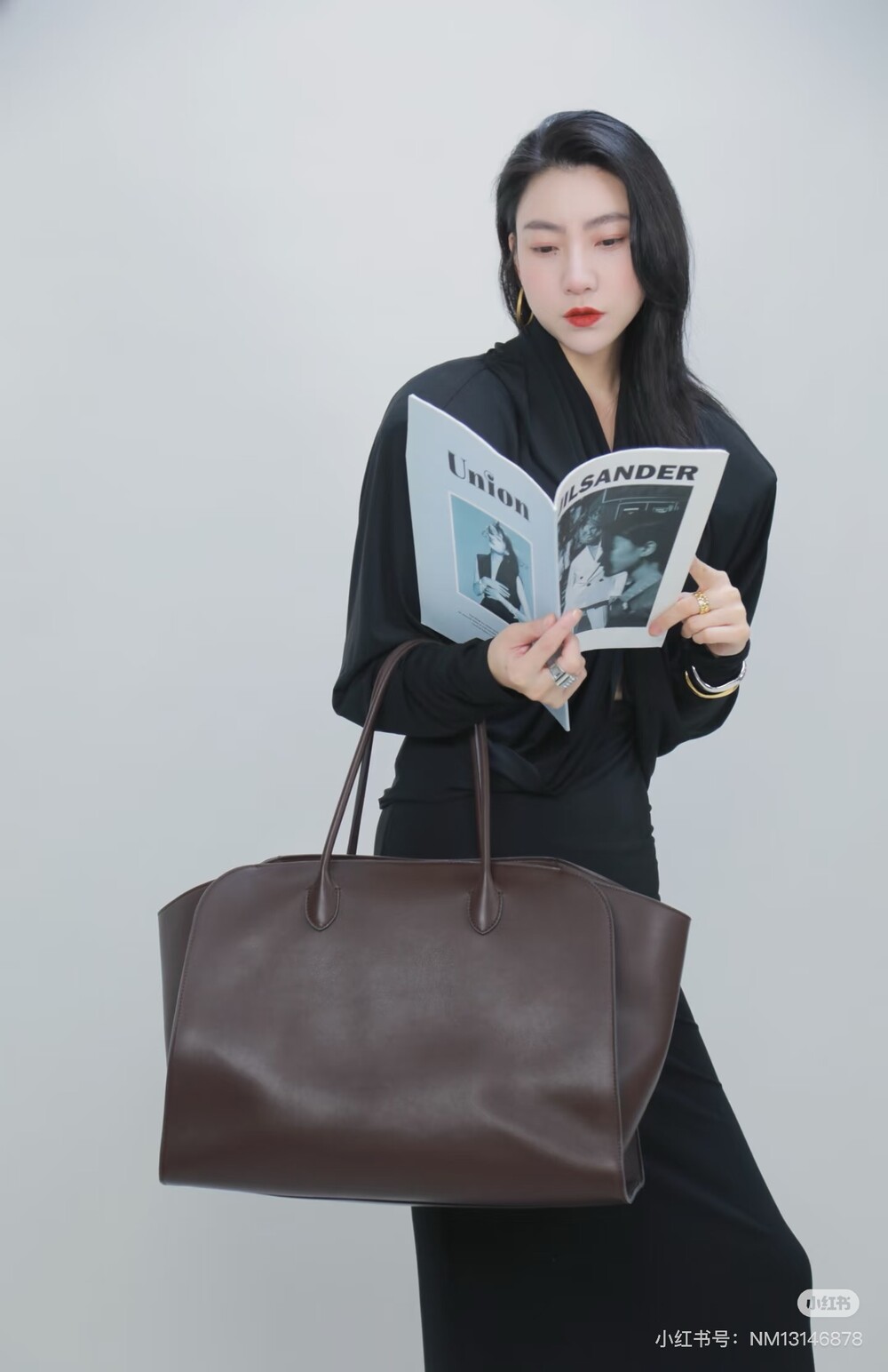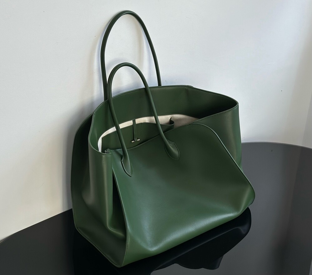 광택 마감된 새들 가죽 소재의 소프트 스트럭처 토트 백으로, 튜브형 핸들과 거싯 디테일의 옆면 패널이 특징입니다.