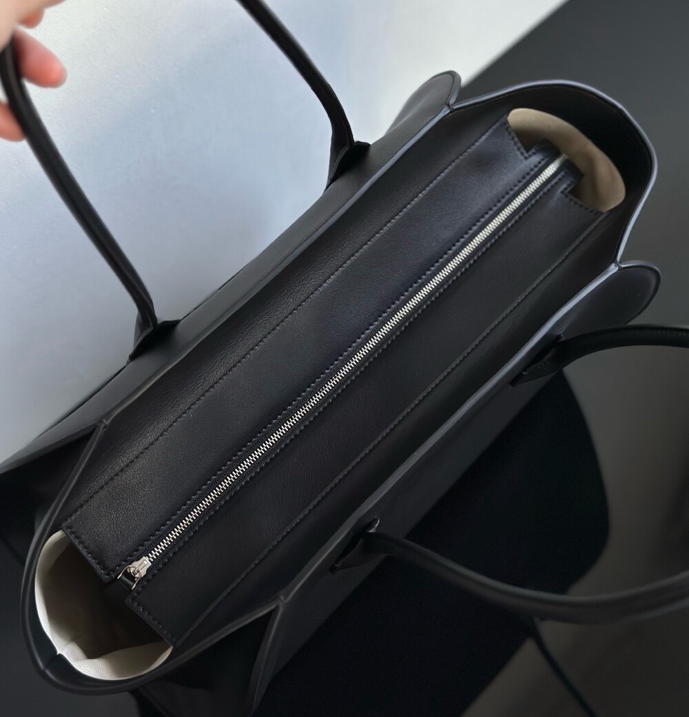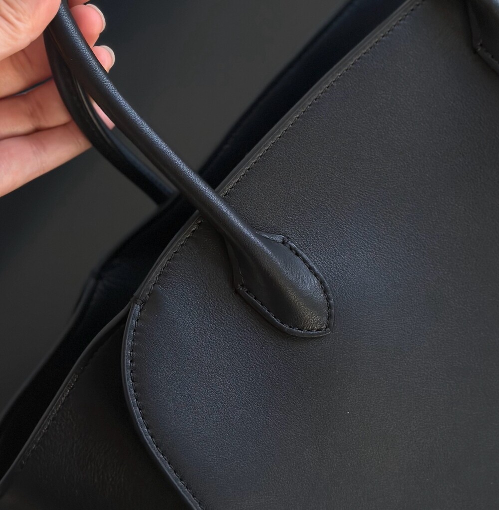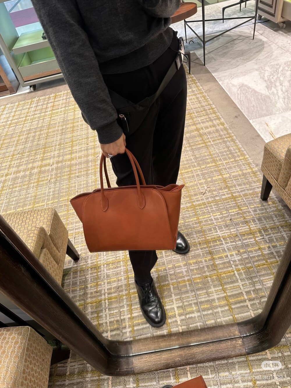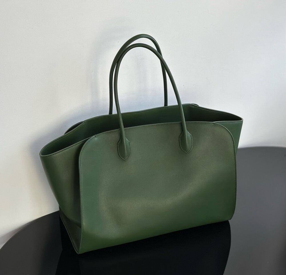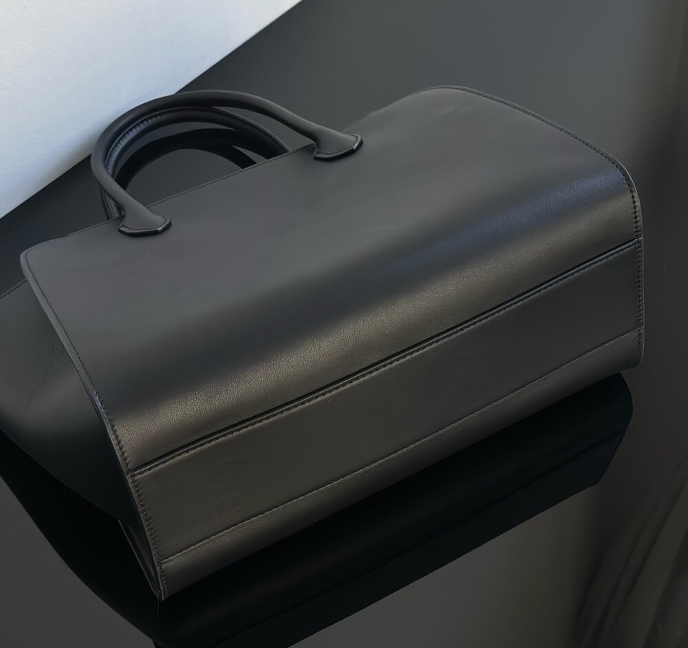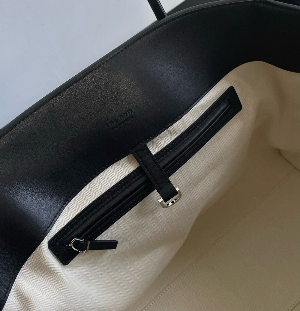 광택 마감된 새들 가죽 소재의 소프트 스트럭처 토트 백으로, 튜브형 핸들과 거싯 디테일의 옆면 패널이 특징입니다.