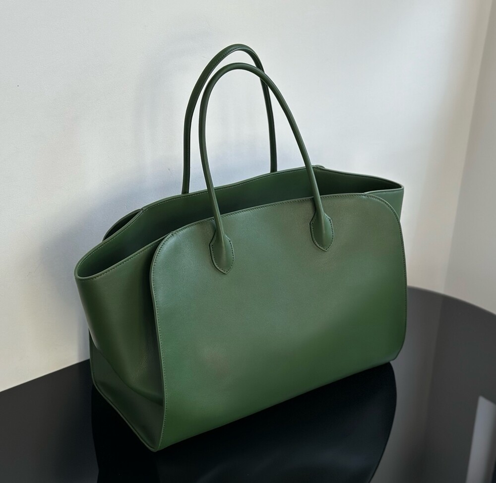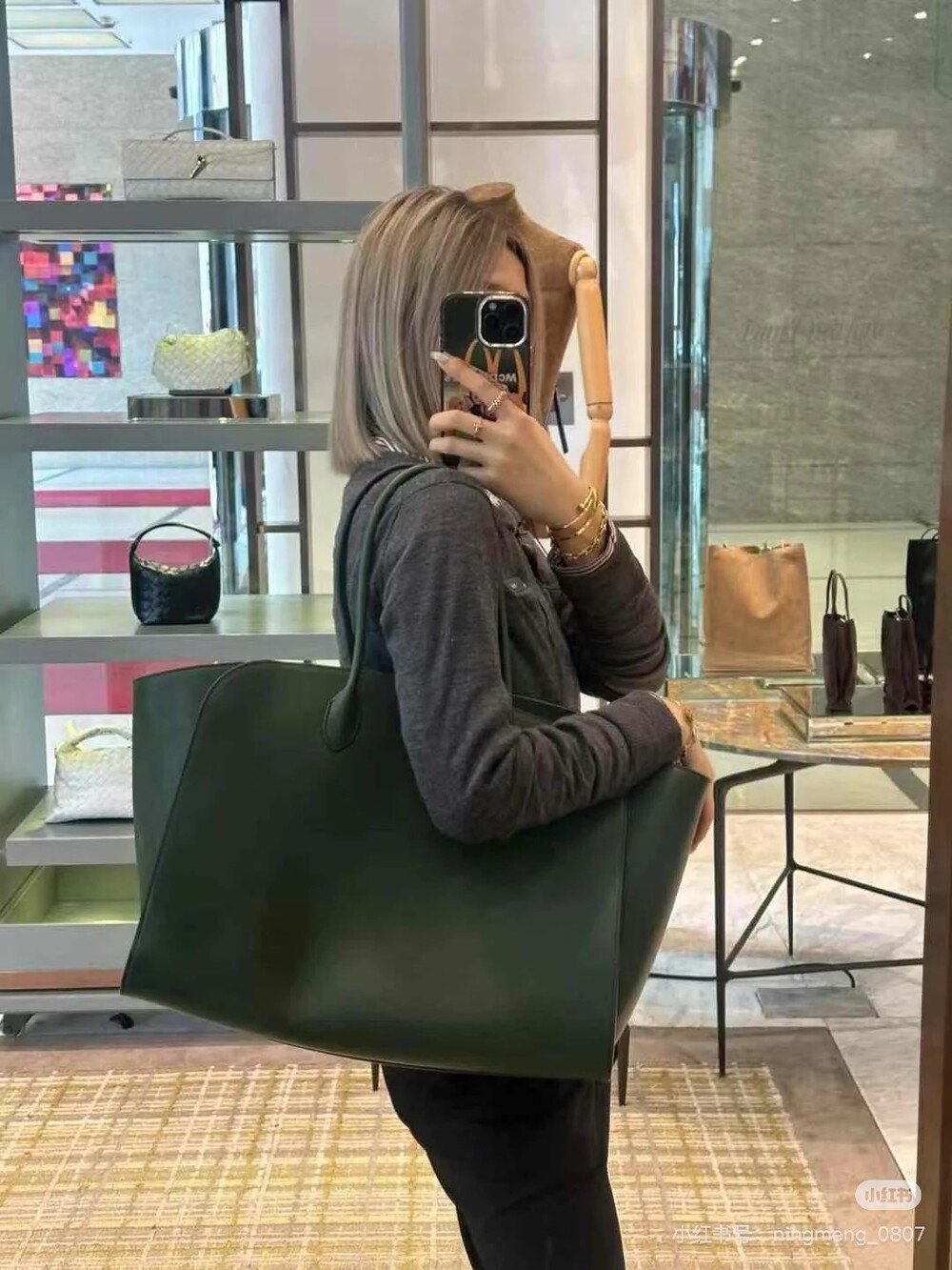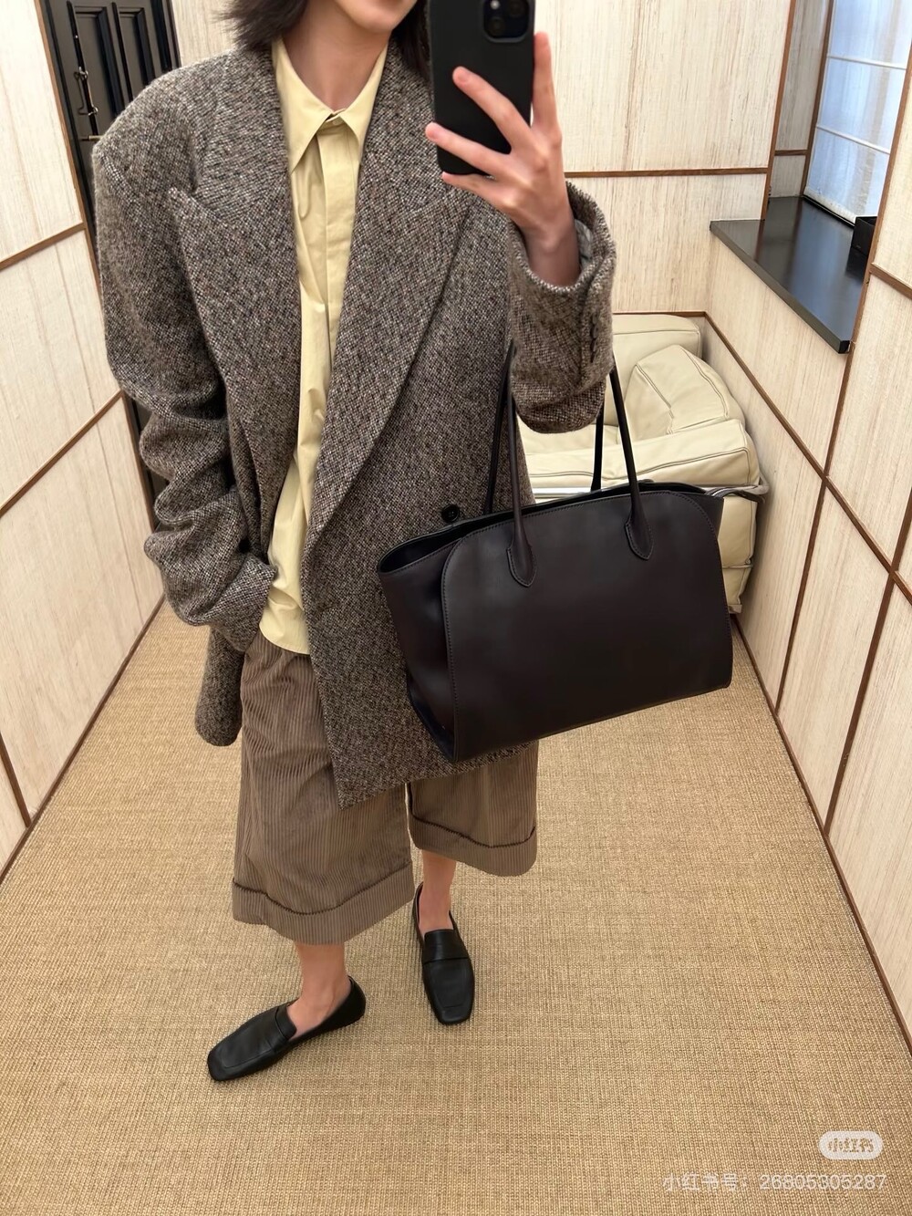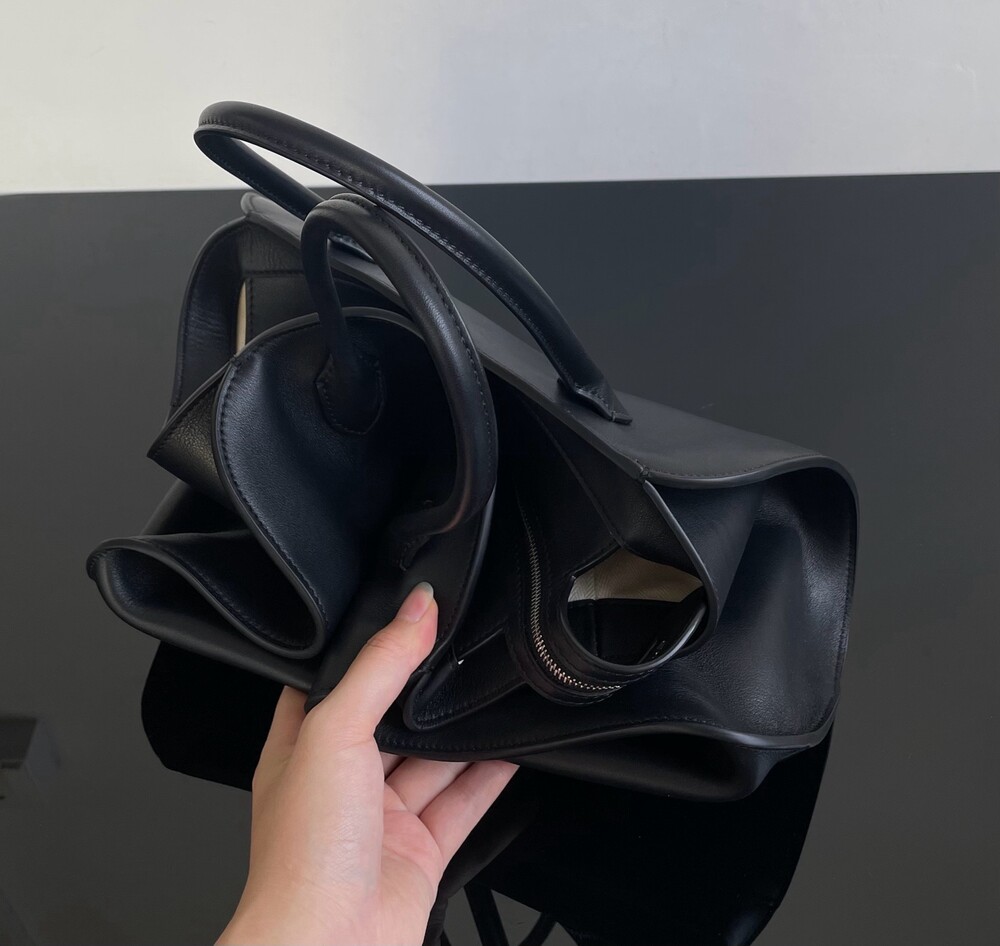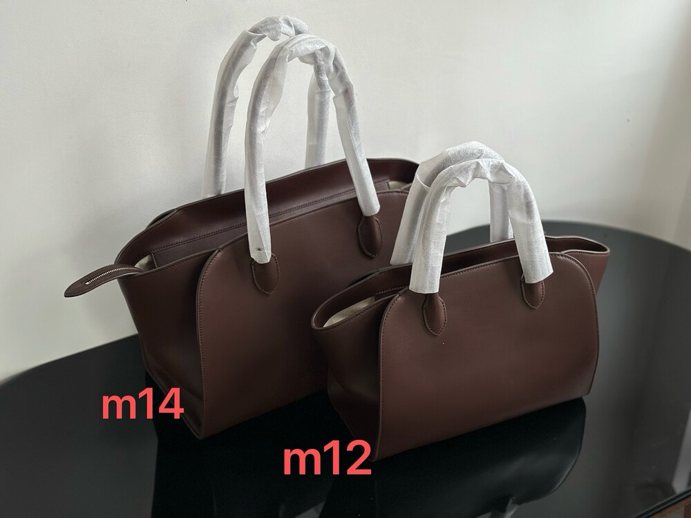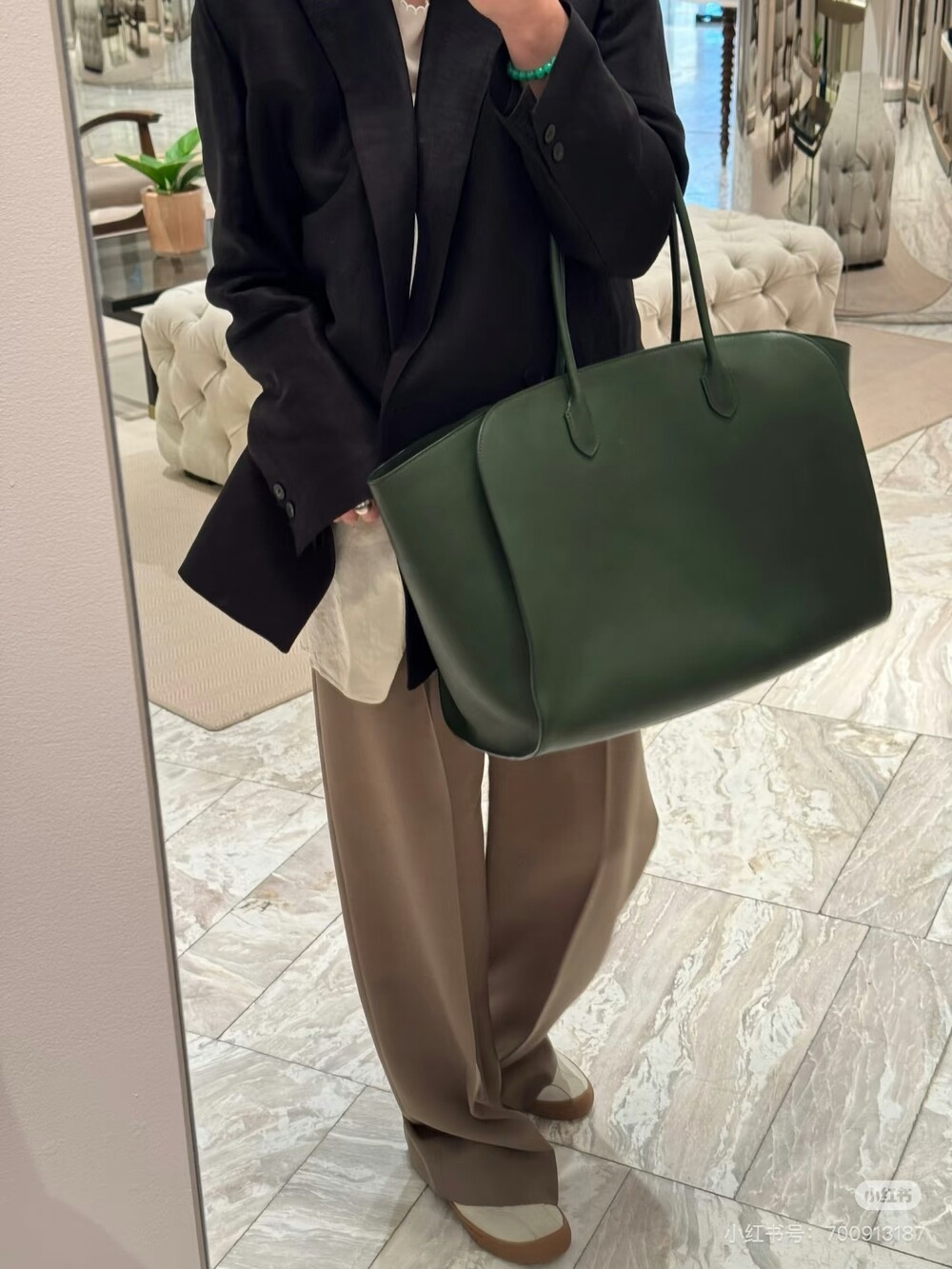 광택 마감된 새들 가죽 소재의 소프트 스트럭처 토트 백으로, 튜브형 핸들과 거싯 디테일의 옆면 패널이 특징입니다.
