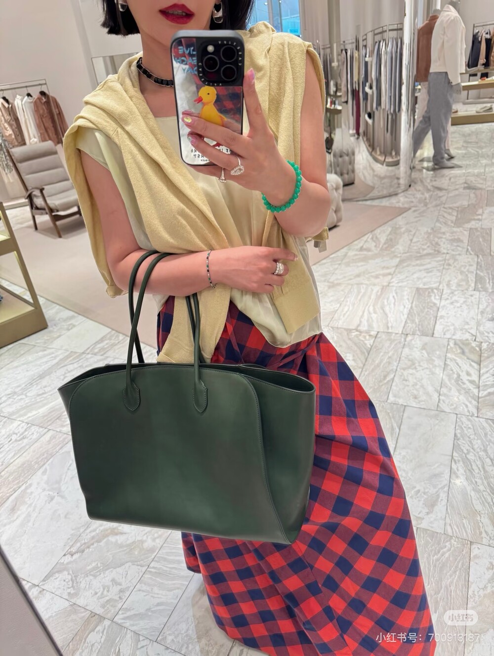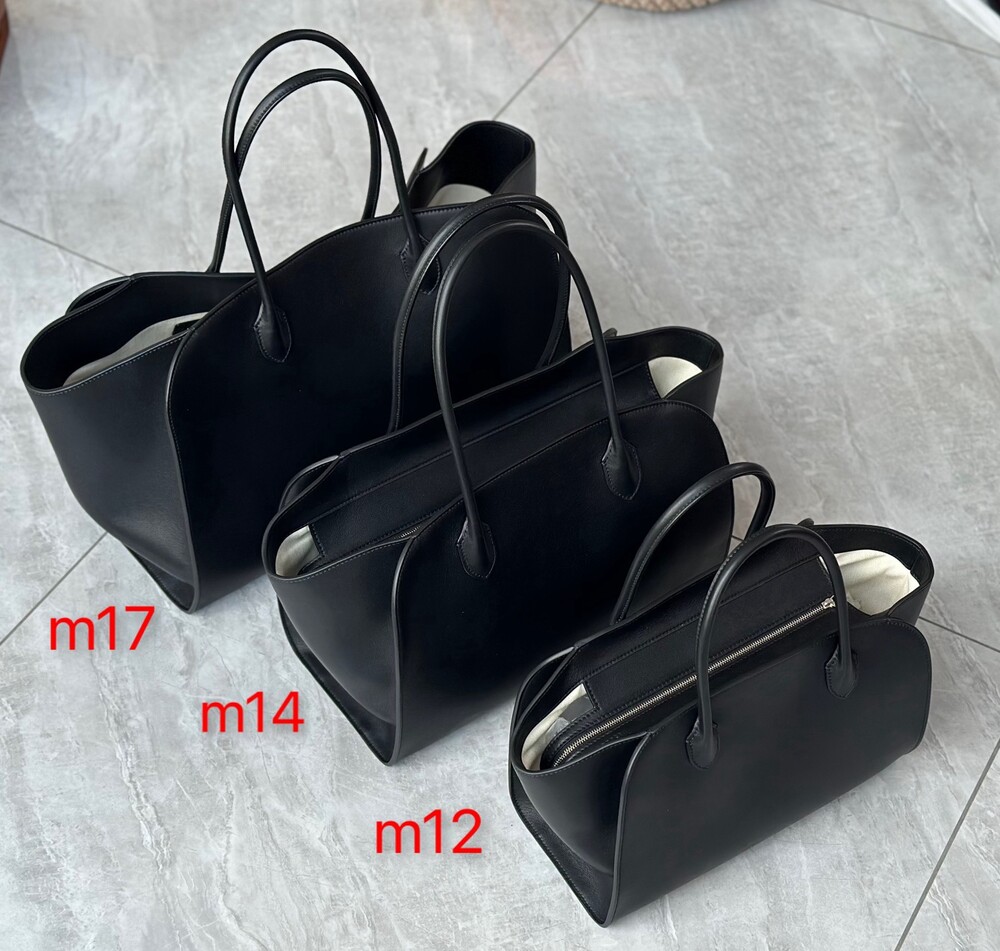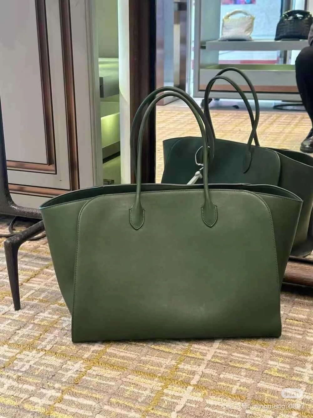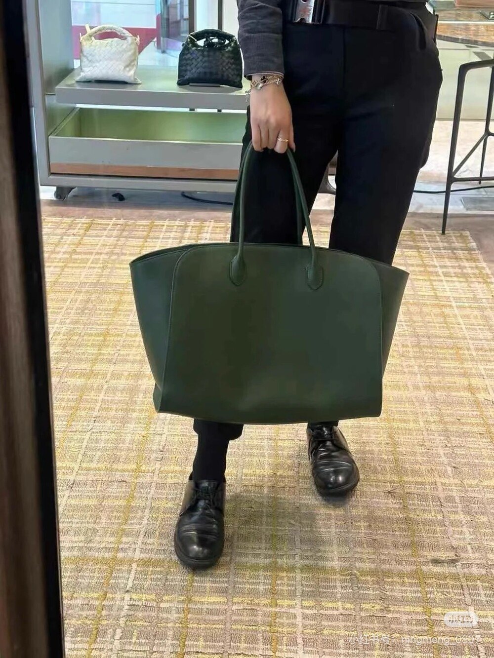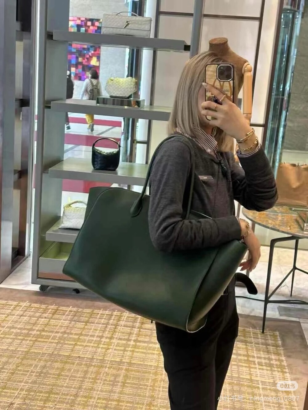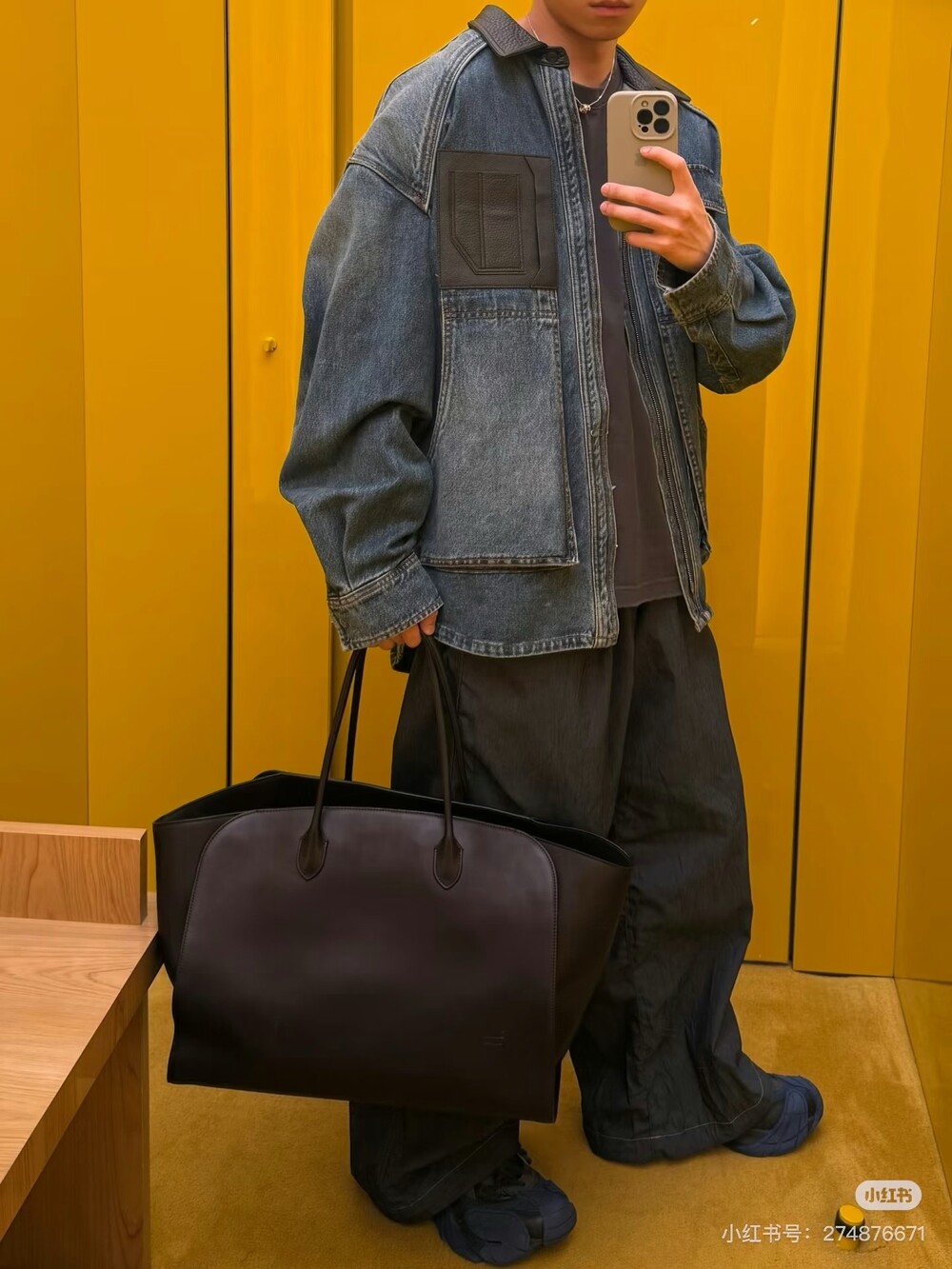 광택 마감된 새들 가죽 소재의 소프트 스트럭처 토트 백으로, 튜브형 핸들과 거싯 디테일의 옆면 패널이 특징입니다.