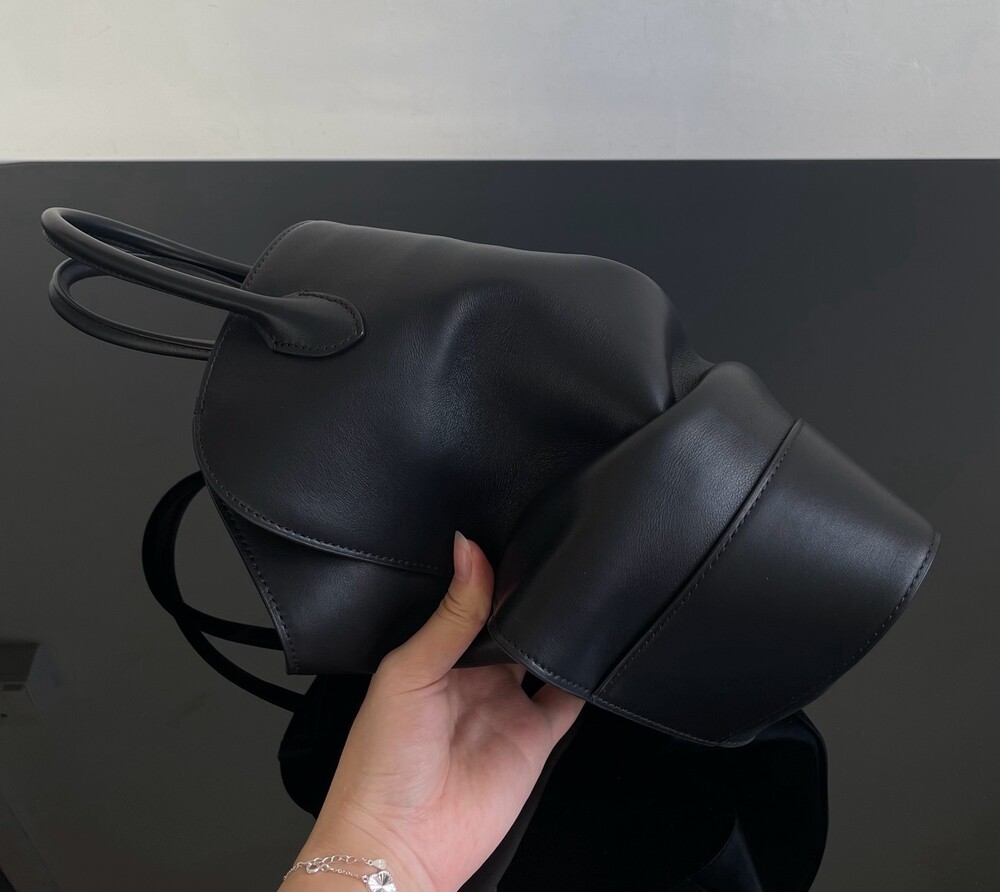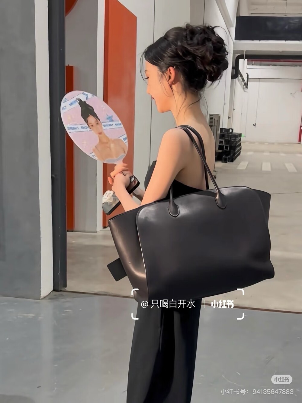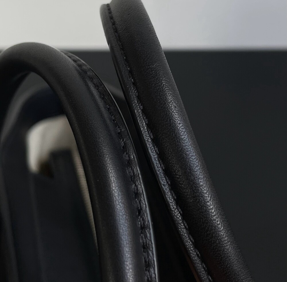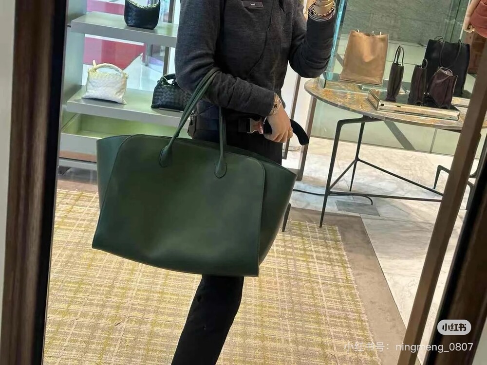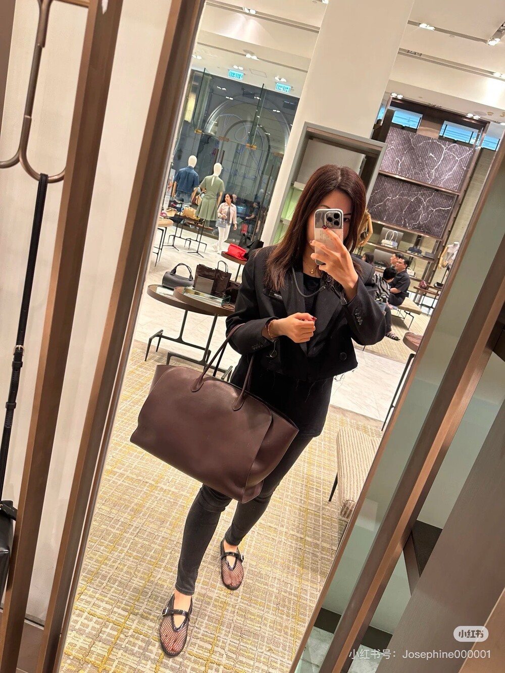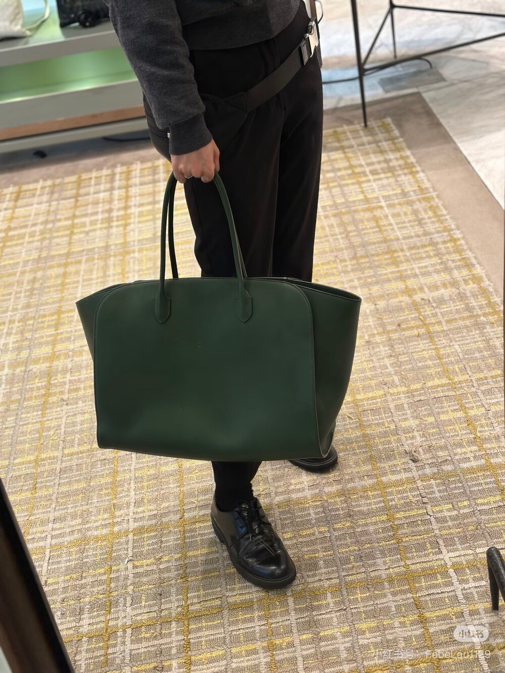 광택 마감된 새들 가죽 소재의 소프트 스트럭처 토트 백으로, 튜브형 핸들과 거싯 디테일의 옆면 패널이 특징입니다.