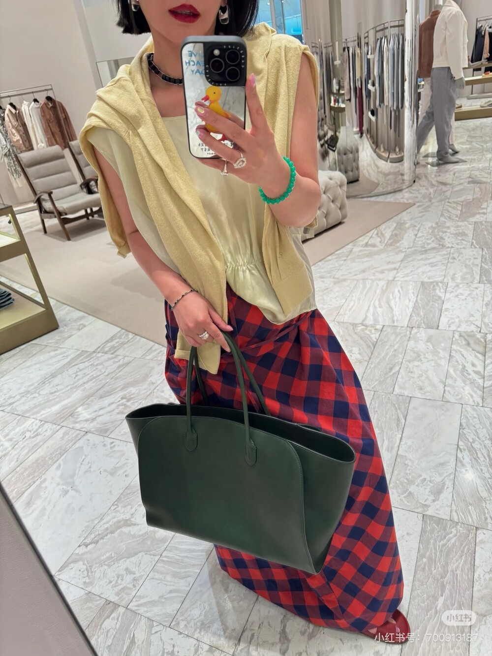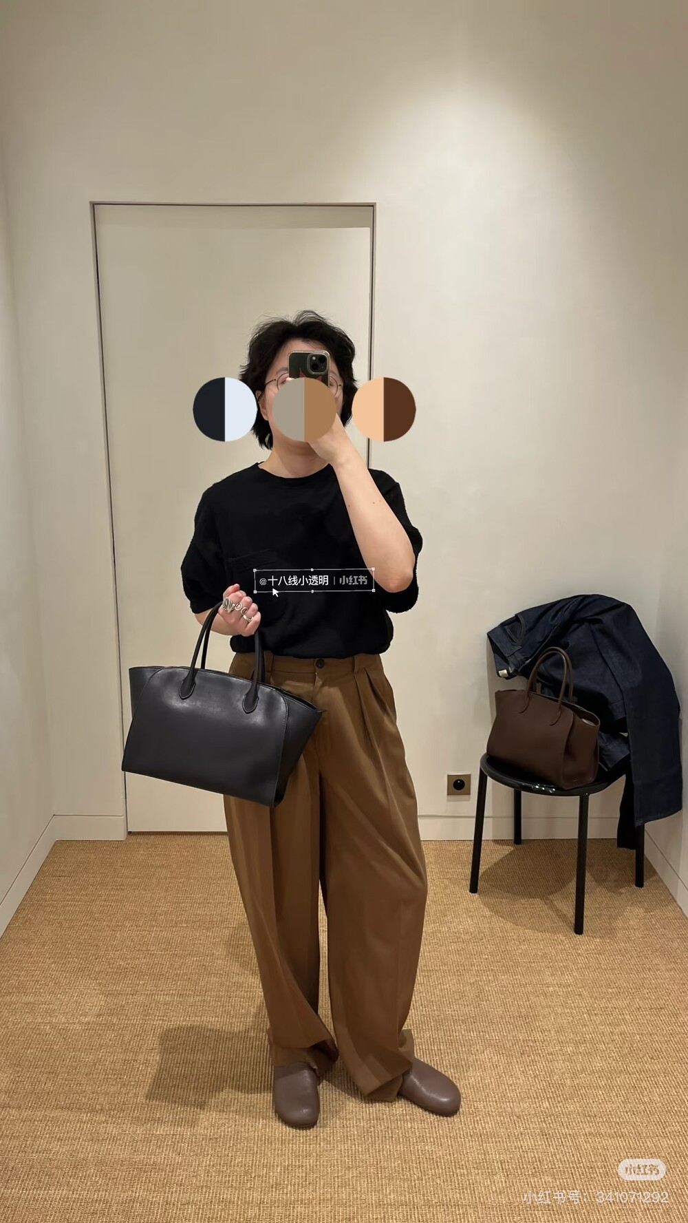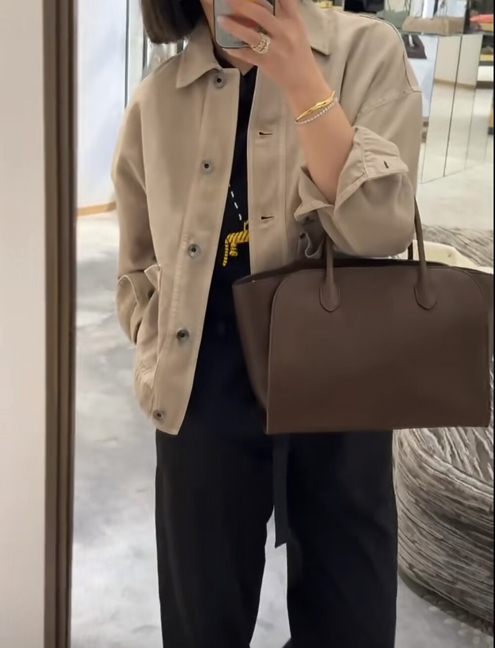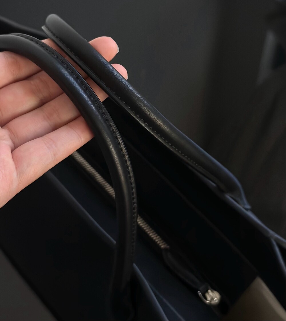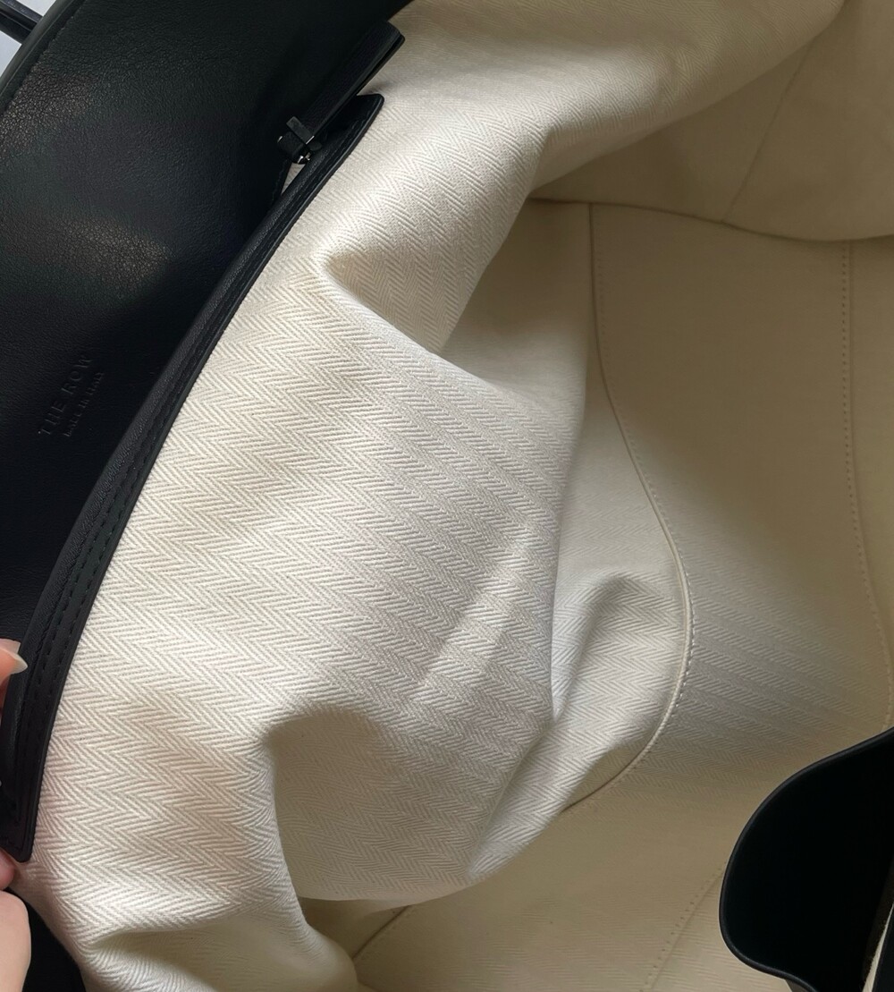광택 마감된 새들 가죽 소재의 소프트 스트럭처 토트 백으로, 튜브형 핸들과 거싯 디테일의 옆면 패널이 특징입니다.