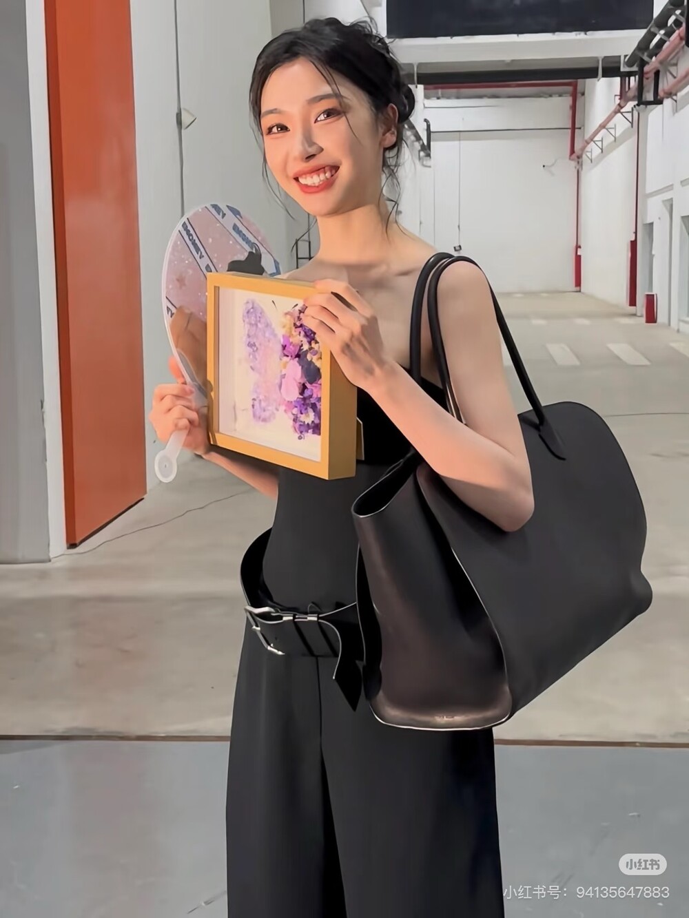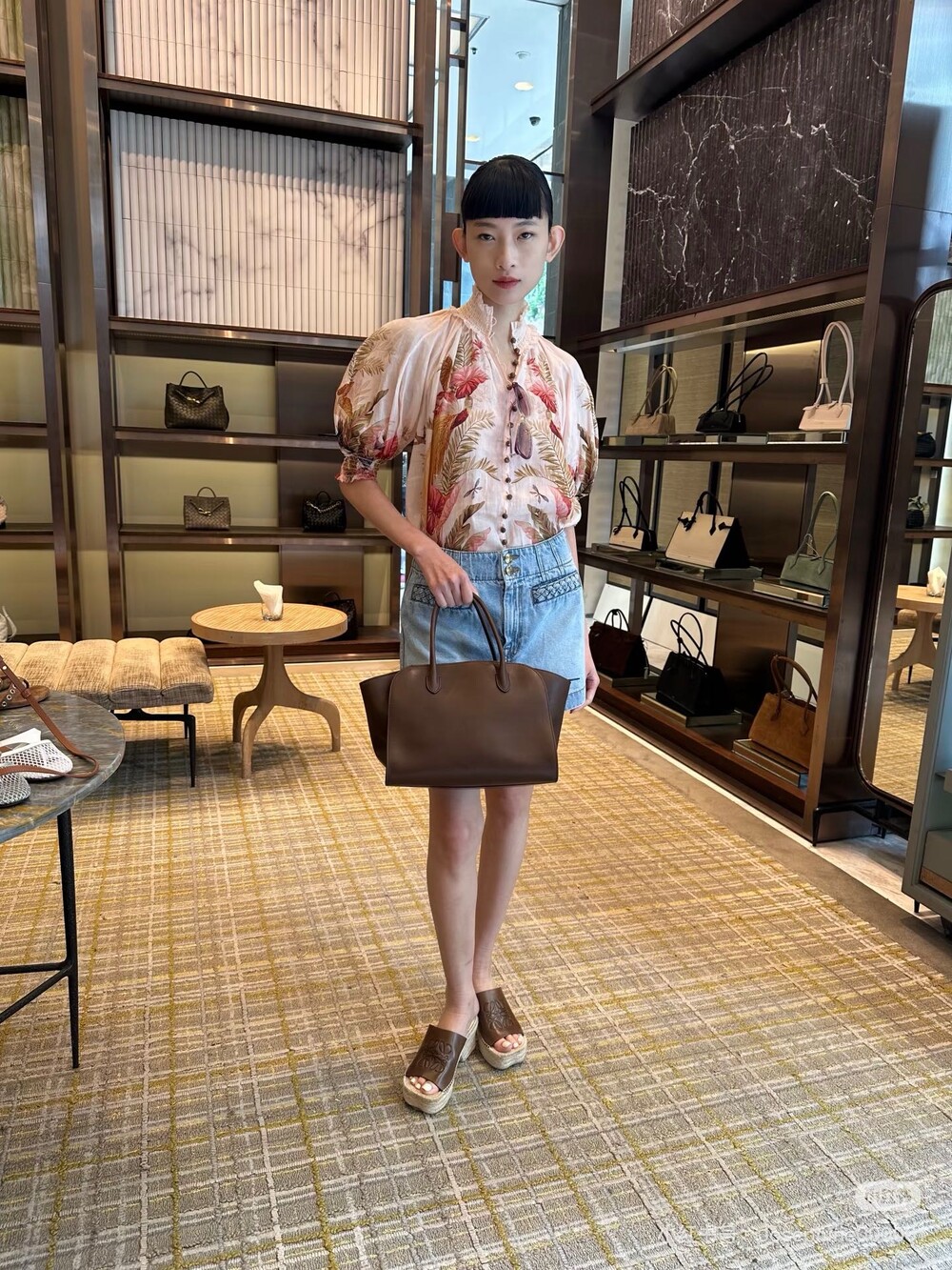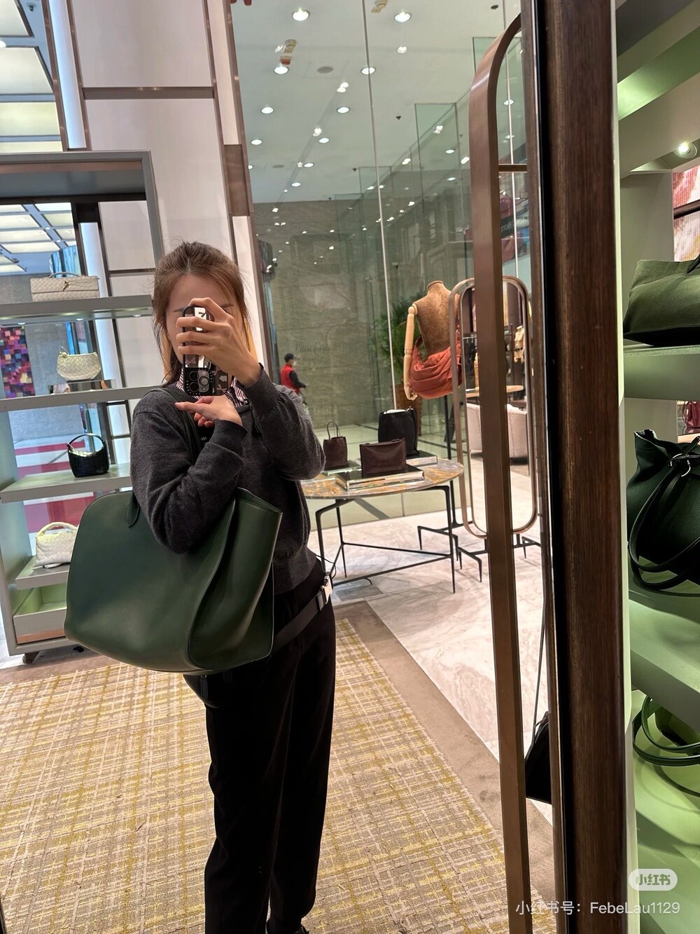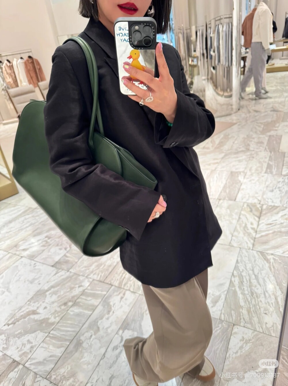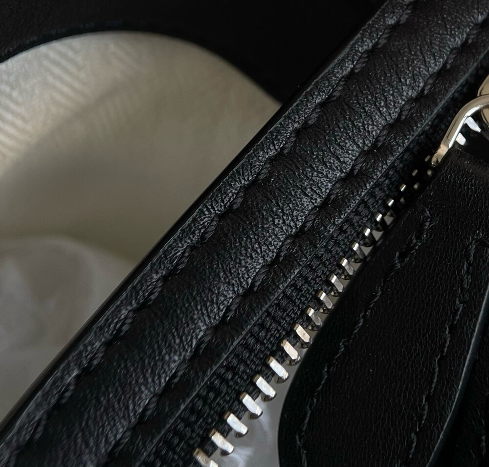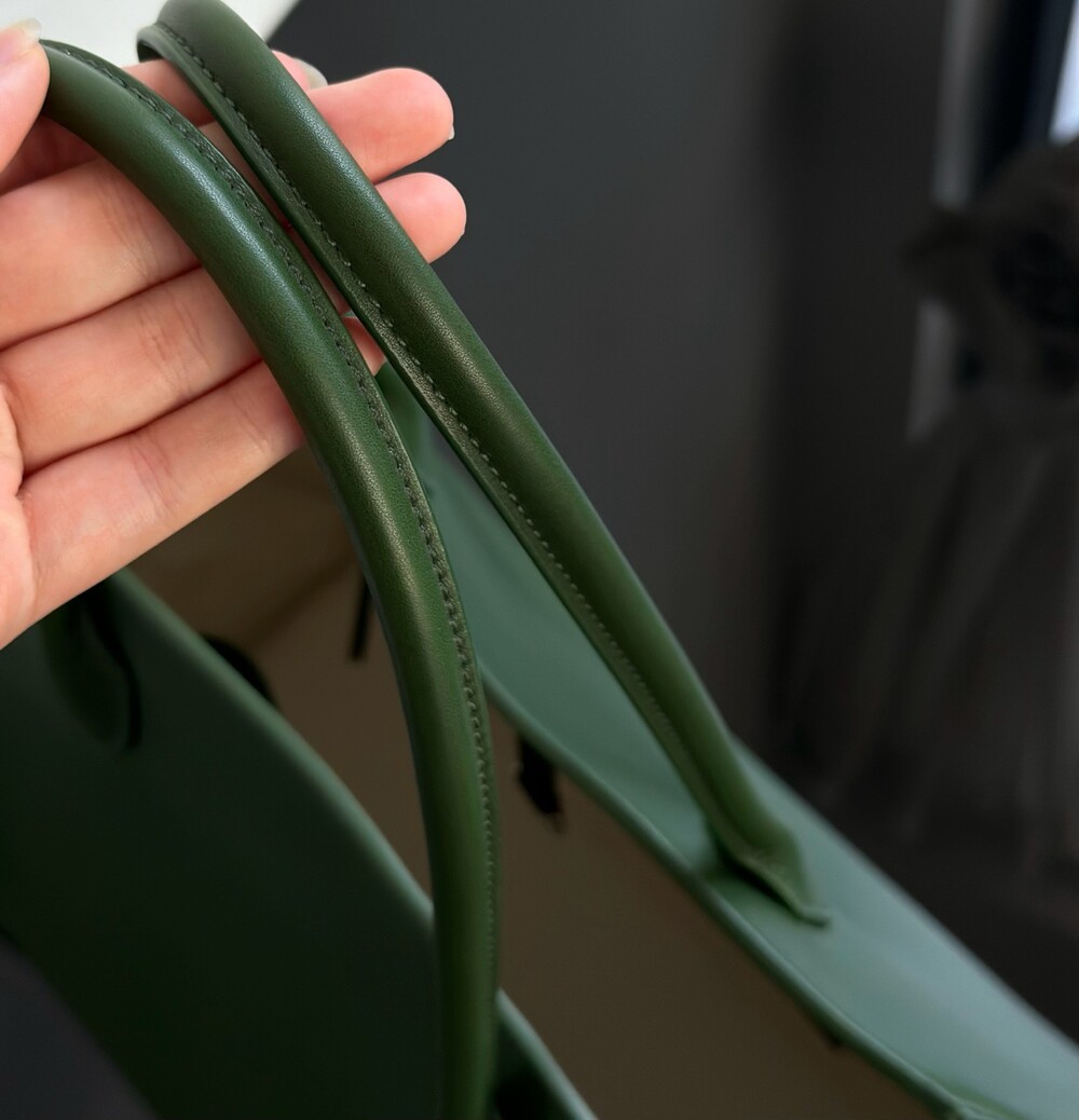 광택 마감된 새들 가죽 소재의 소프트 스트럭처 토트 백으로, 튜브형 핸들과 거싯 디테일의 옆면 패널이 특징입니다.
