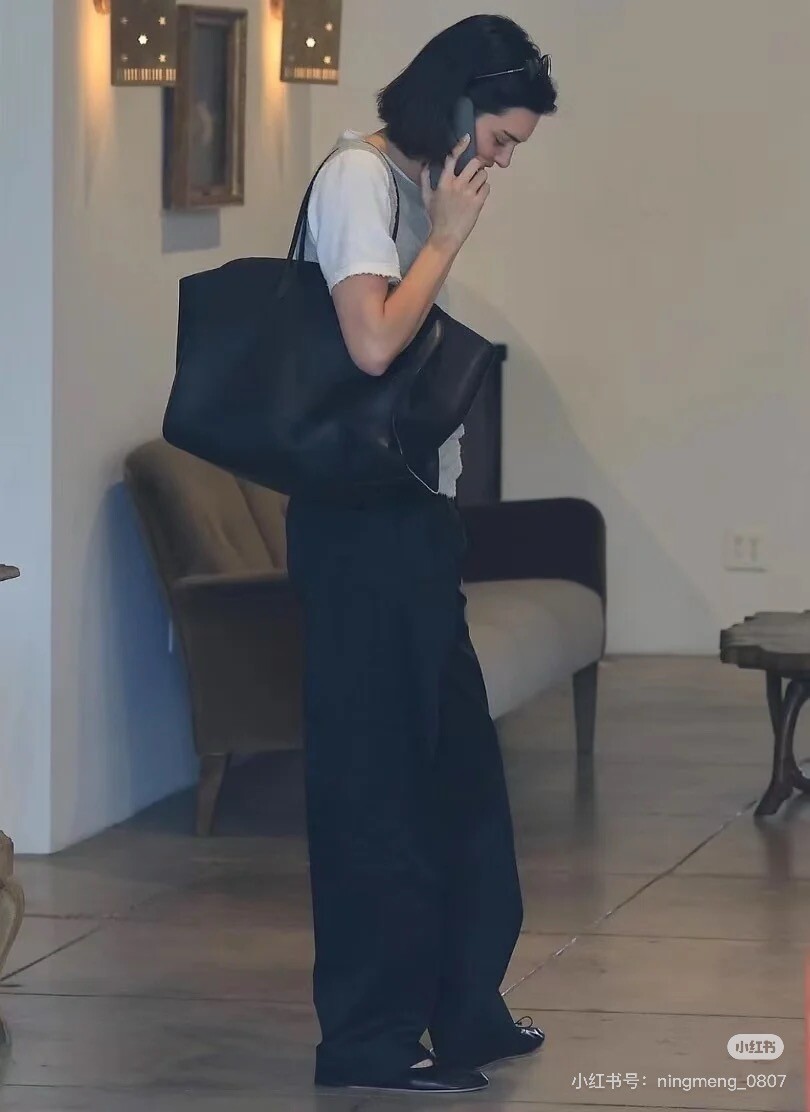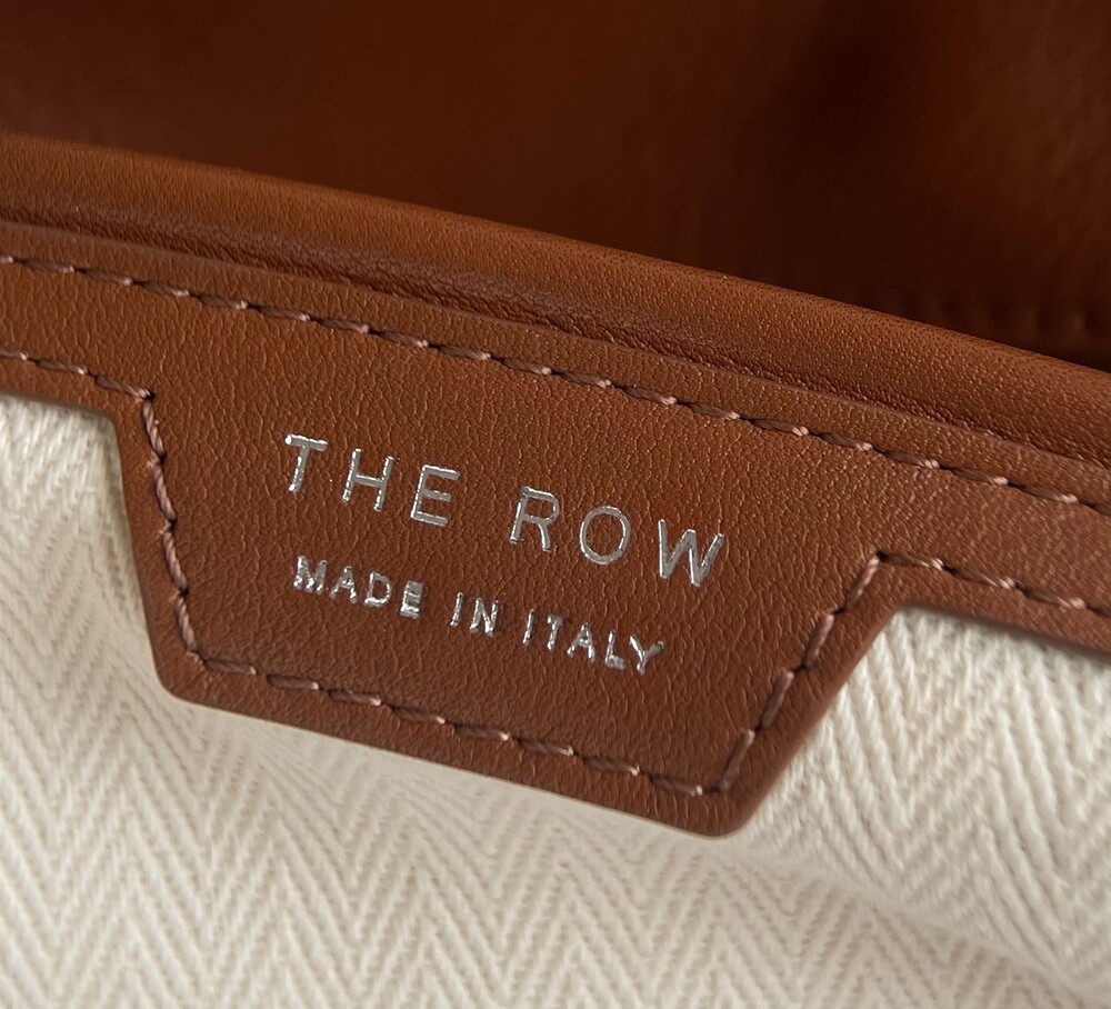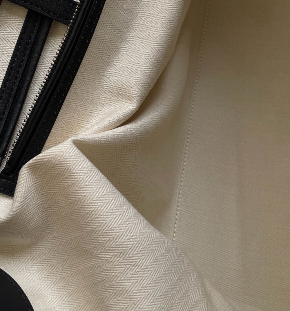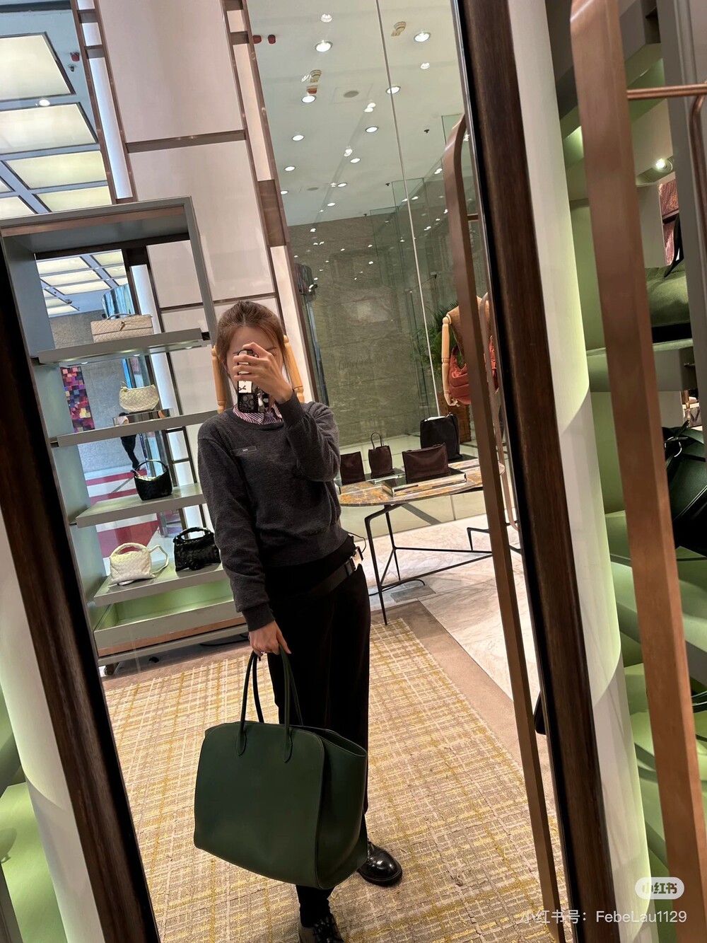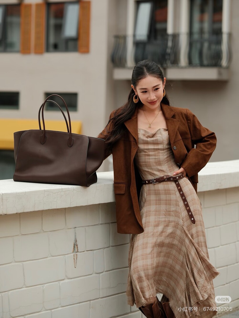 광택 마감된 새들 가죽 소재의 소프트 스트럭처 토트 백으로, 튜브형 핸들과 거싯 디테일의 옆면 패널이 특징입니다.