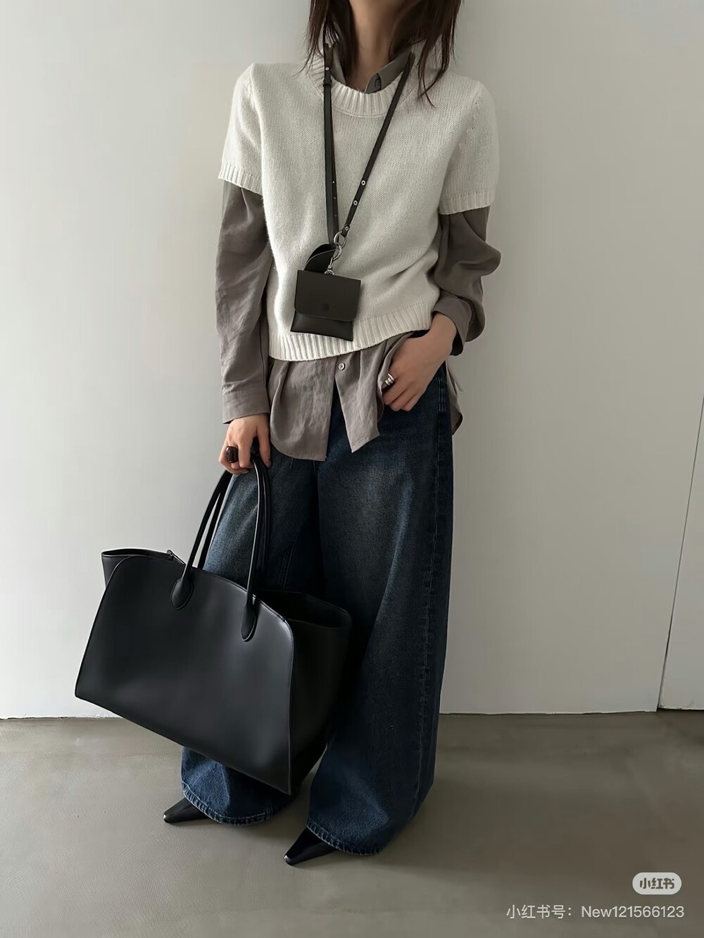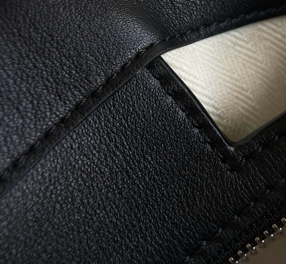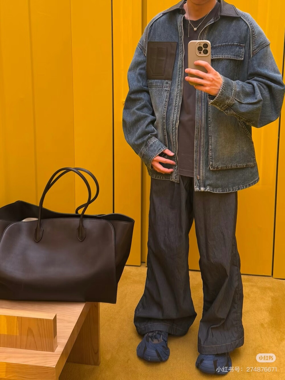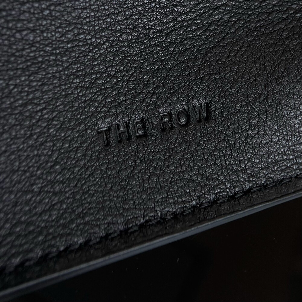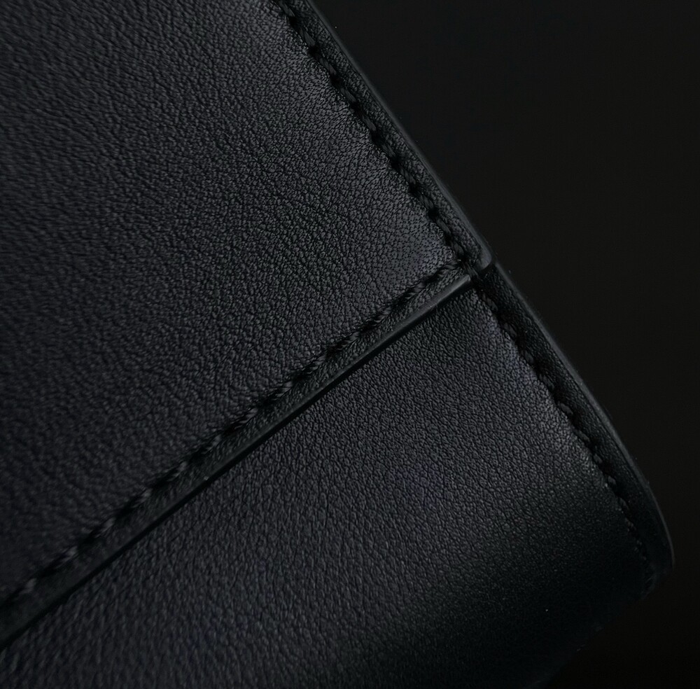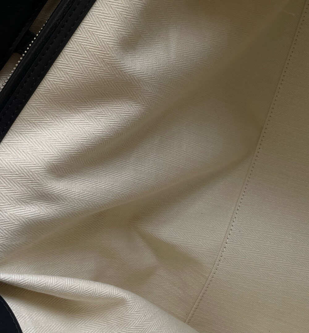 광택 마감된 새들 가죽 소재의 소프트 스트럭처 토트 백으로, 튜브형 핸들과 거싯 디테일의 옆면 패널이 특징입니다.