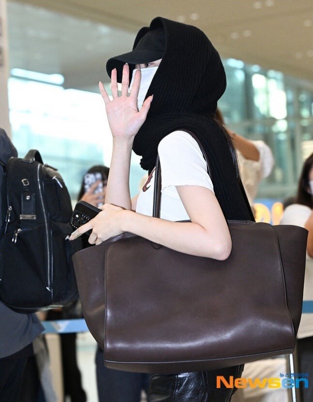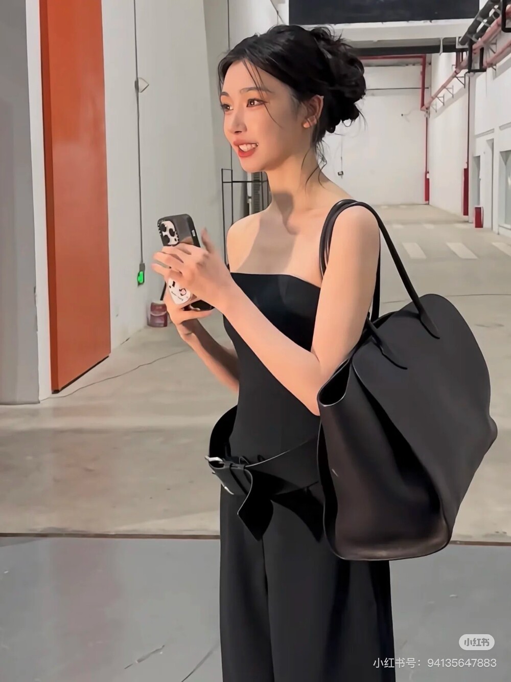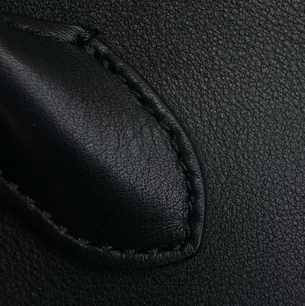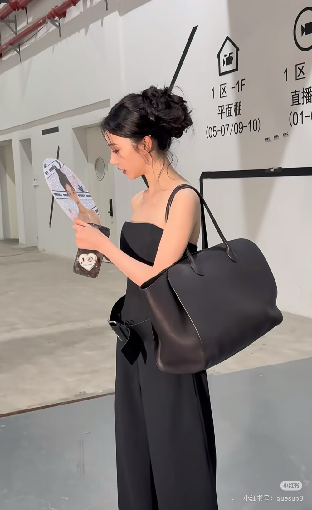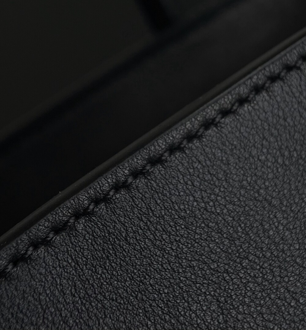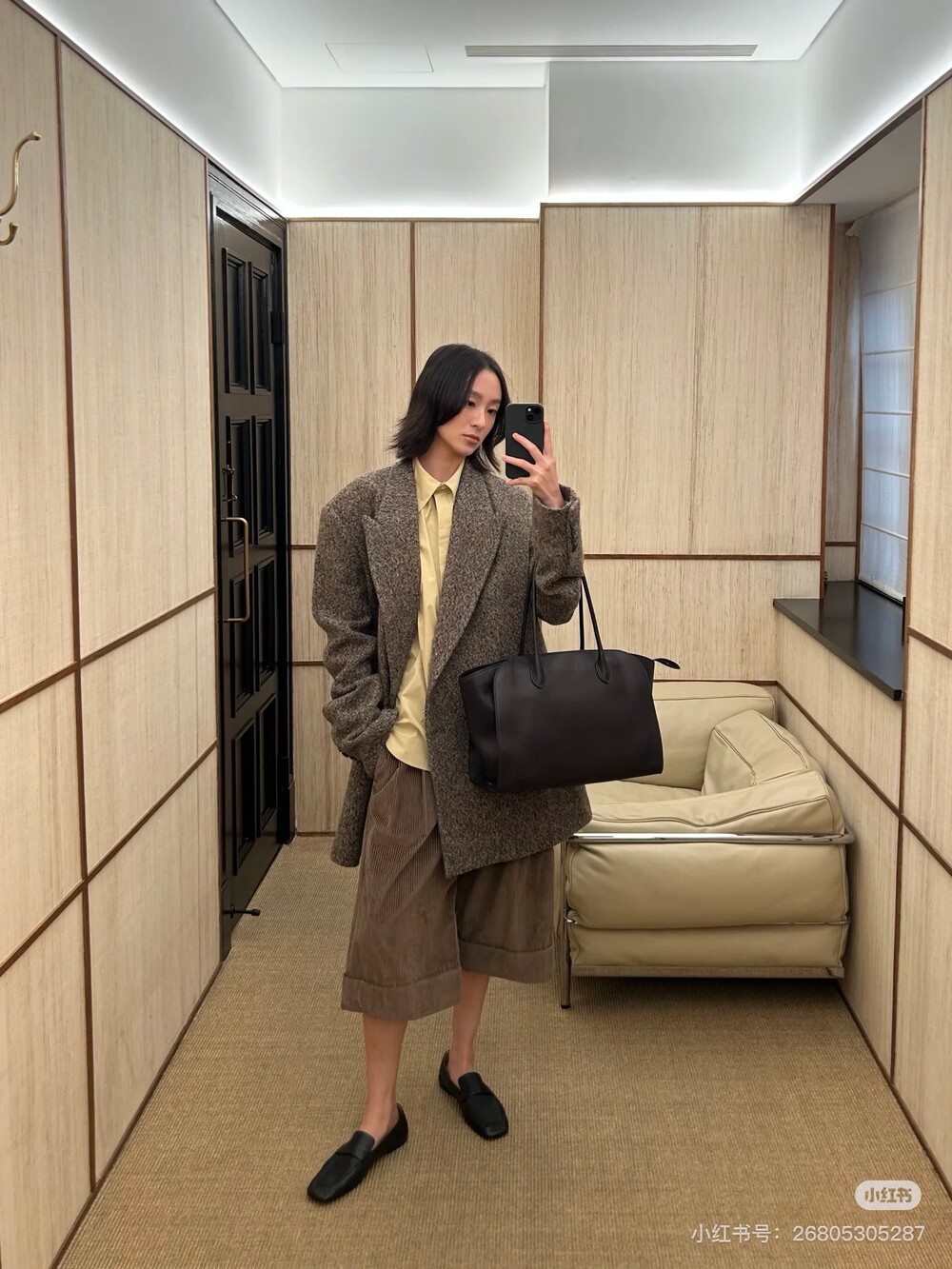 광택 마감된 새들 가죽 소재의 소프트 스트럭처 토트 백으로, 튜브형 핸들과 거싯 디테일의 옆면 패널이 특징입니다.