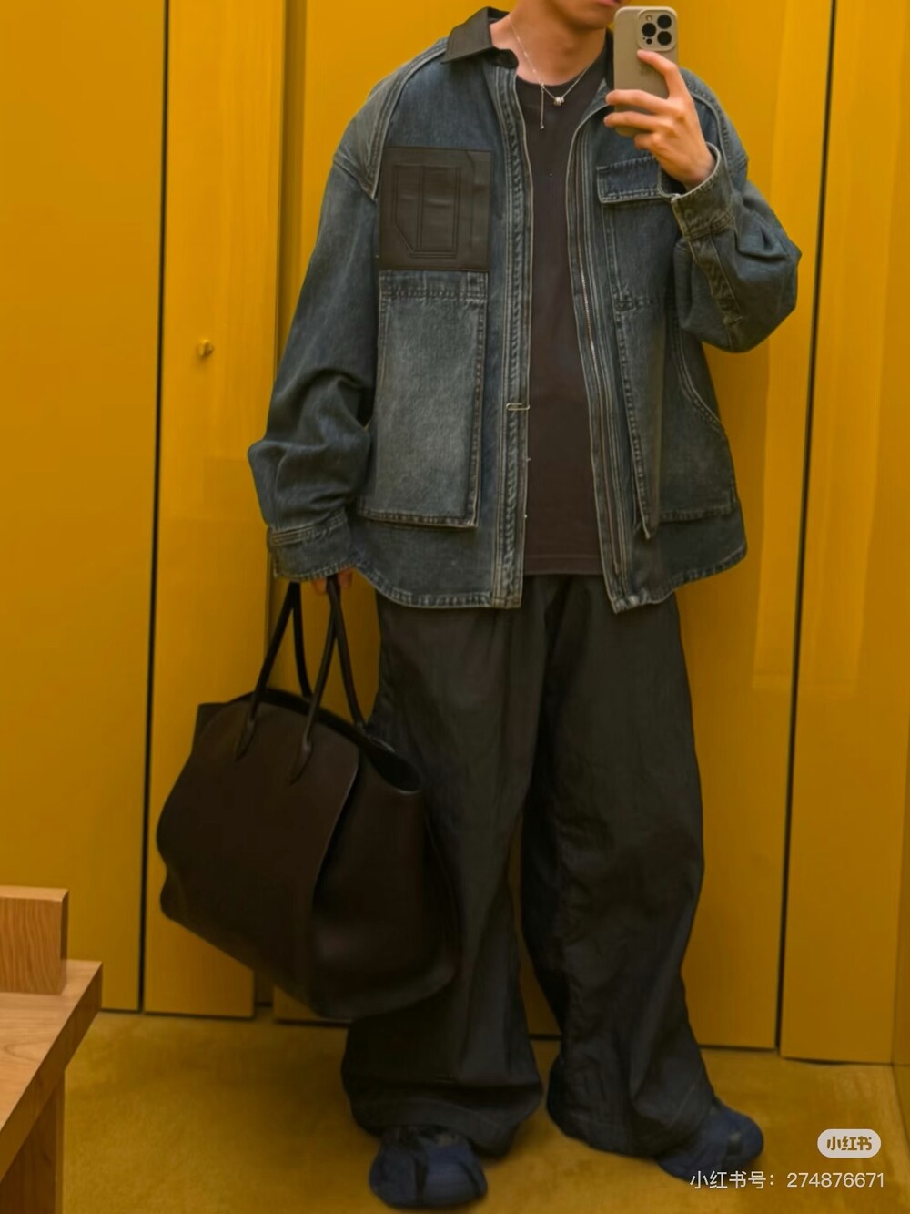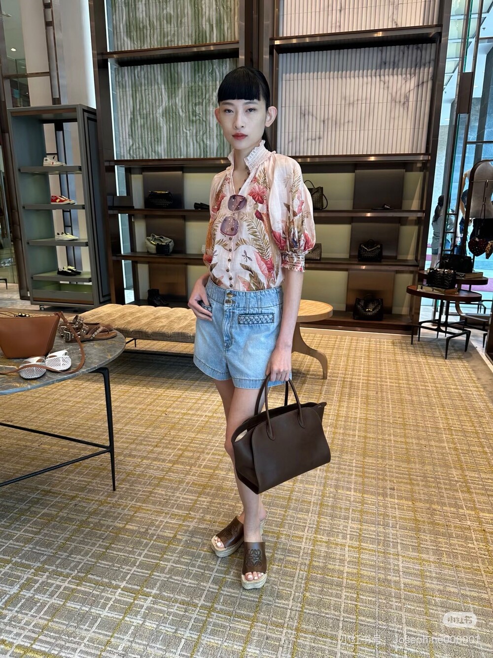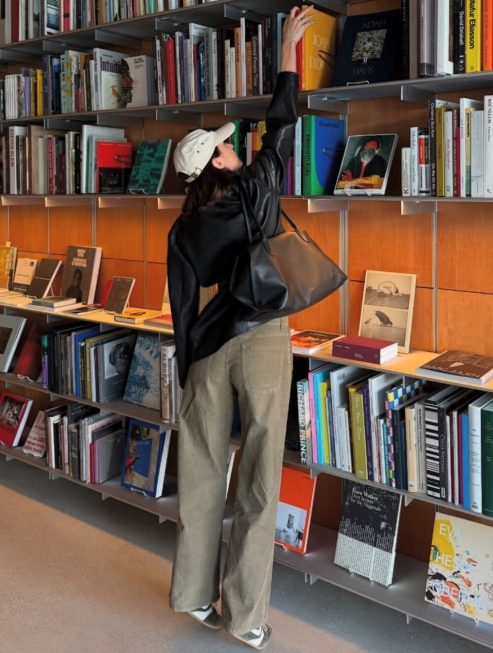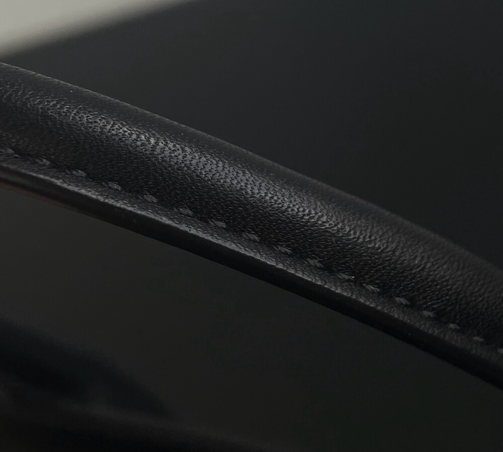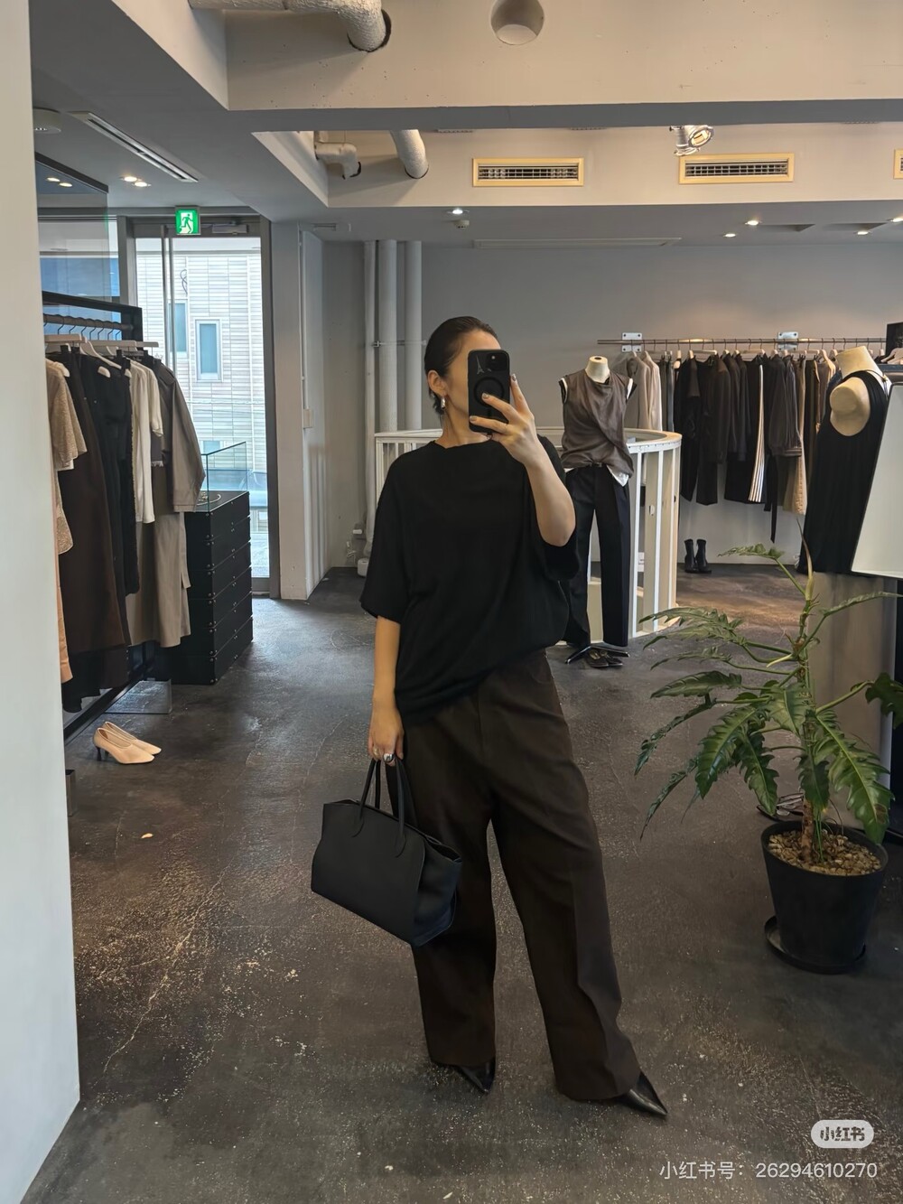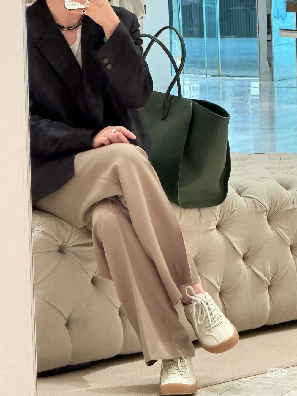 광택 마감된 새들 가죽 소재의 소프트 스트럭처 토트 백으로, 튜브형 핸들과 거싯 디테일의 옆면 패널이 특징입니다.