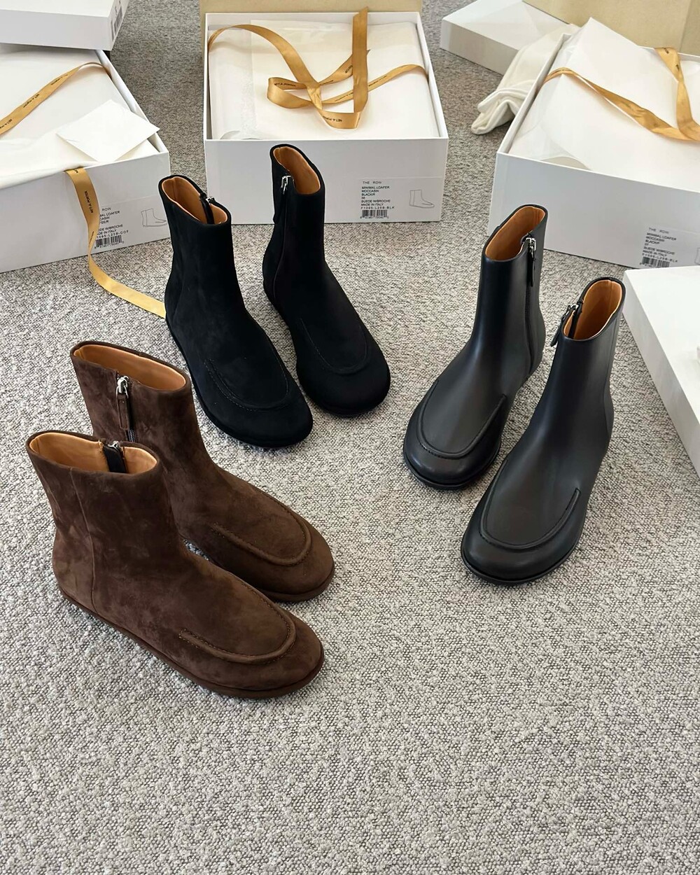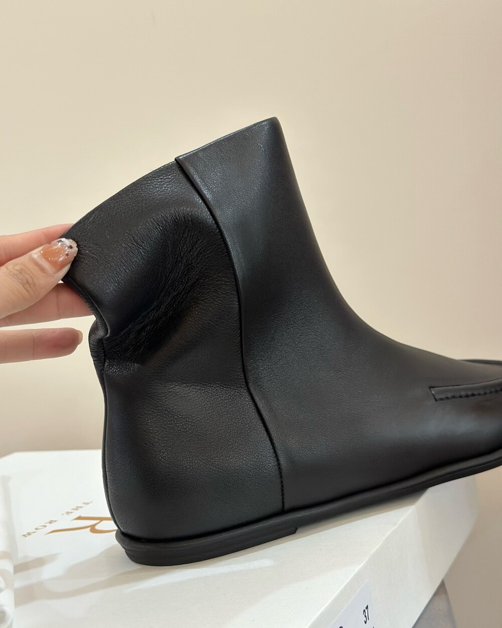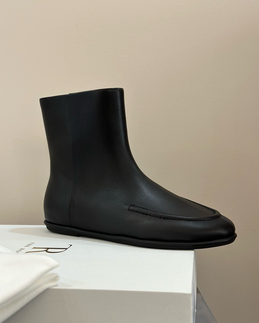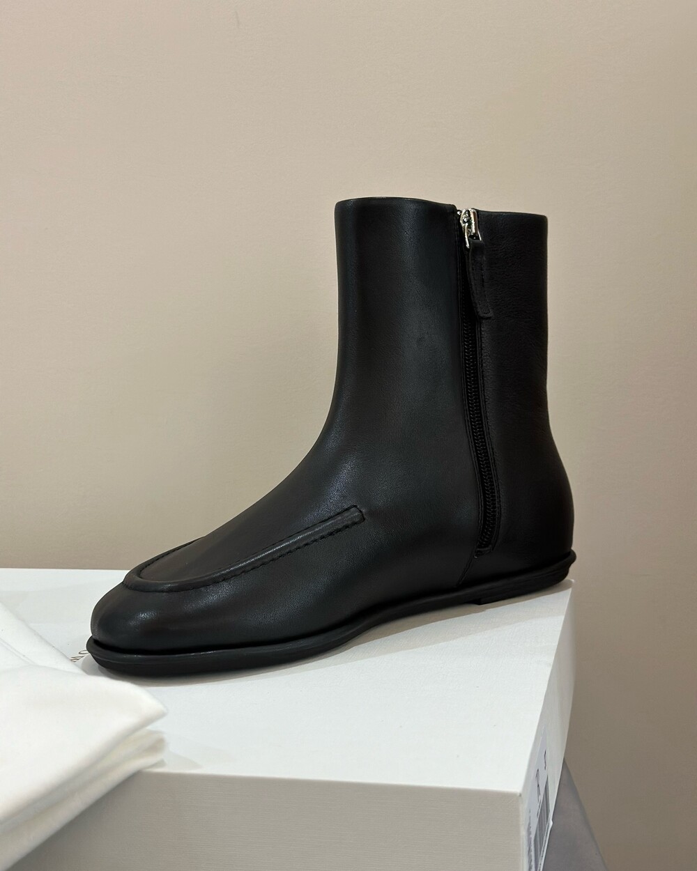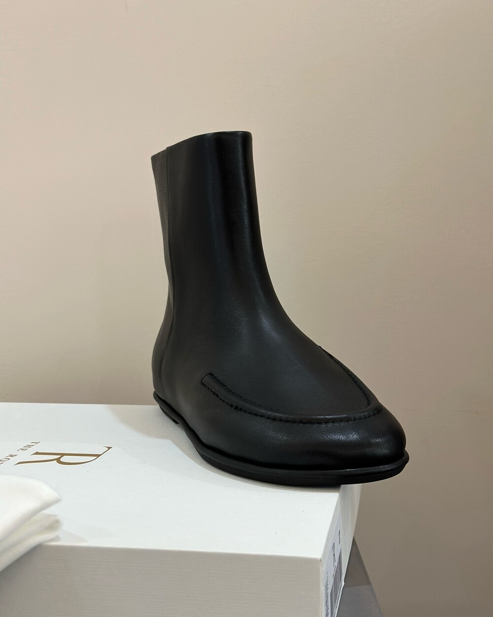 부드러운 나파 가죽으로 만든 The Row 미니멀리스트 앵클 부츠는 둥근 앞부분, 솟아오른 스티칭 앞부분 디테일, 내부 지퍼 잠금 장치가 특징입니다.
