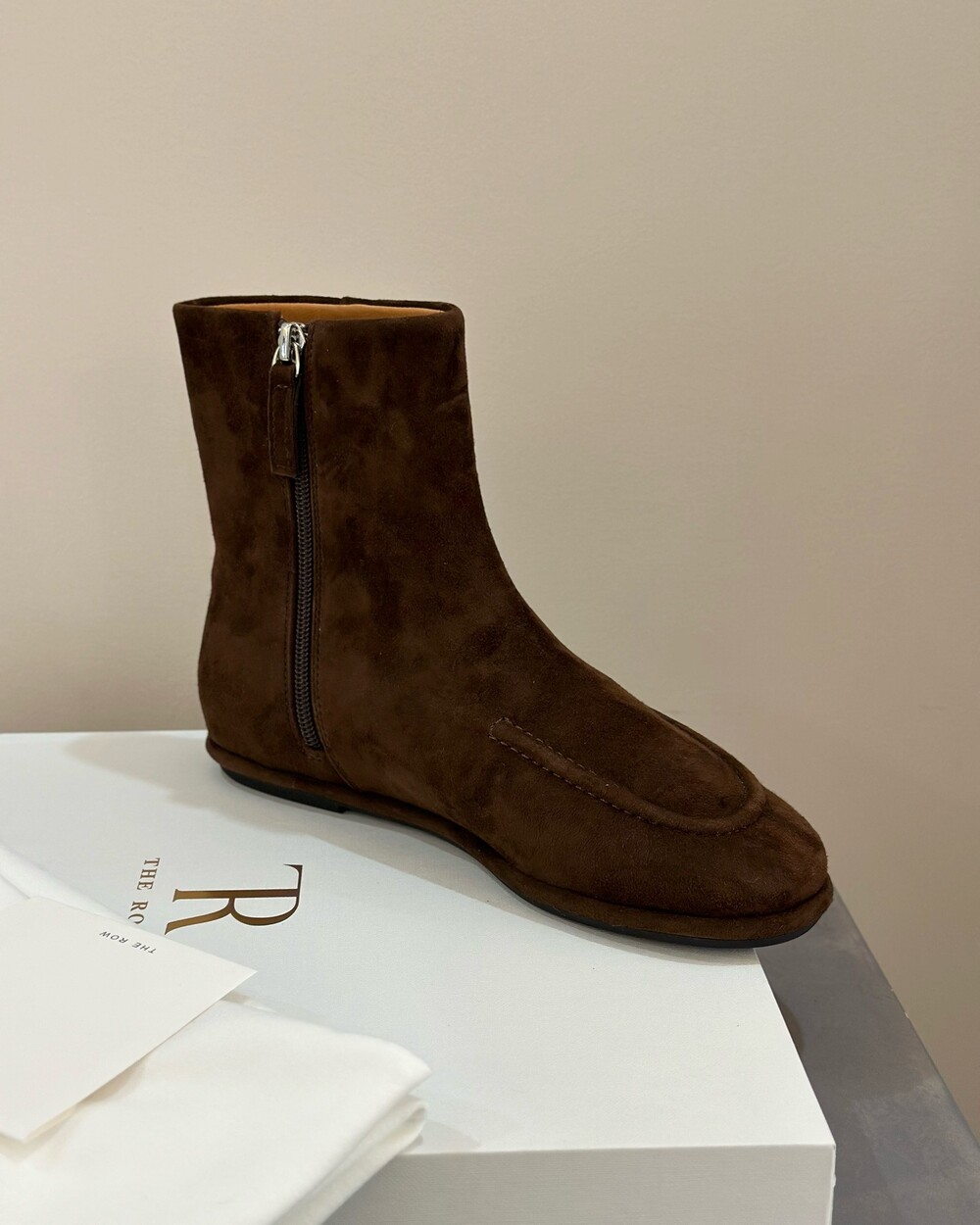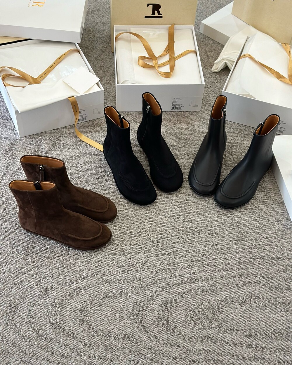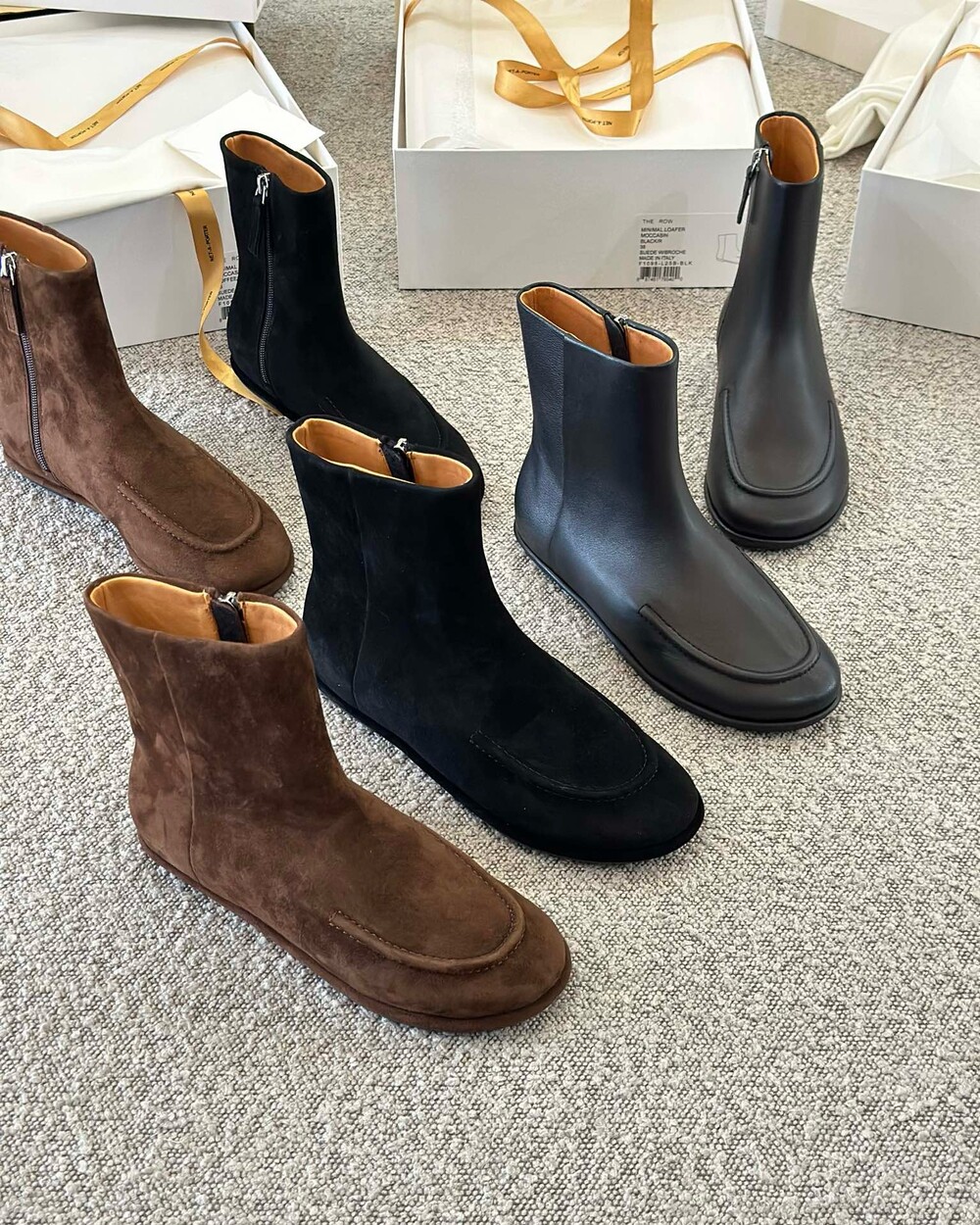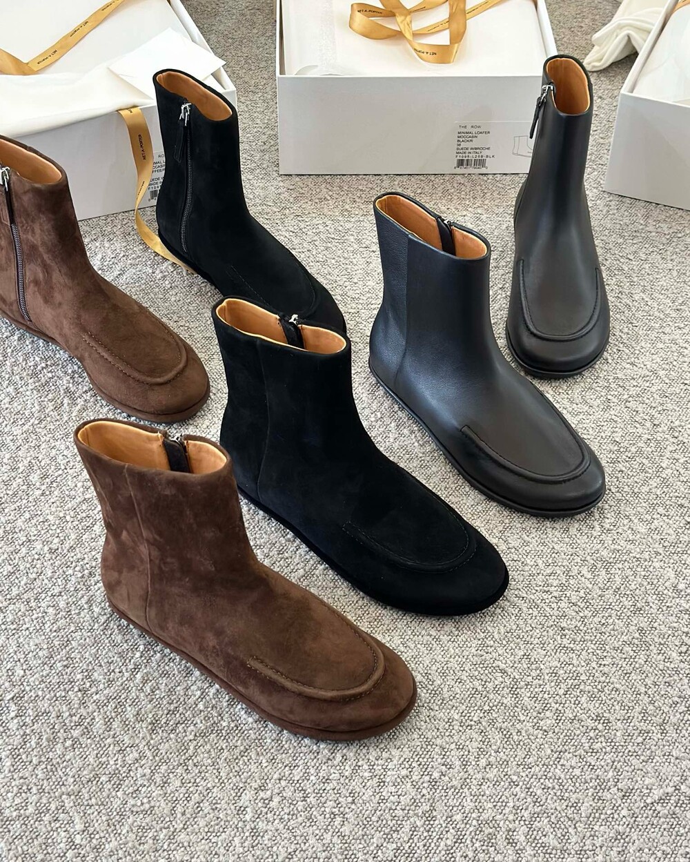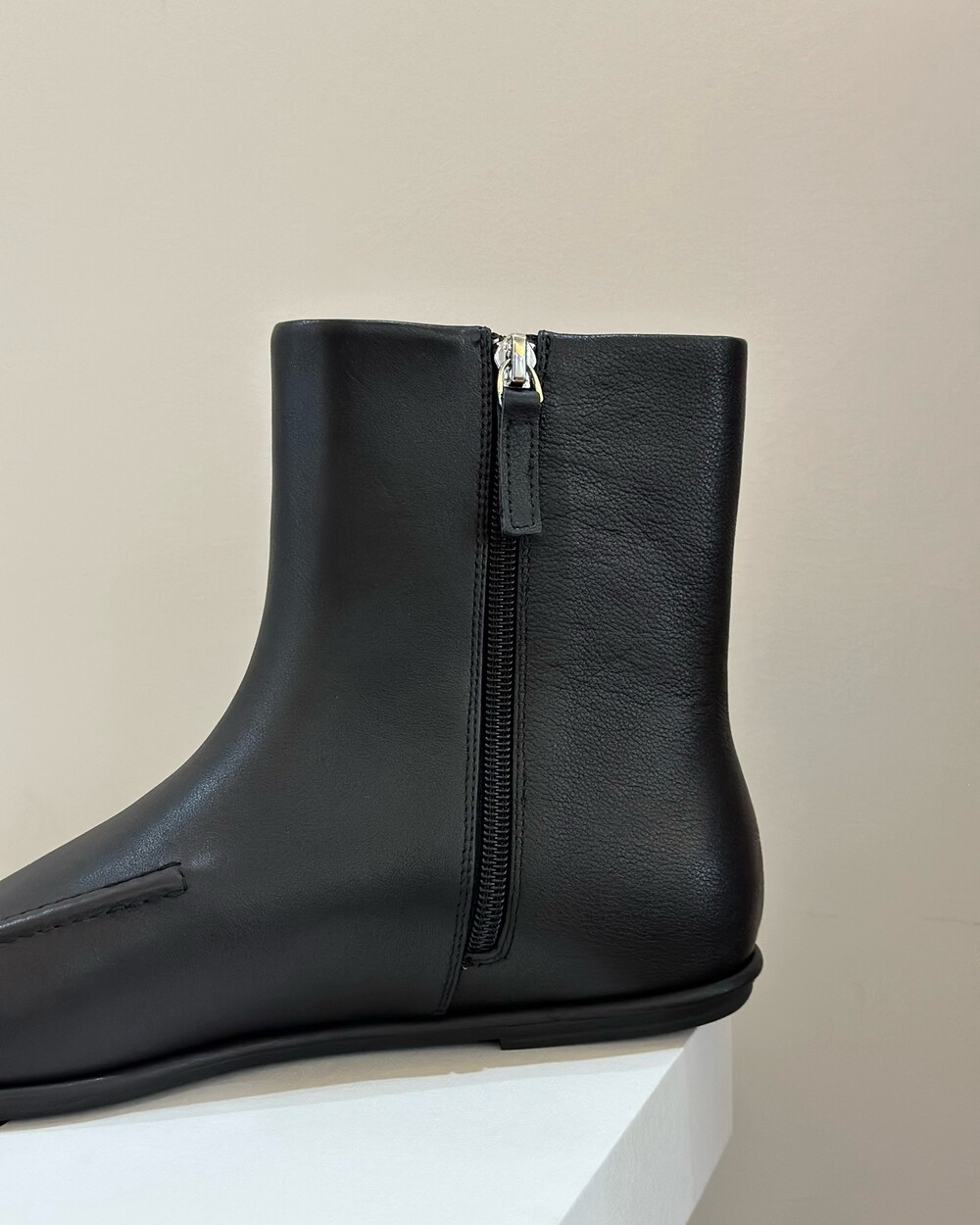 부드러운 나파 가죽으로 만든 The Row 미니멀리스트 앵클 부츠는 둥근 앞부분, 솟아오른 스티칭 앞부분 디테일, 내부 지퍼 잠금 장치가 특징입니다.