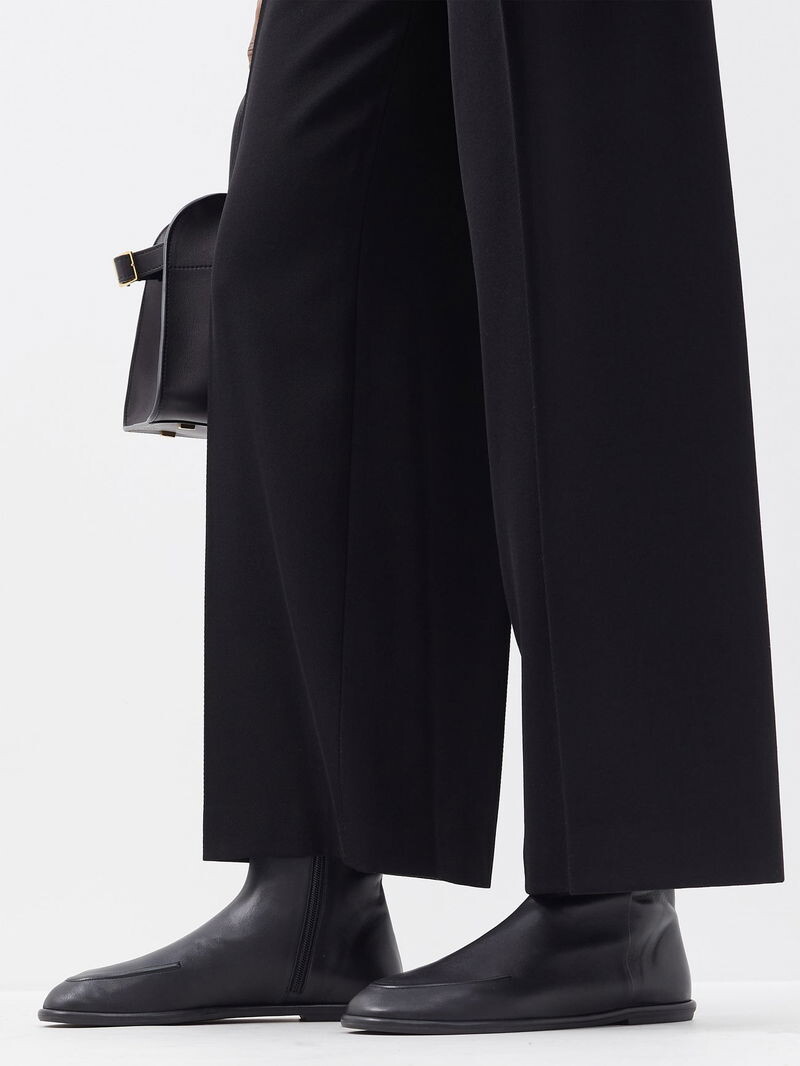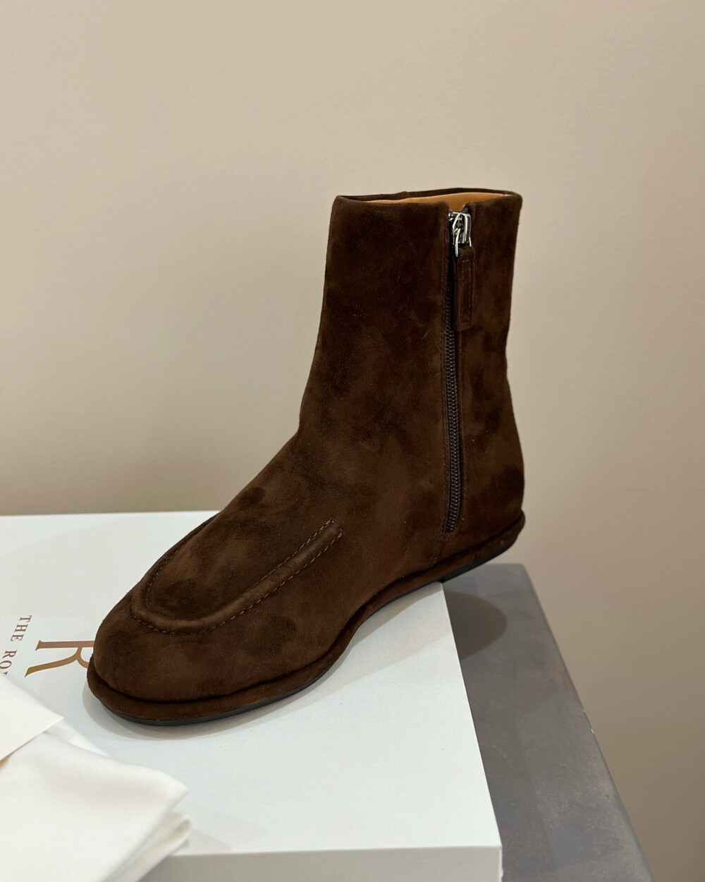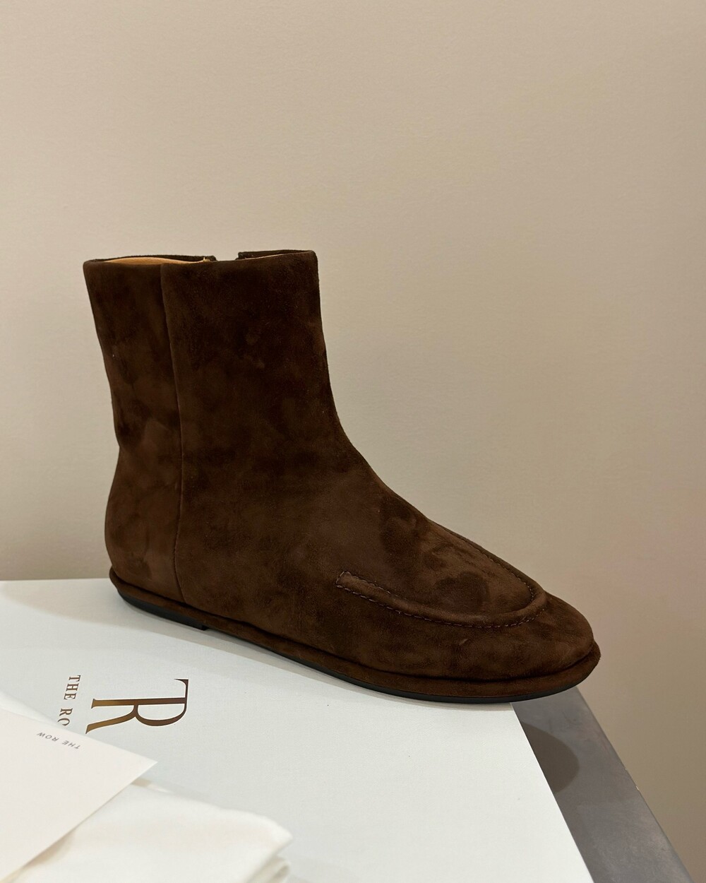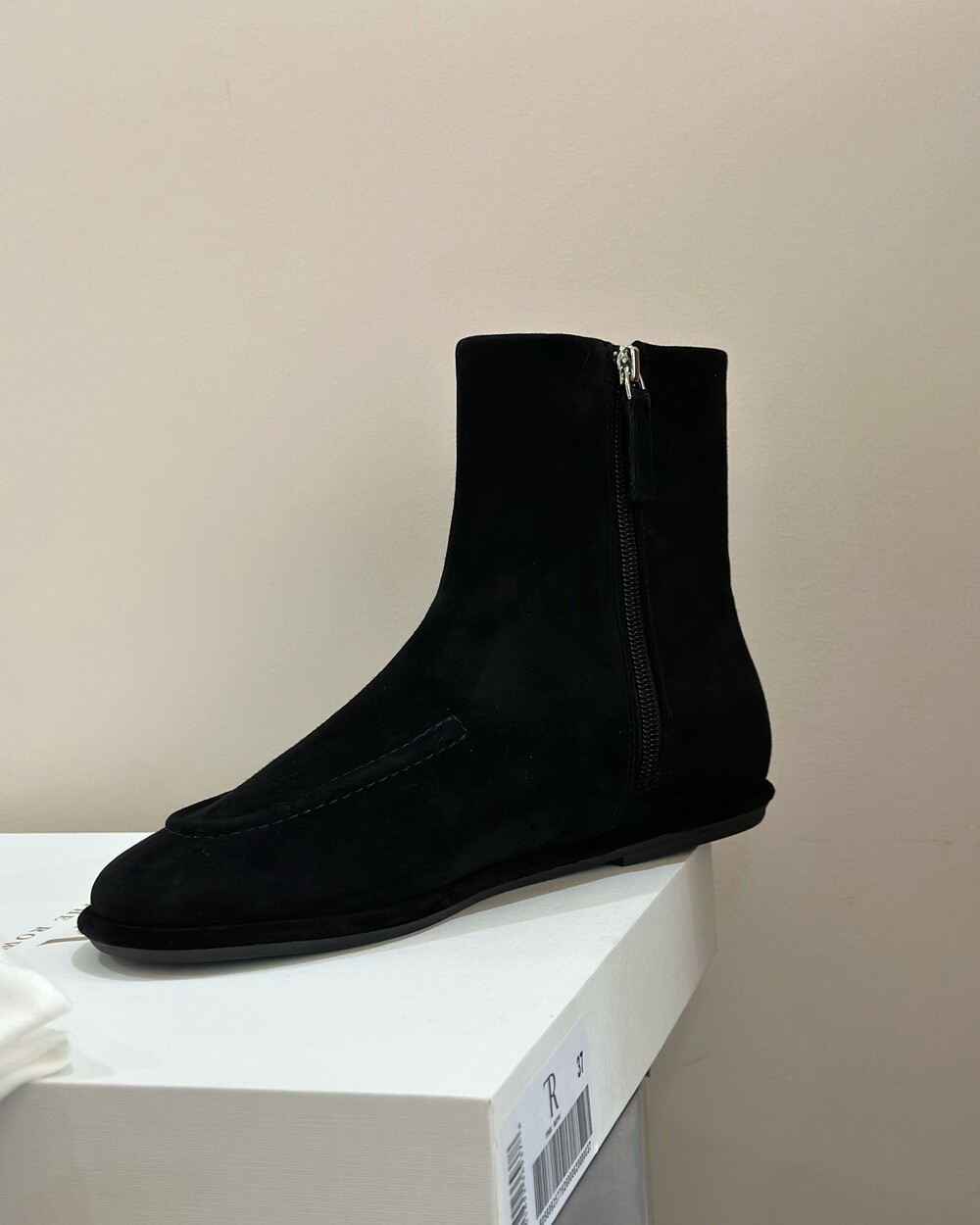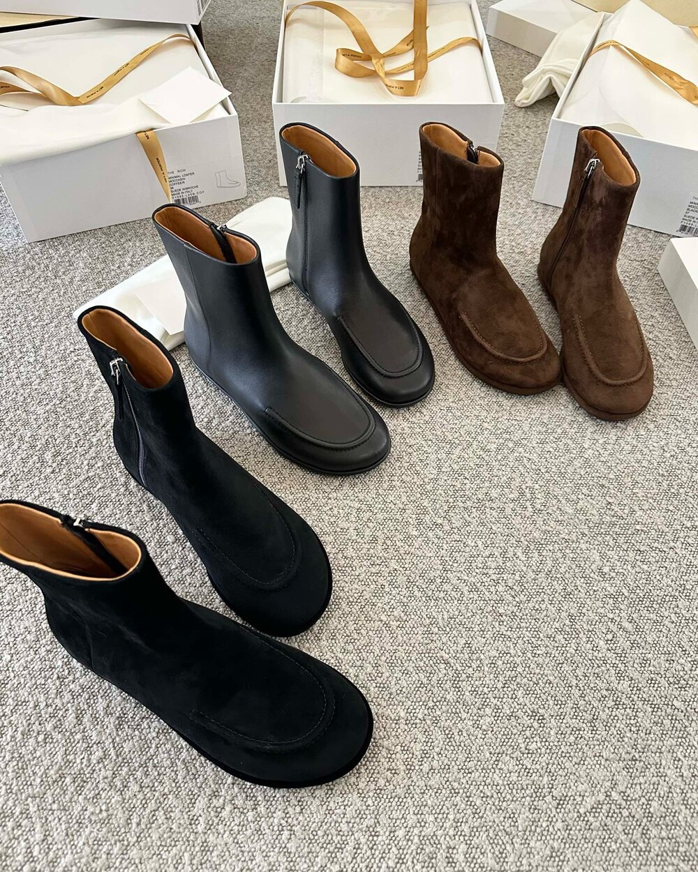 부드러운 나파 가죽으로 만든 The Row 미니멀리스트 앵클 부츠는 둥근 앞부분, 솟아오른 스티칭 앞부분 디테일, 내부 지퍼 잠금 장치가 특징입니다.