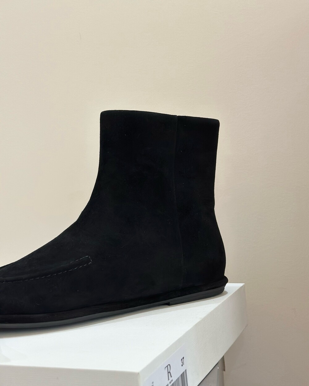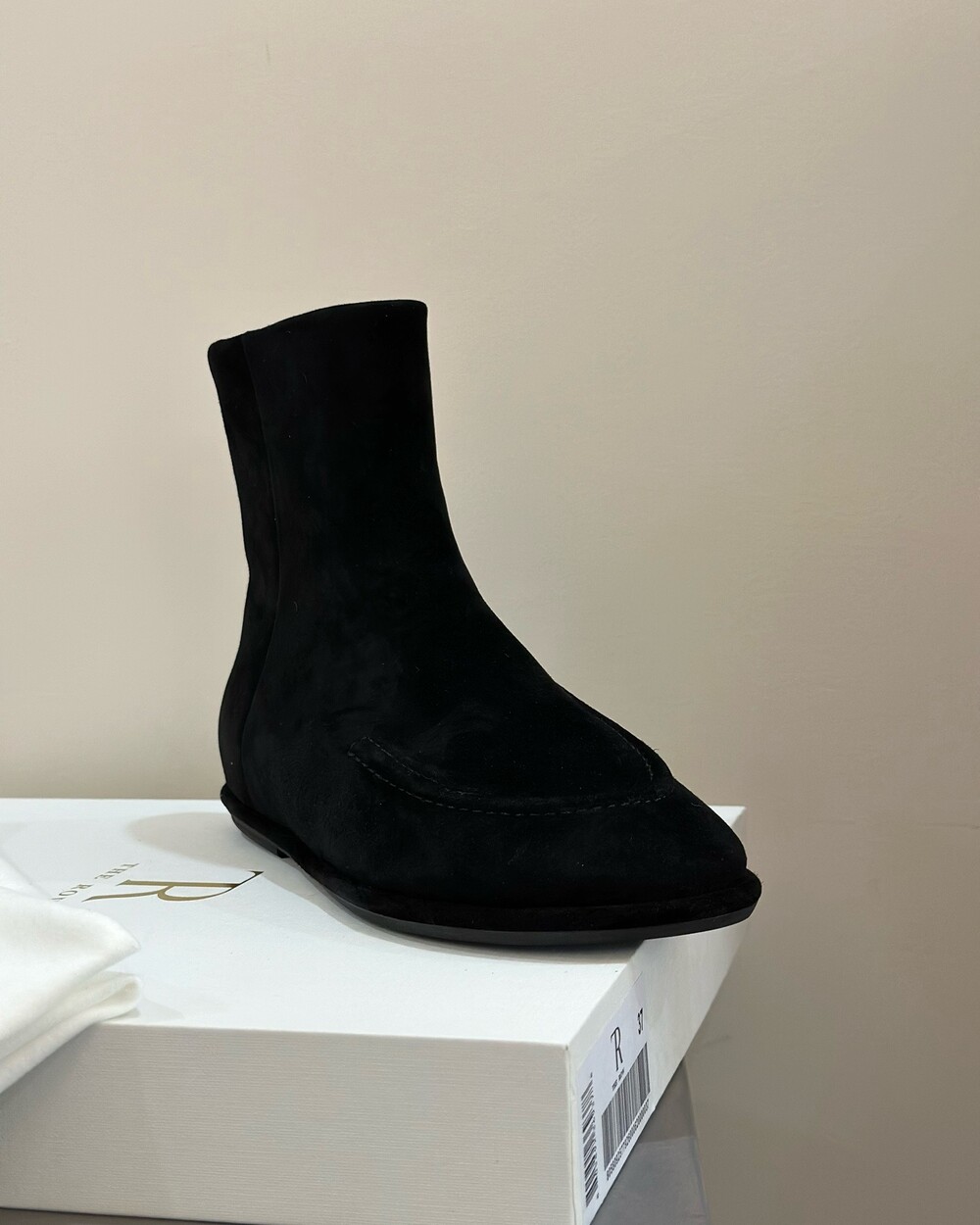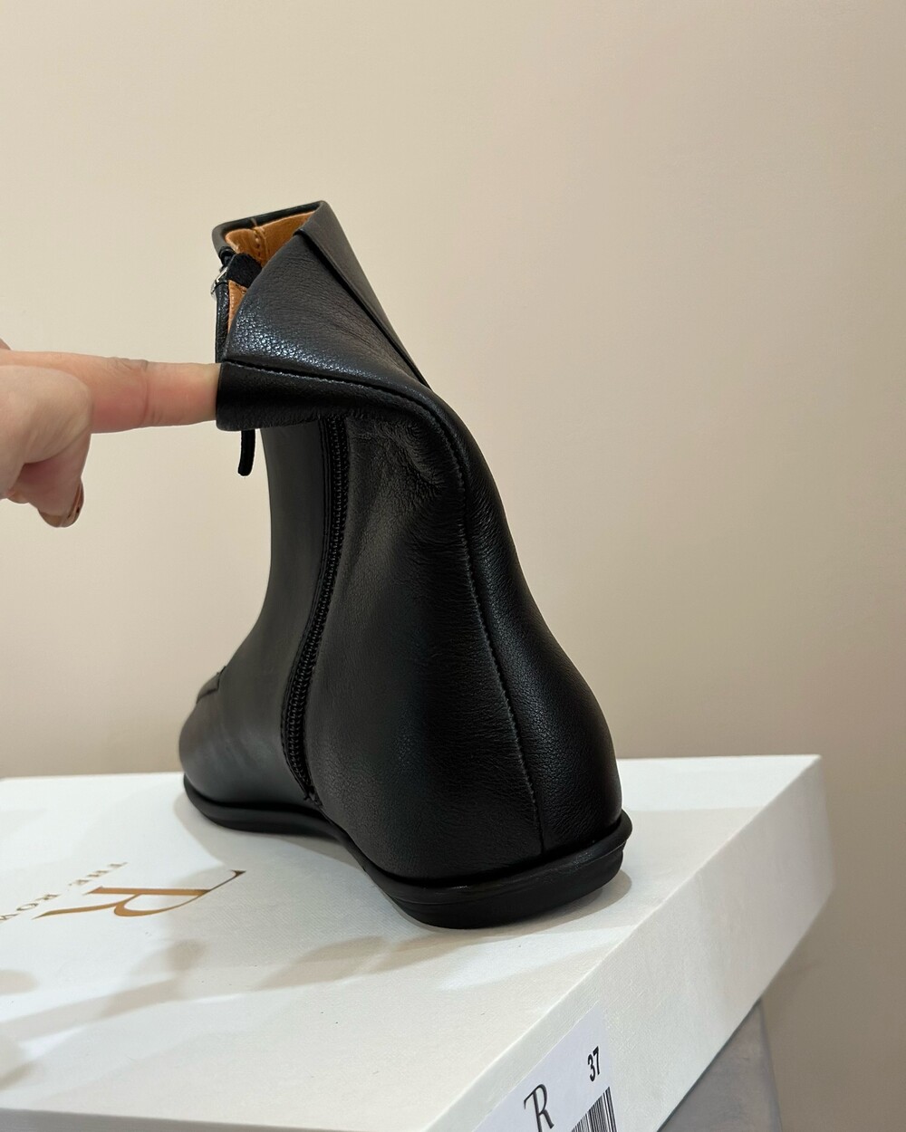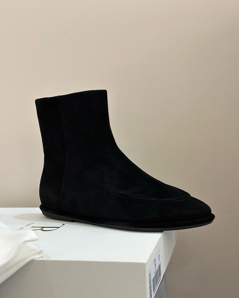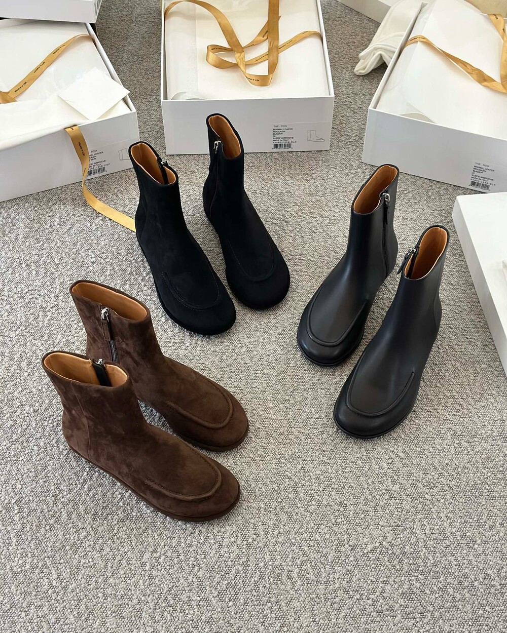 부드러운 나파 가죽으로 만든 The Row 미니멀리스트 앵클 부츠는 둥근 앞부분, 솟아오른 스티칭 앞부분 디테일, 내부 지퍼 잠금 장치가 특징입니다.