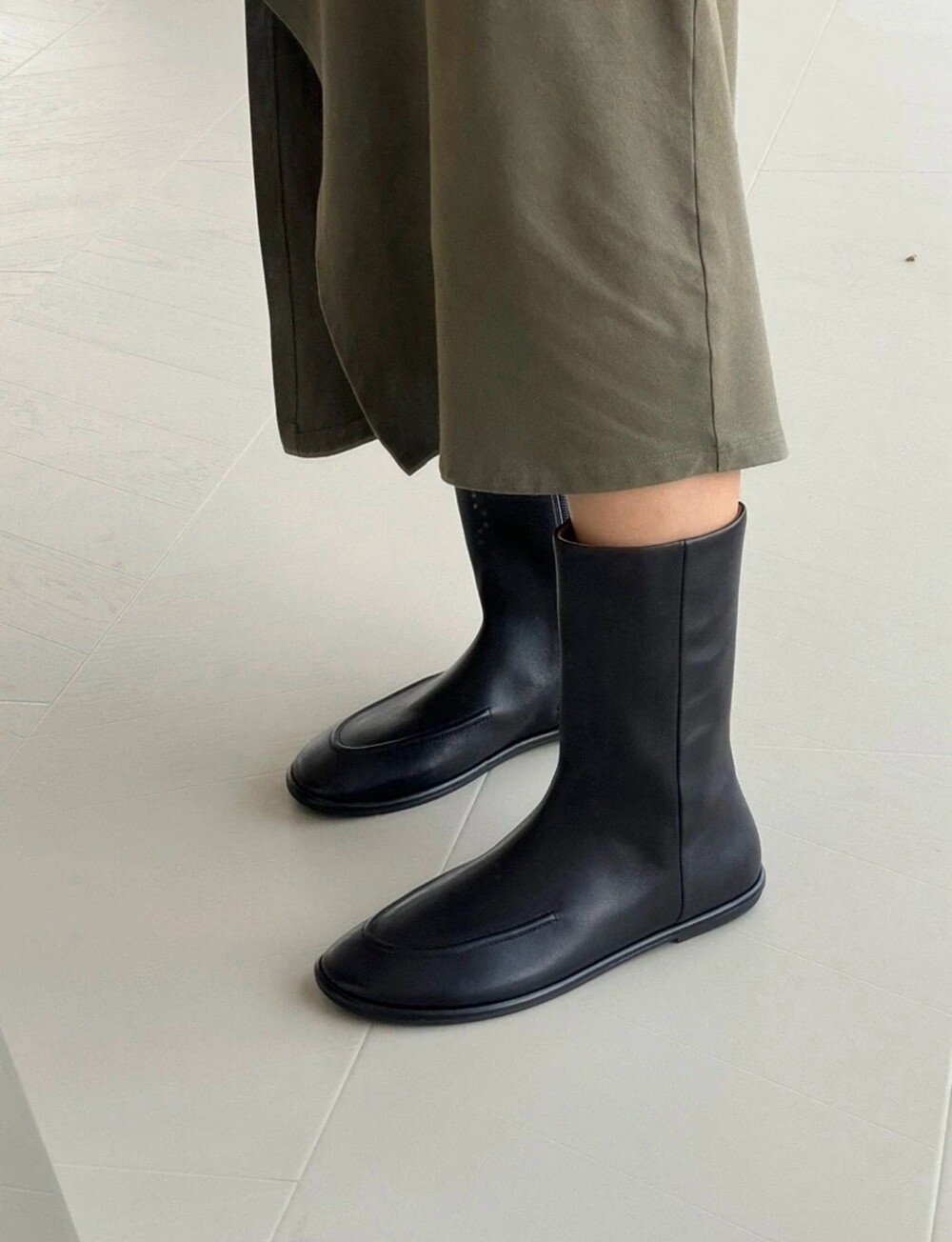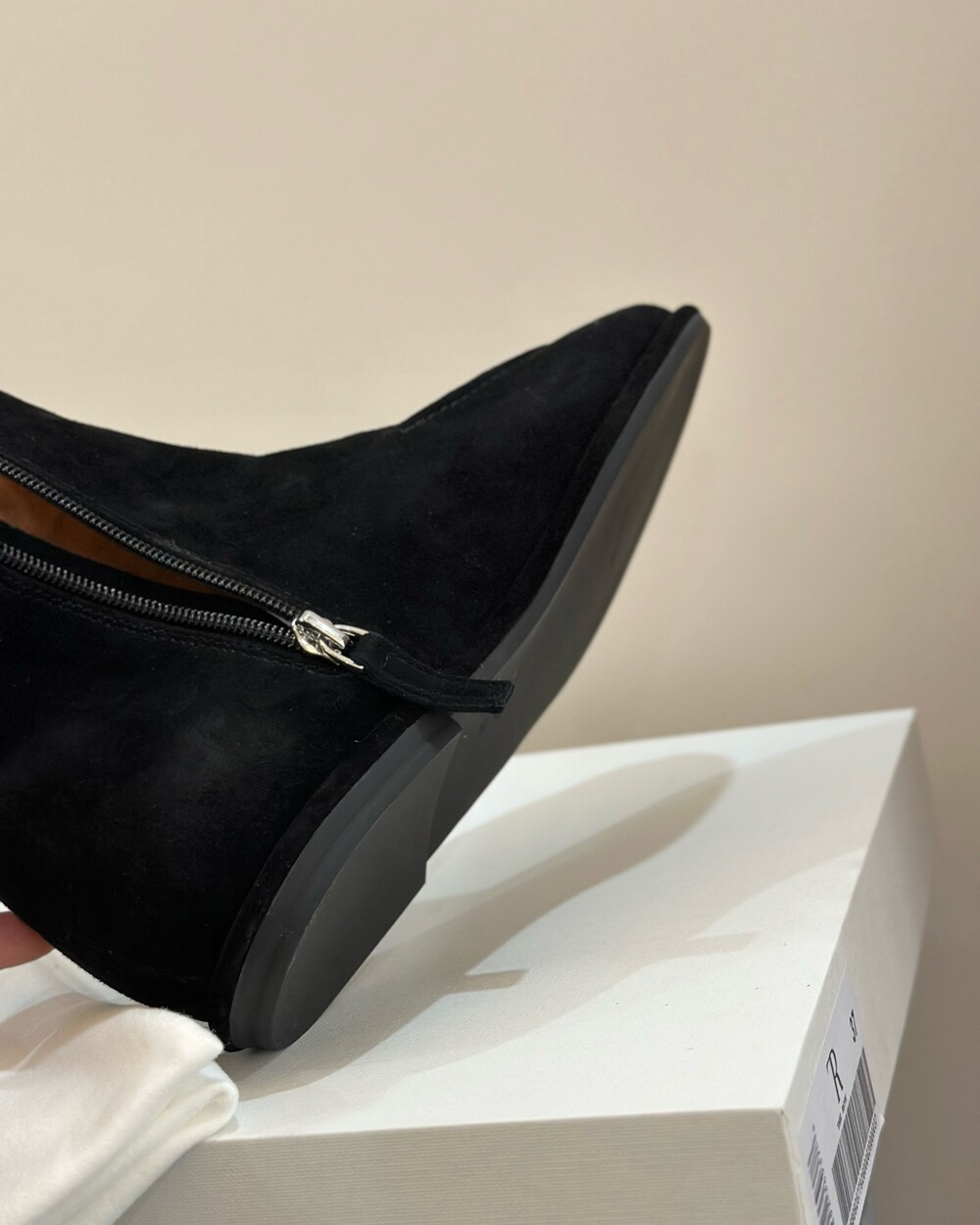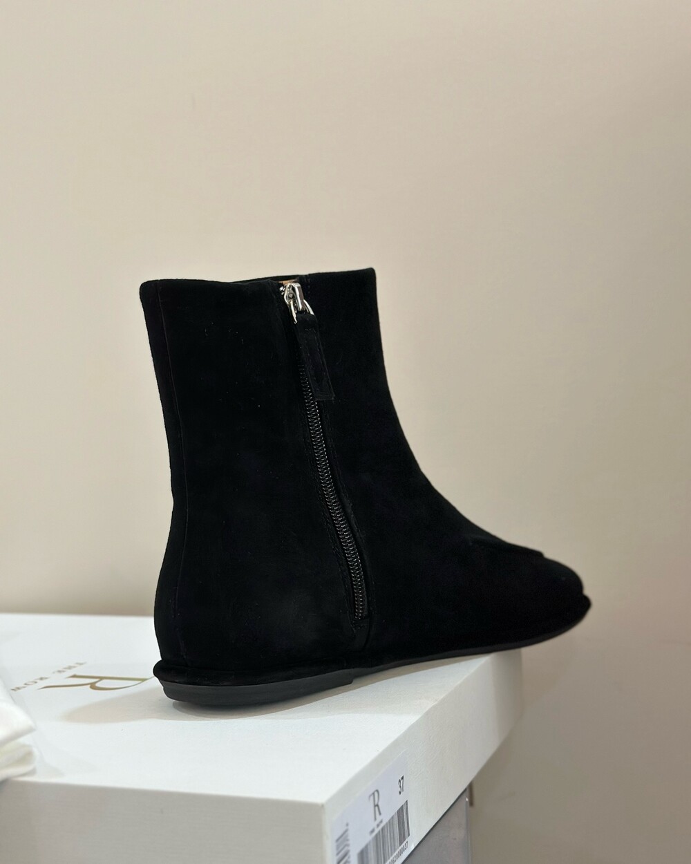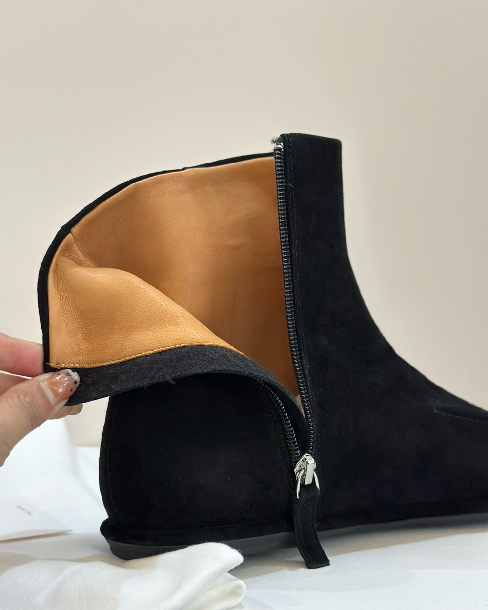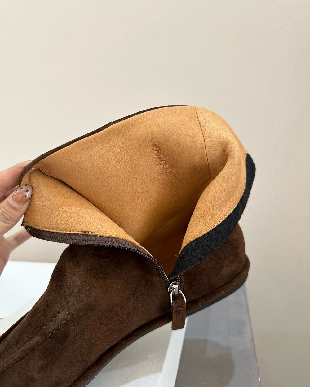부드러운 나파 가죽으로 만든 The Row 미니멀리스트 앵클 부츠는 둥근 앞부분, 솟아오른 스티칭 앞부분 디테일, 내부 지퍼 잠금 장치가 특징입니다.