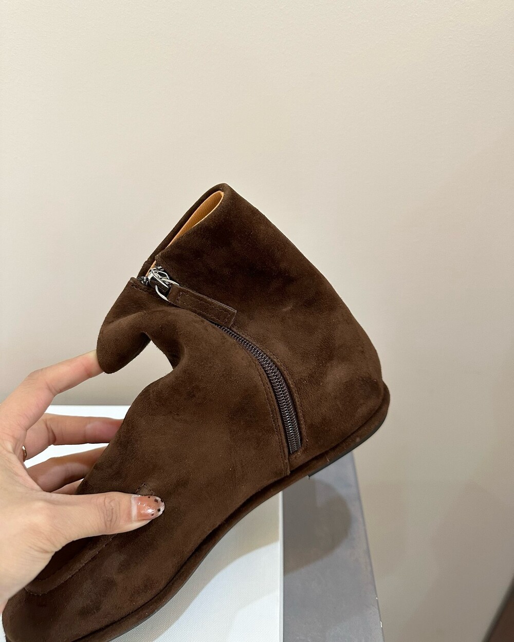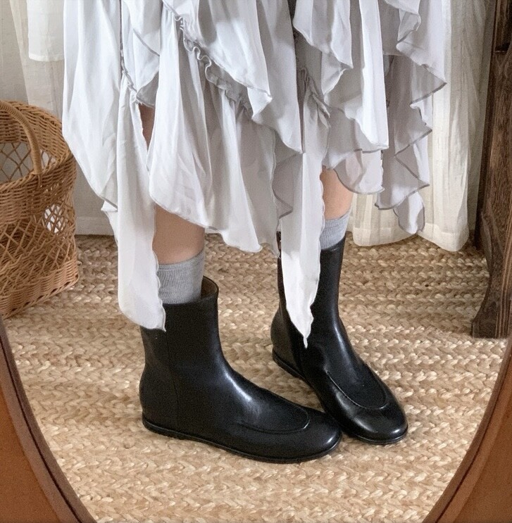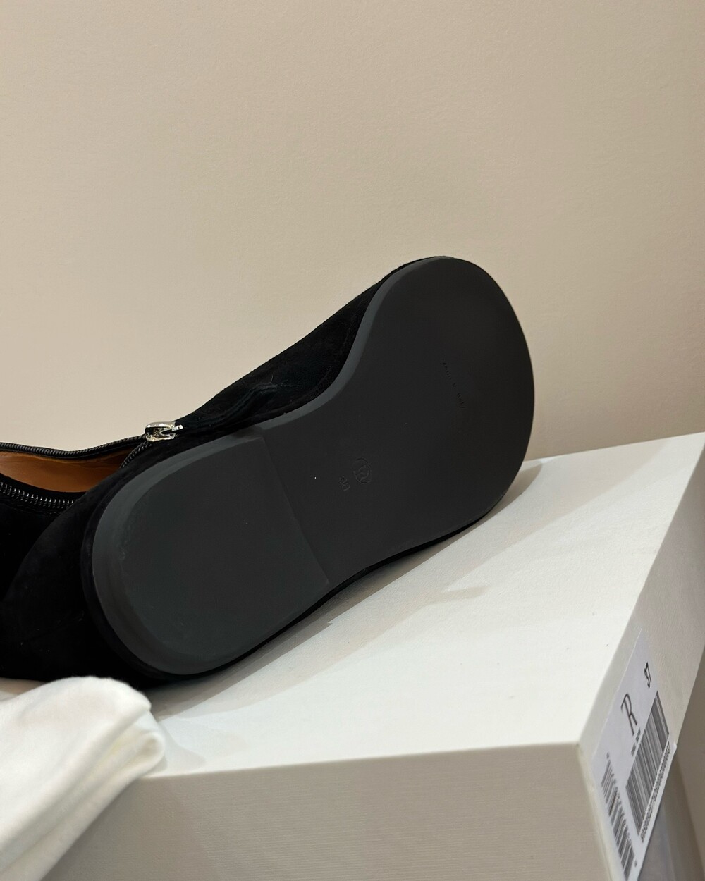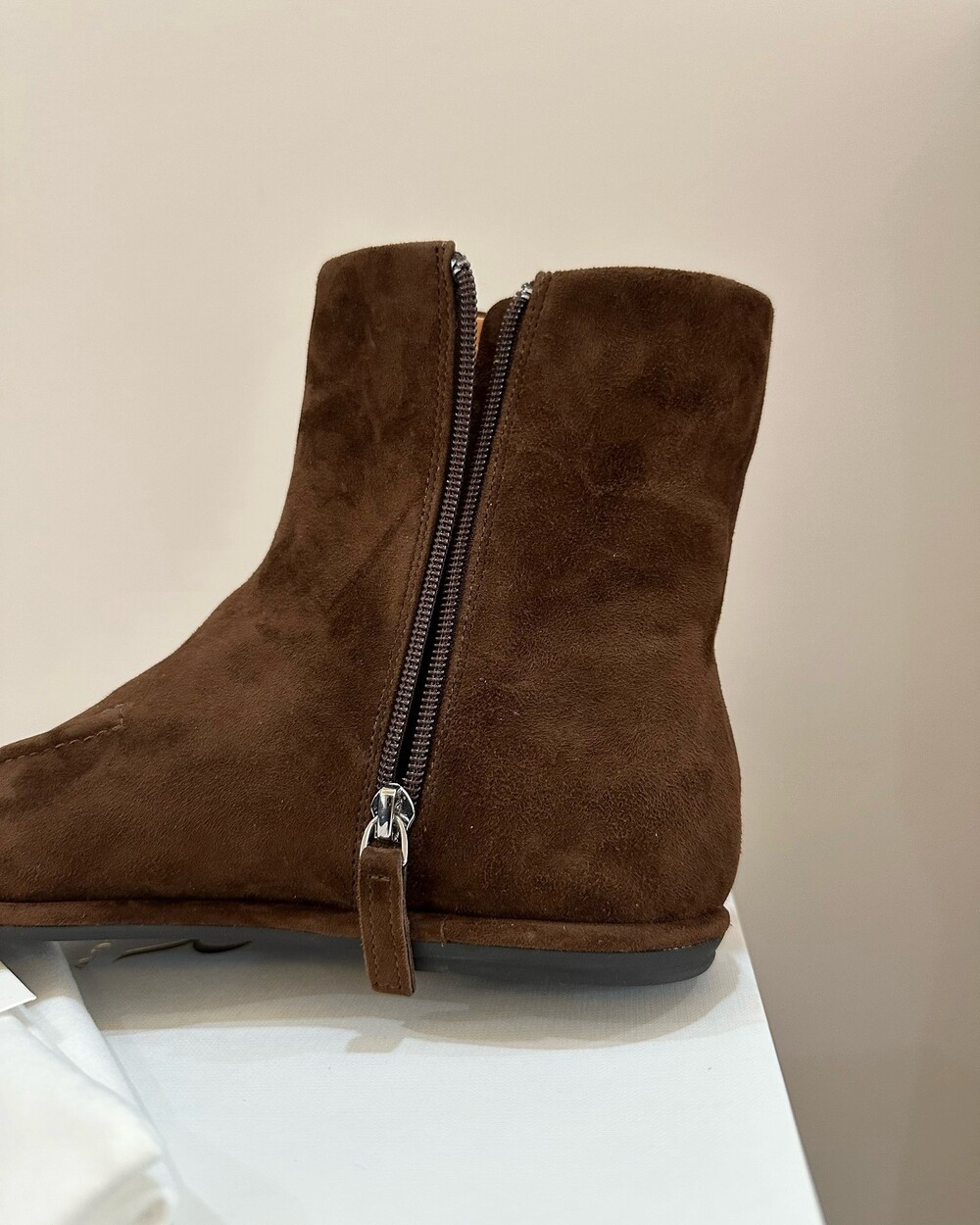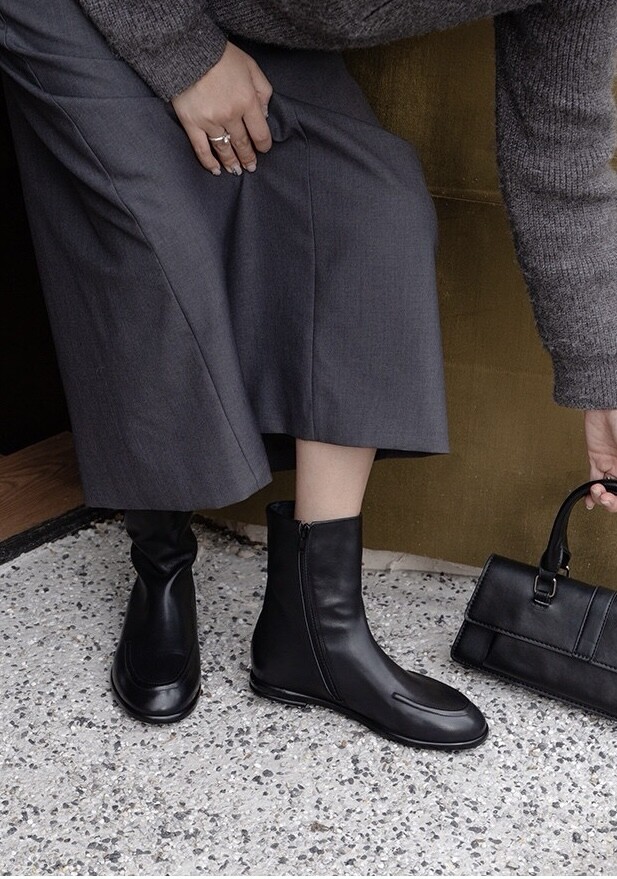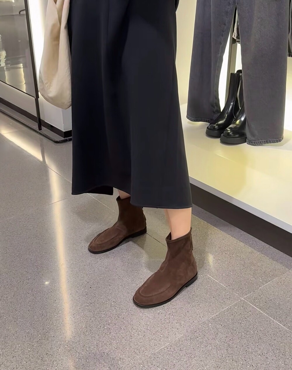 부드러운 나파 가죽으로 만든 The Row 미니멀리스트 앵클 부츠는 둥근 앞부분, 솟아오른 스티칭 앞부분 디테일, 내부 지퍼 잠금 장치가 특징입니다.