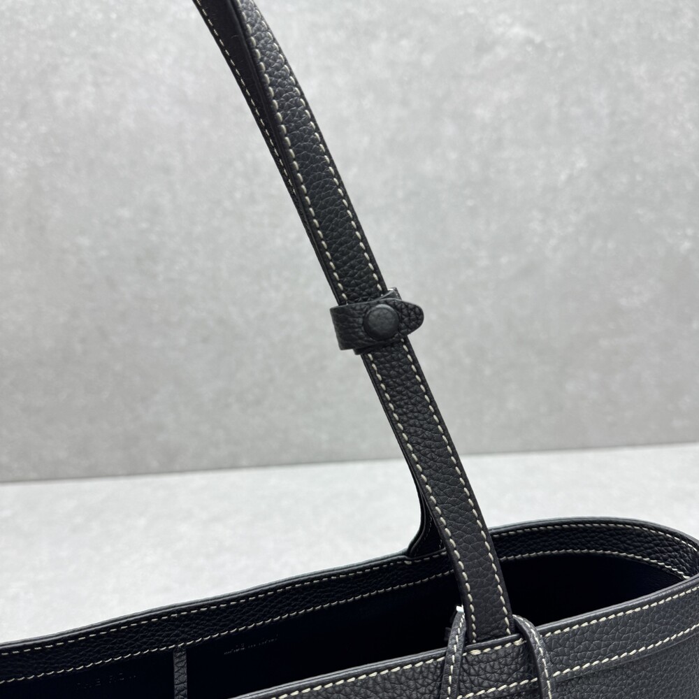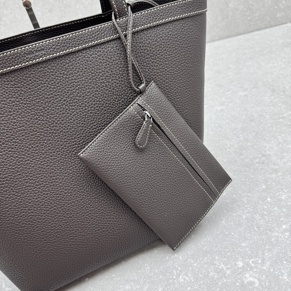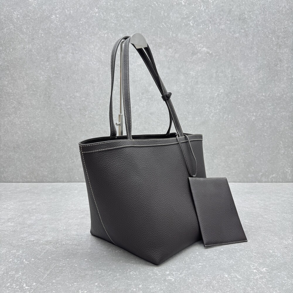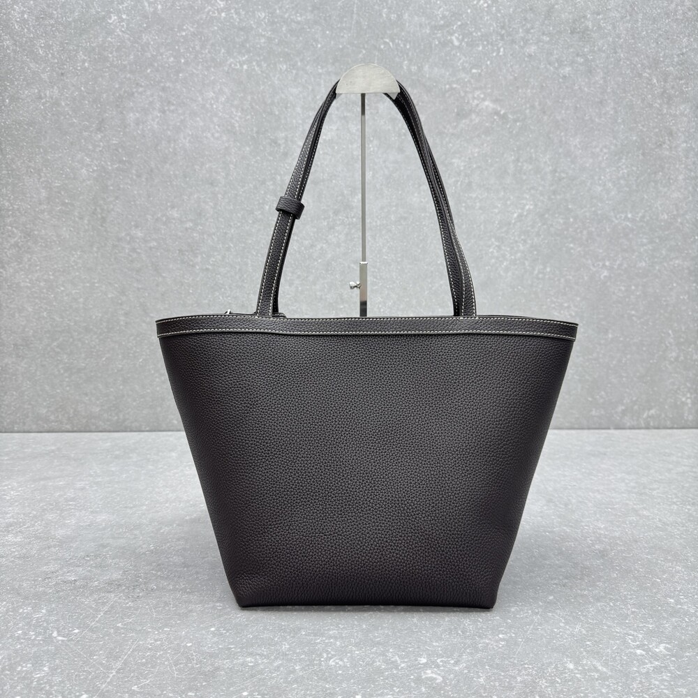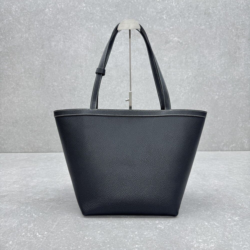 페블 그레인 송아지 가죽 소재의 클래식 토트백으로, 평평한 숄더 스트랩과 대비를 이루는 탑스티칭 디테일이 특징입니다.