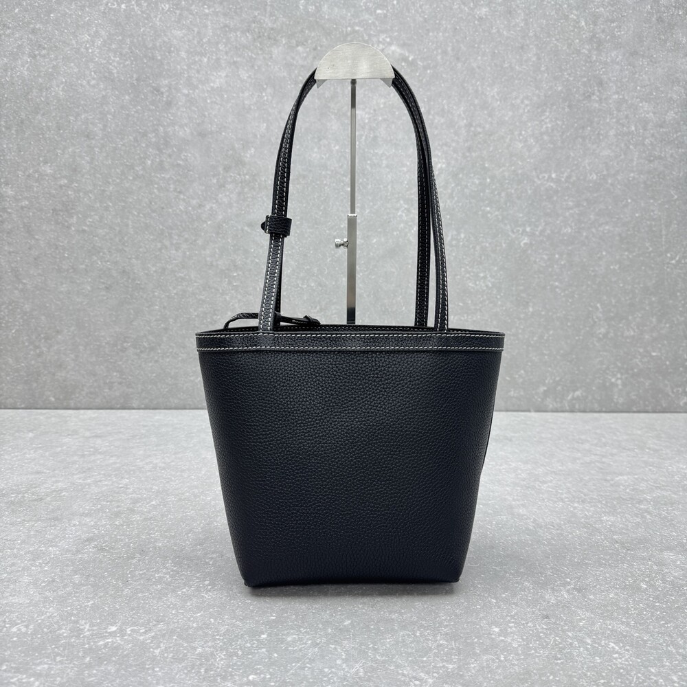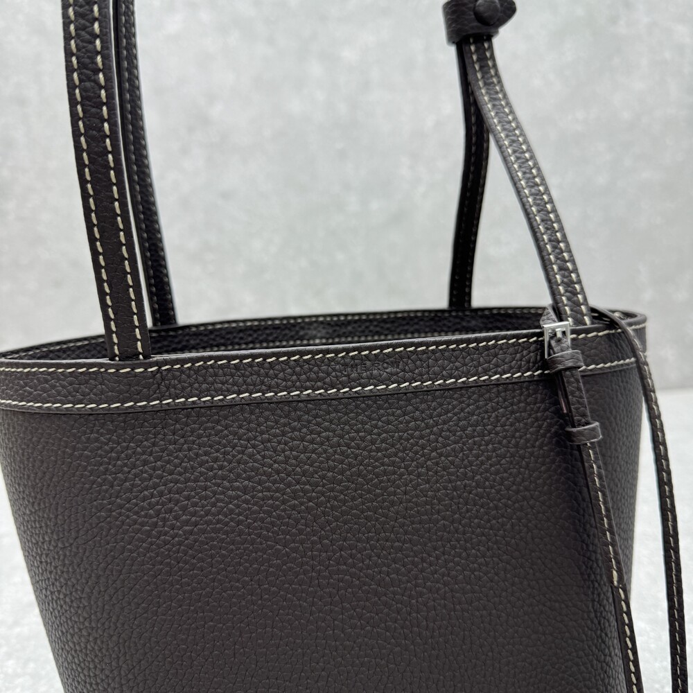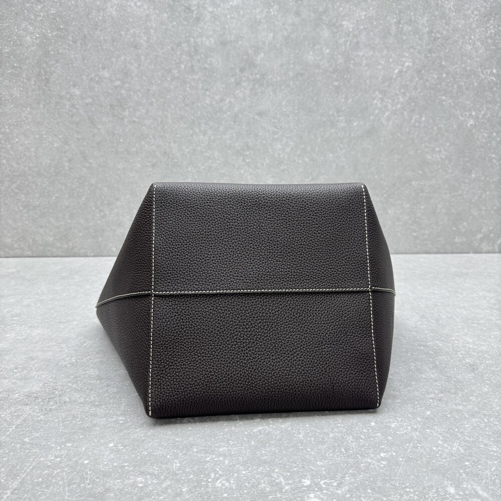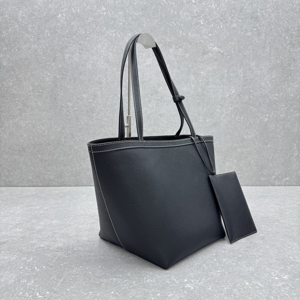 페블 그레인 송아지 가죽 소재의 클래식 토트백으로, 평평한 숄더 스트랩과 대비를 이루는 탑스티칭 디테일이 특징입니다.