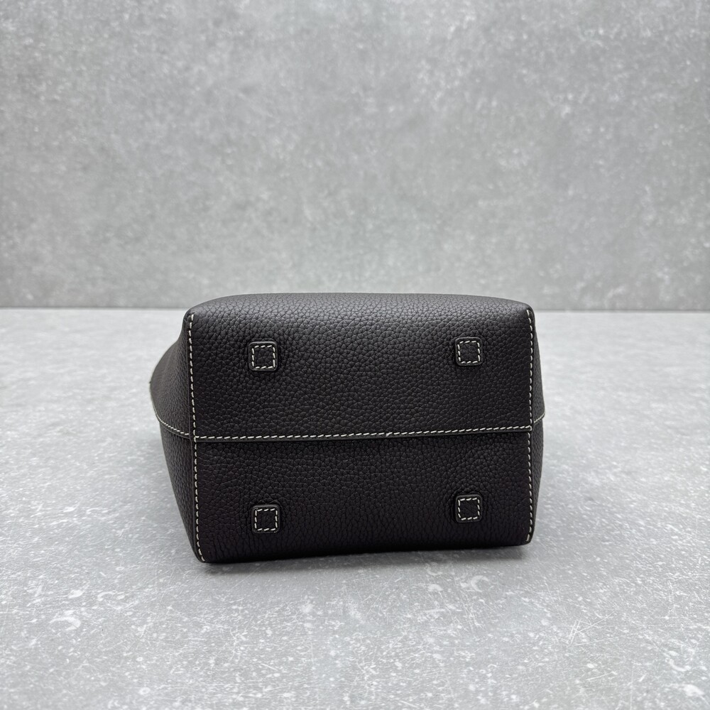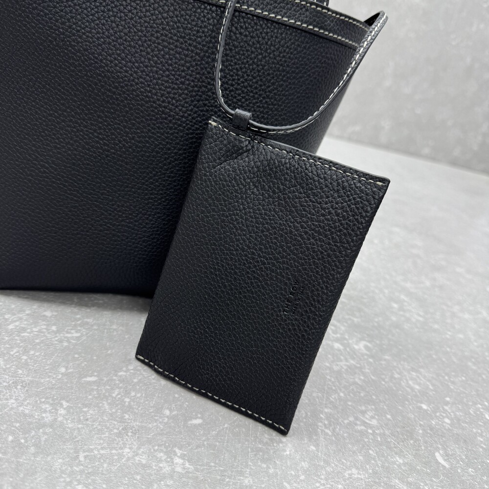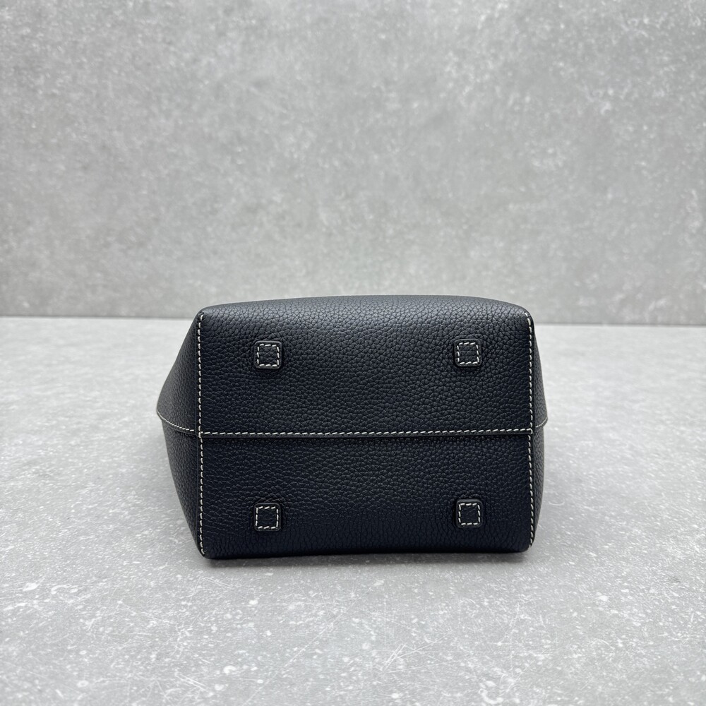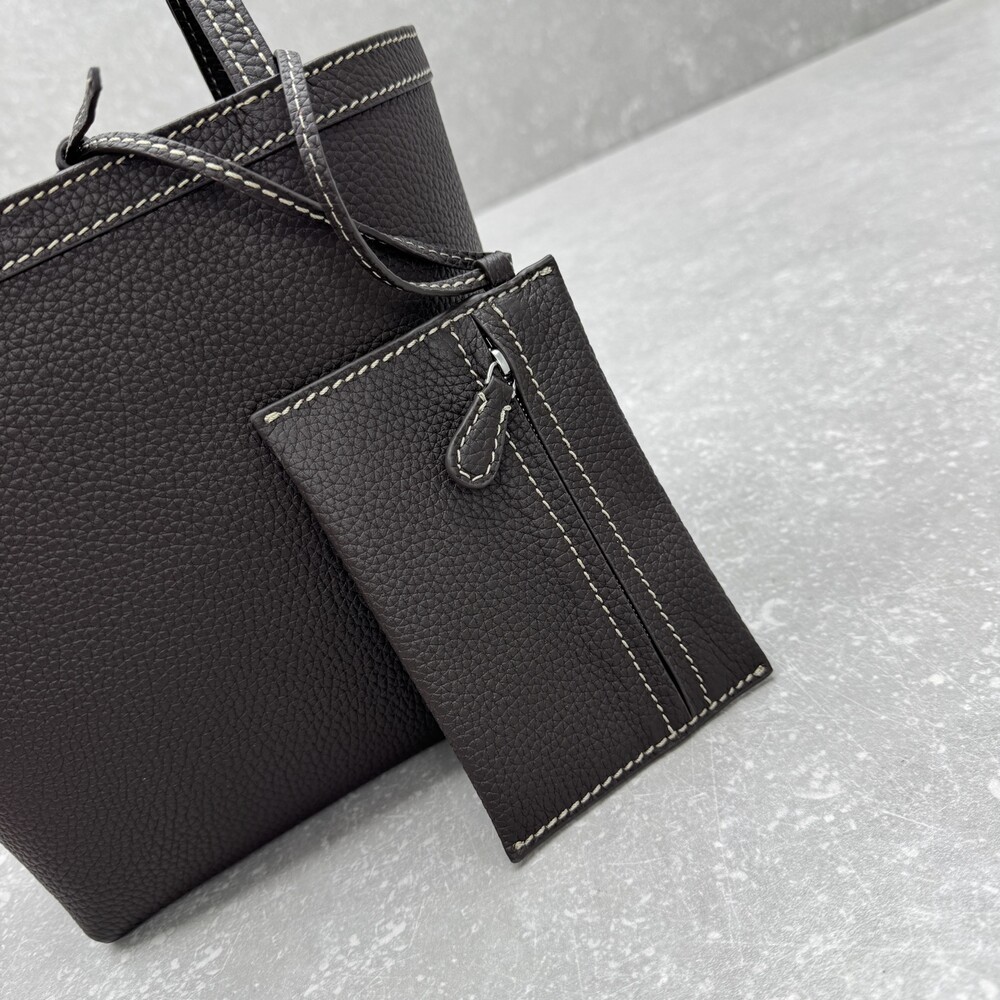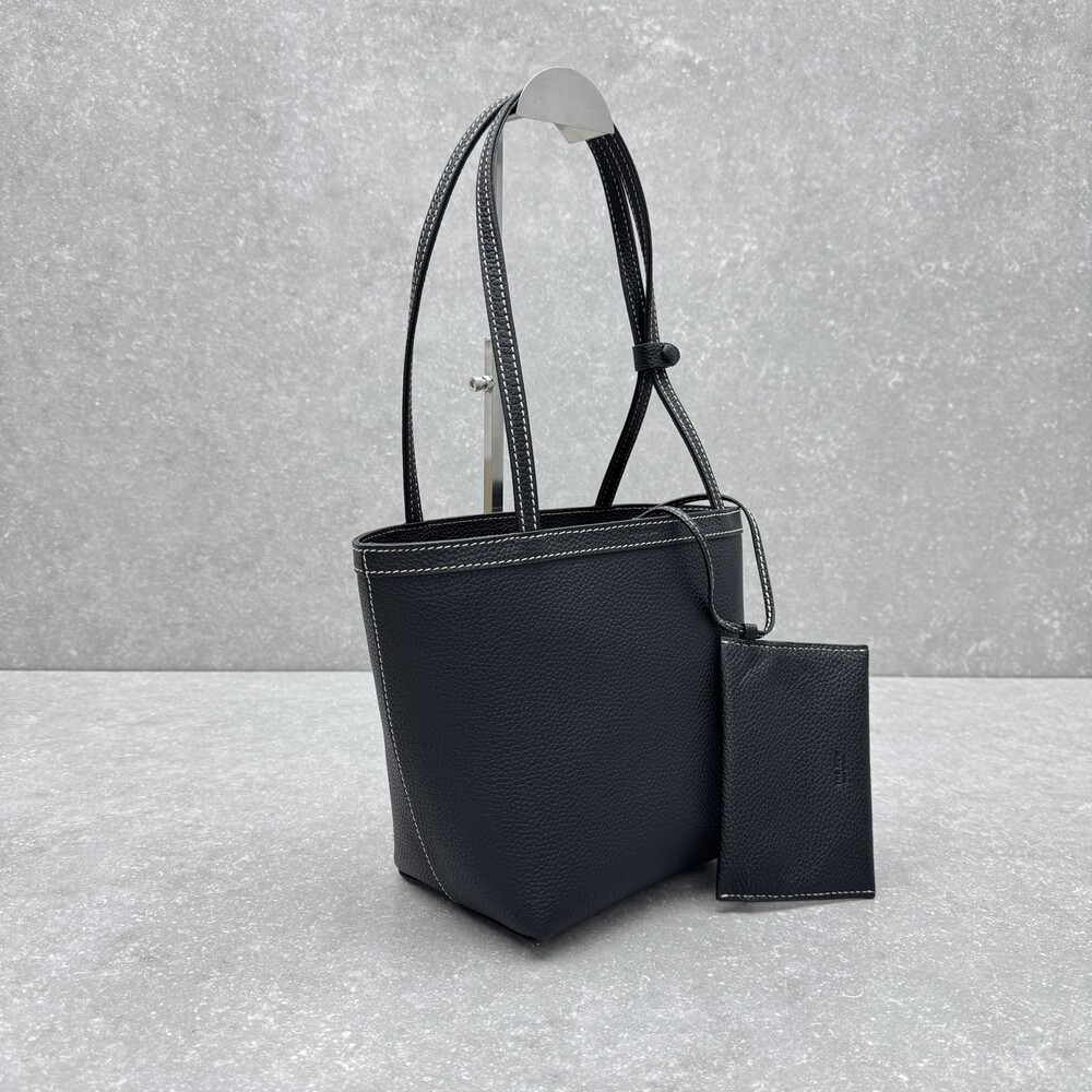 페블 그레인 송아지 가죽 소재의 클래식 토트백으로, 평평한 숄더 스트랩과 대비를 이루는 탑스티칭 디테일이 특징입니다.