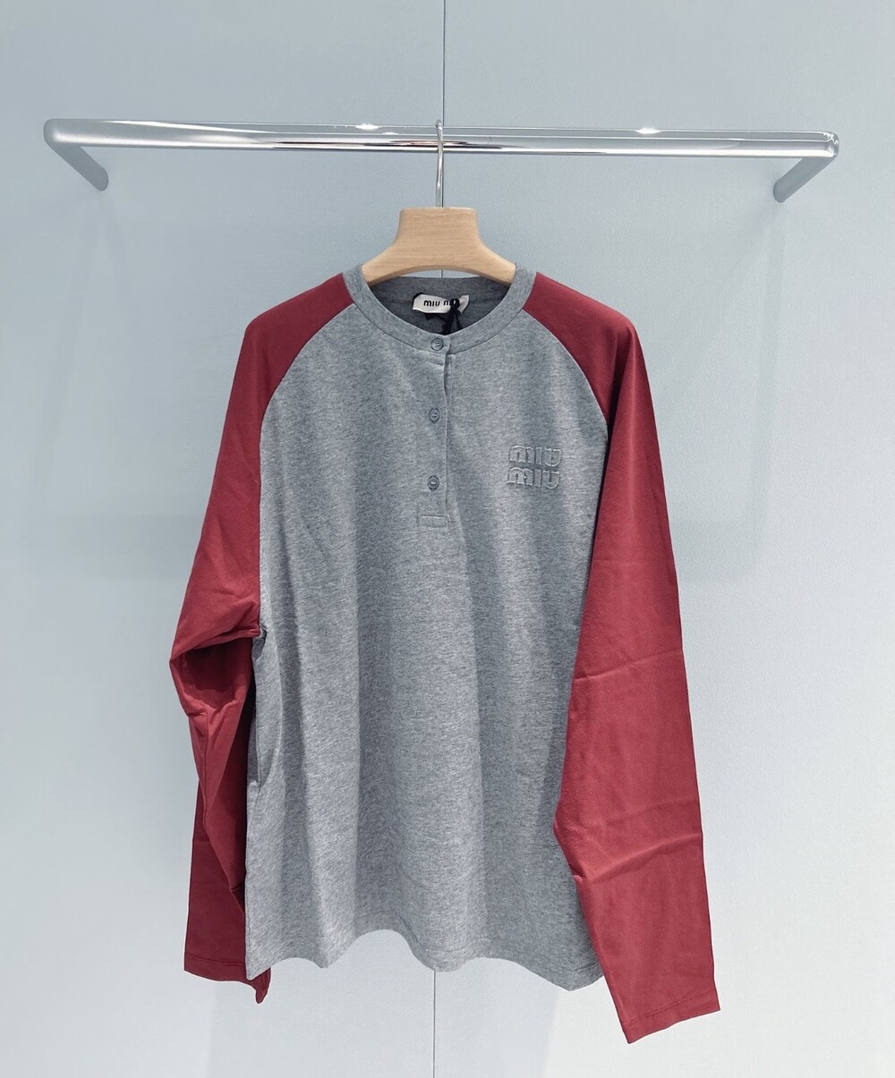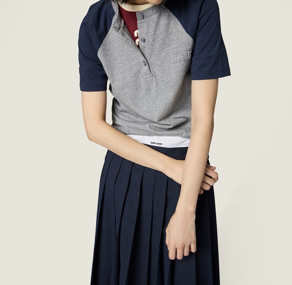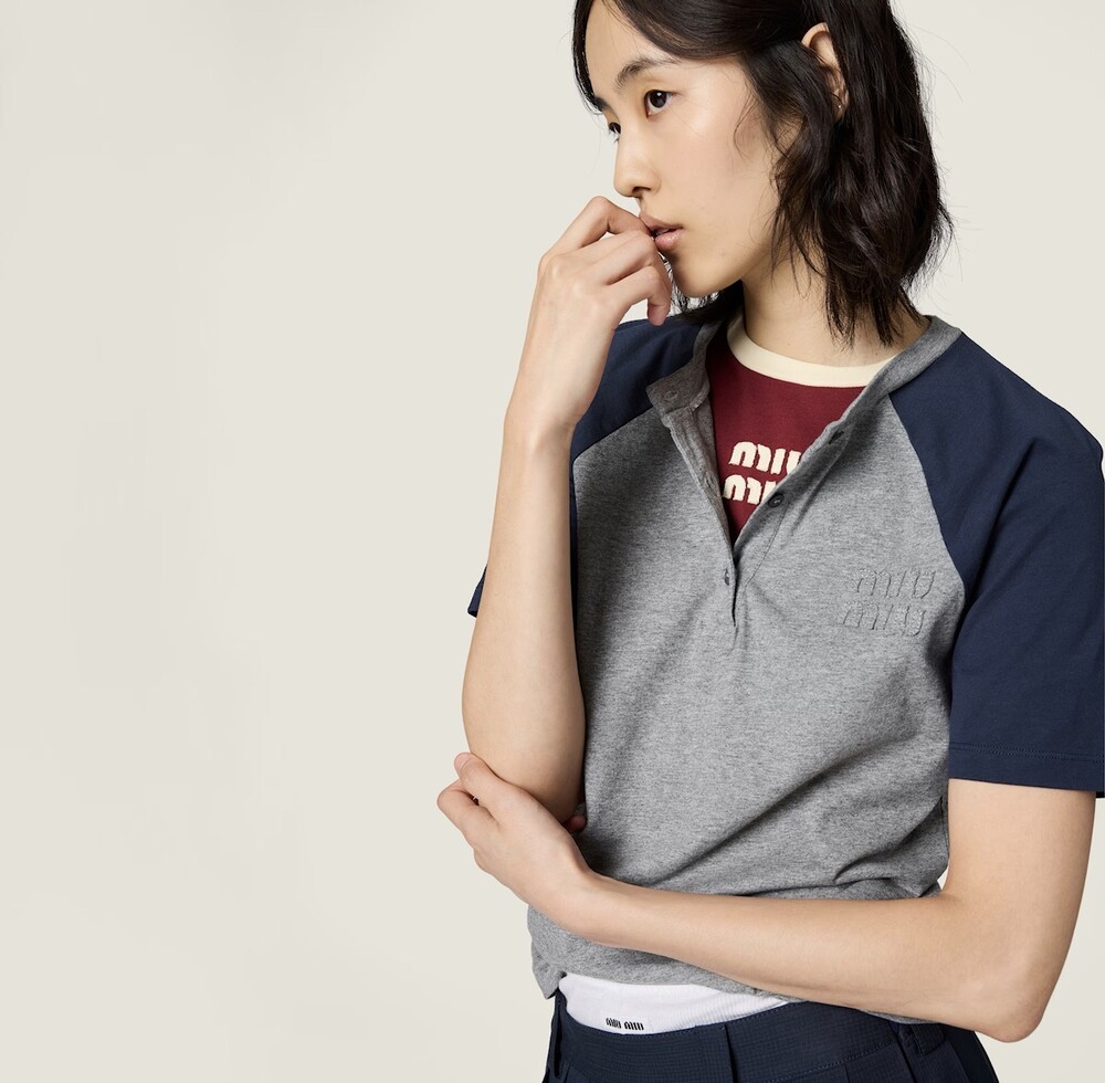 남성복에서 영감을 받은 가벼운 저지 소재 티셔츠로, 미우미우의 클래식한 매력이 시선을 사로잡습니다. 베이스볼 스타일 소매와 톤온톤 자수 로고가 어우러져 브랜드 특유의 스타일을 상징적으로 드러냅니다.