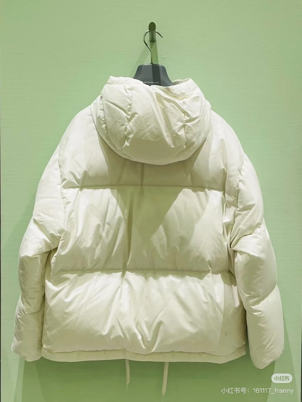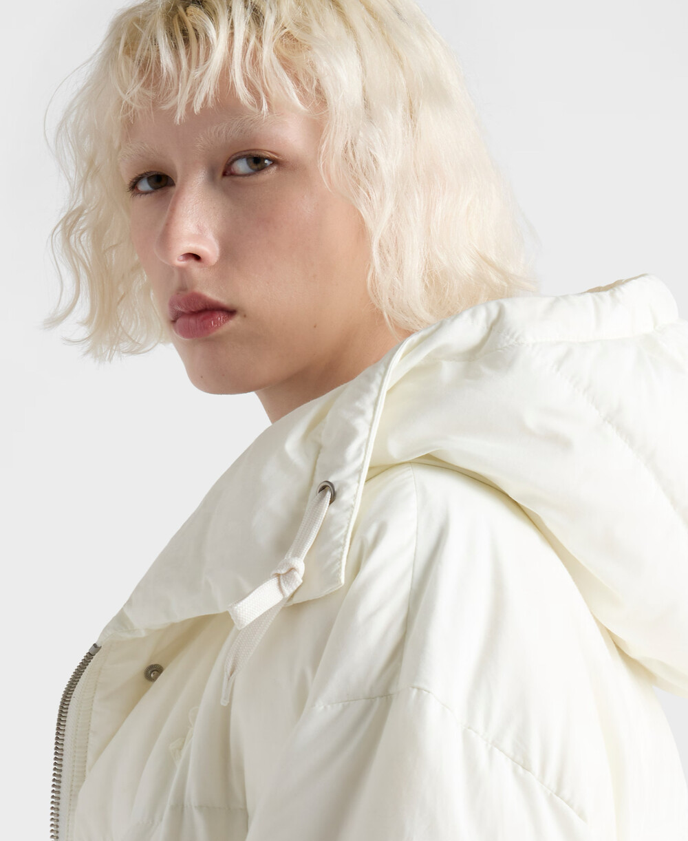 후드가 있는 포근한 실루엣을 가지고 있는 실용적이고 현대적인 다운 재킷입니다. 구스 다운 패딩이 부드러운 볼륨을 강조하며, 넉넉한 포켓과 에나멜 메탈 트라이앵글 로고로 장식되었습니다.