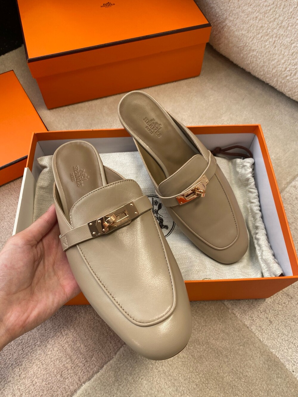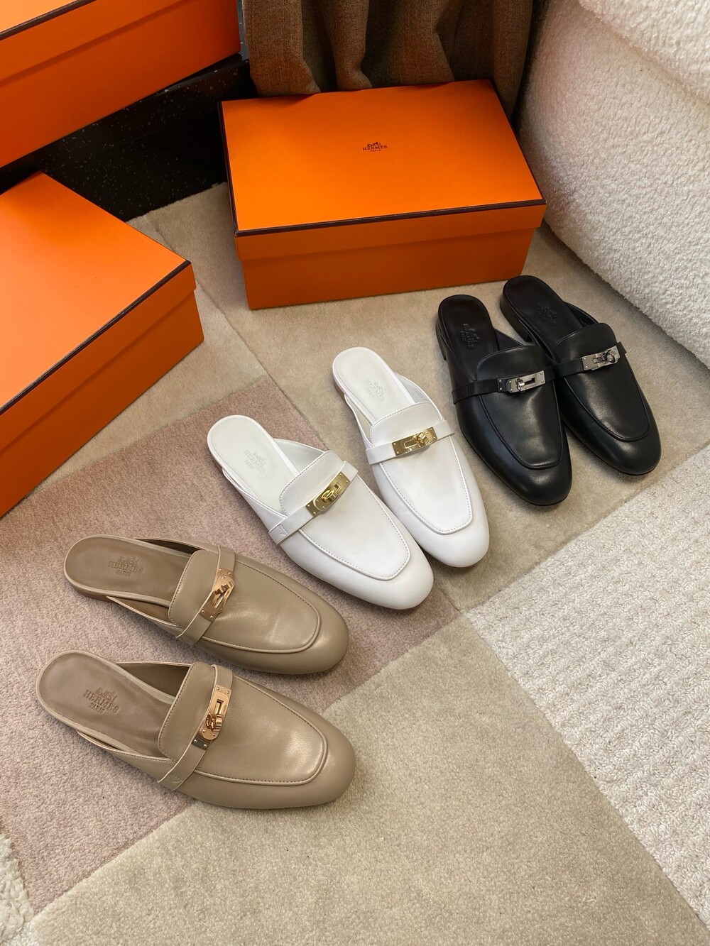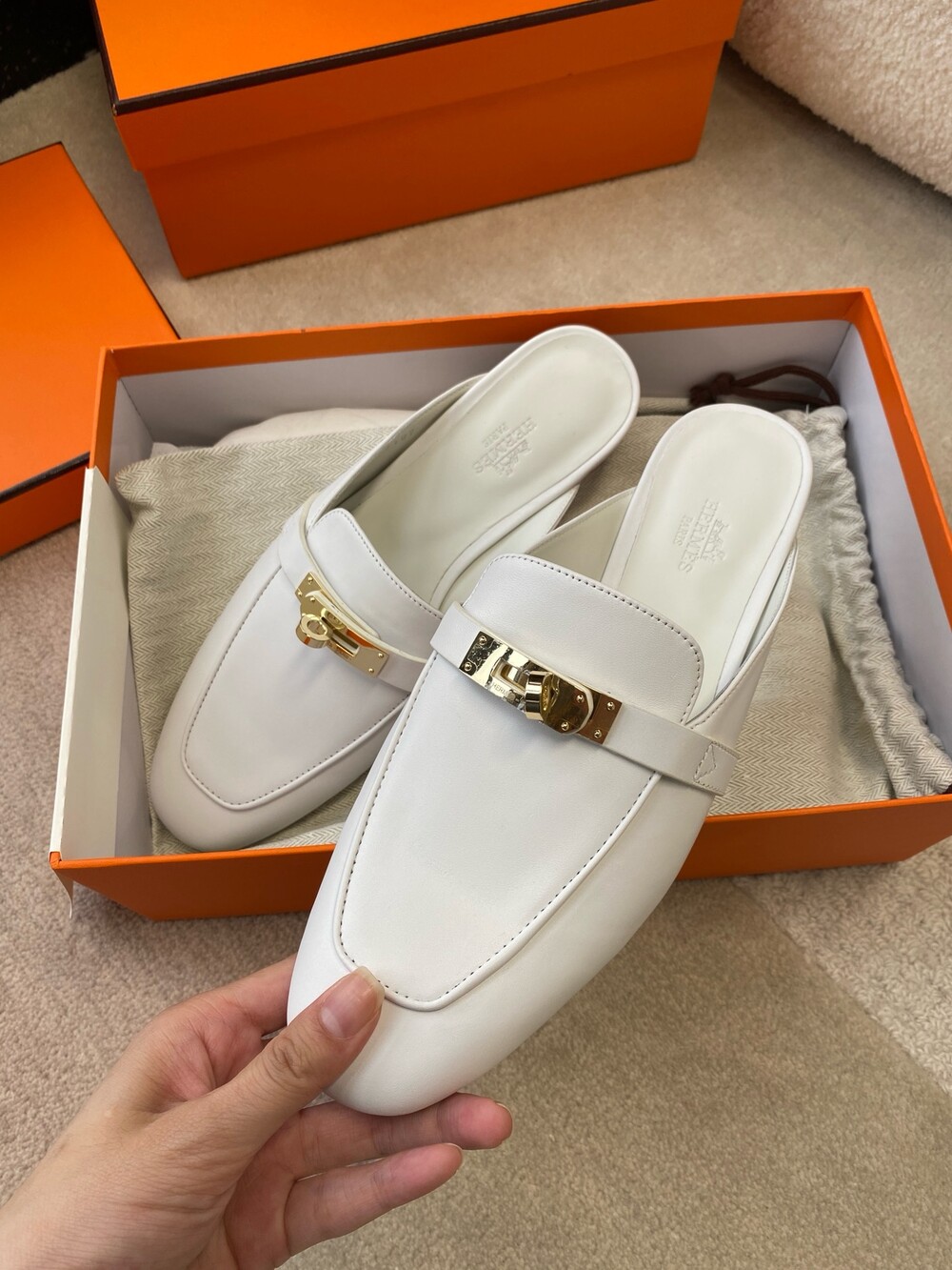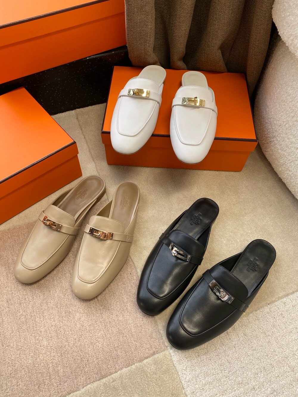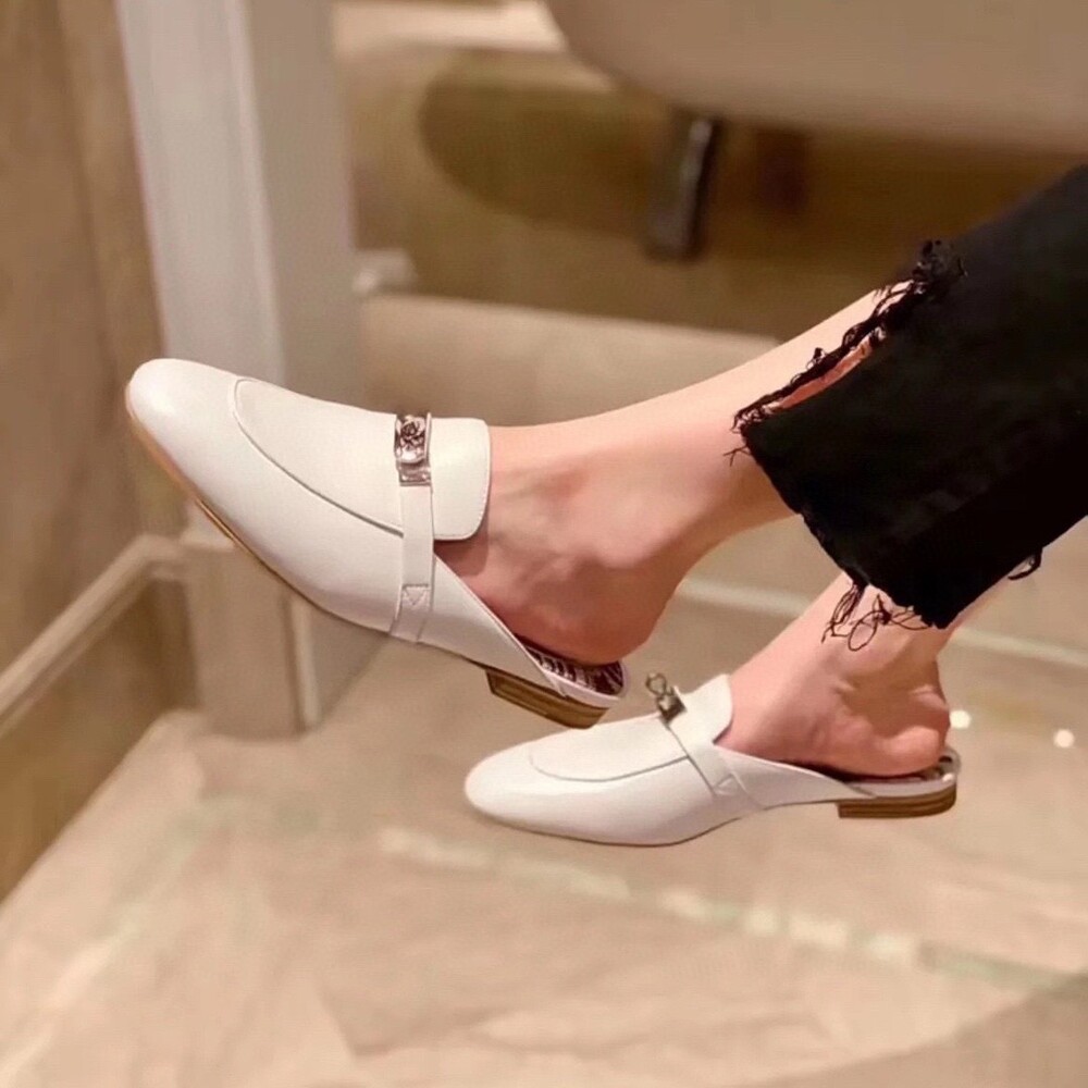 아이코닉 페르마브라스 도금 Kelly 버클이 특징인 카프스킨 소재의 뮬