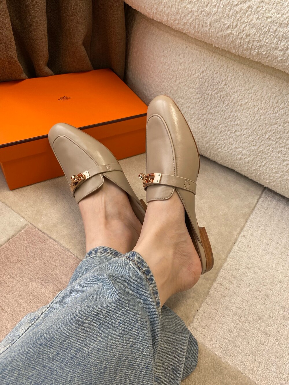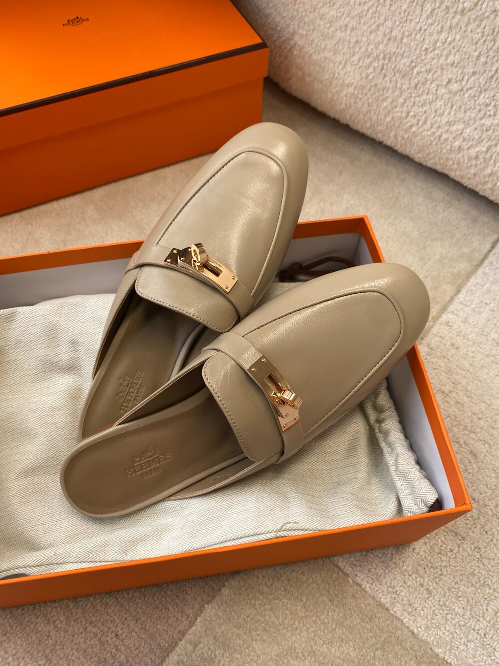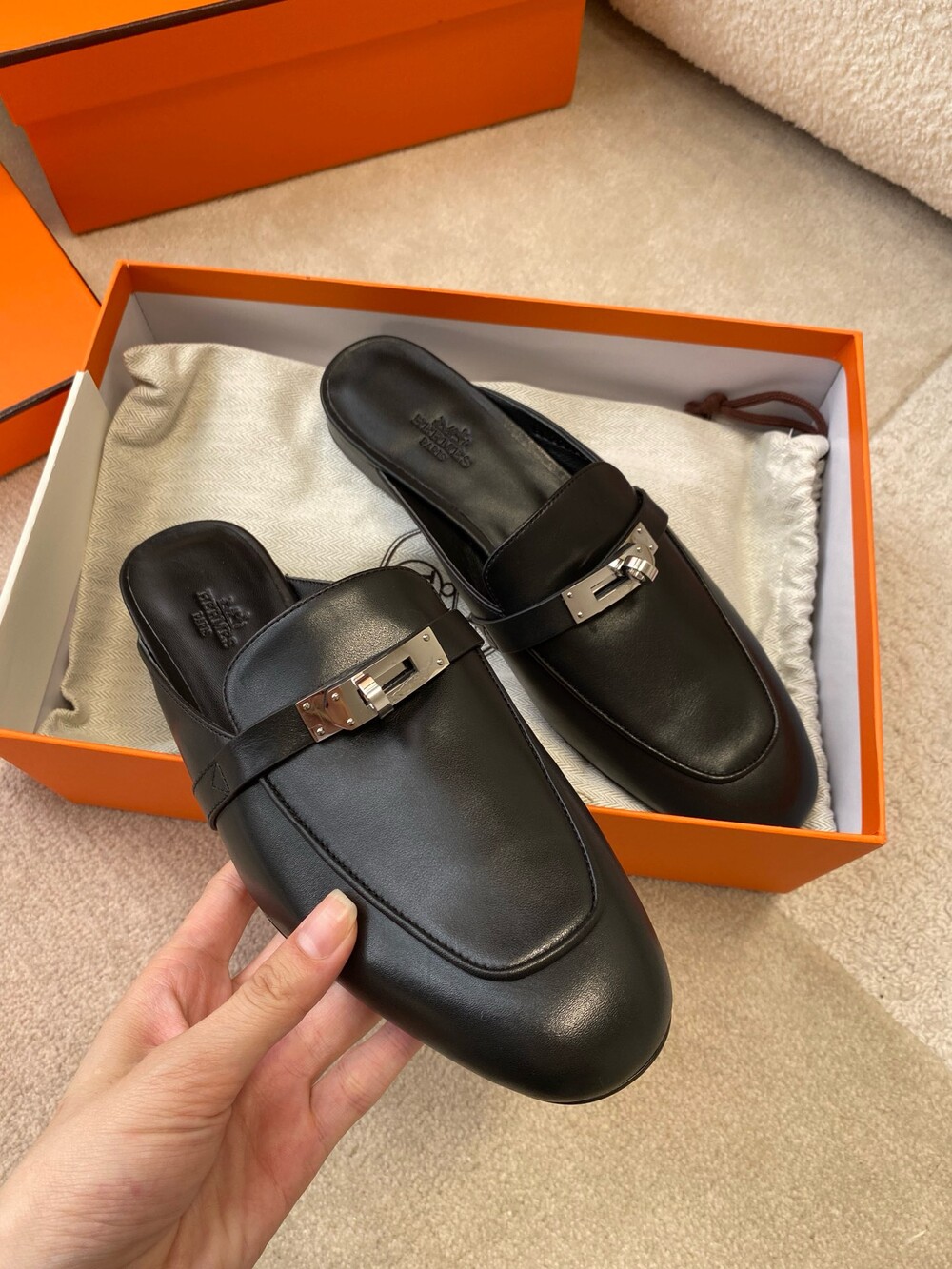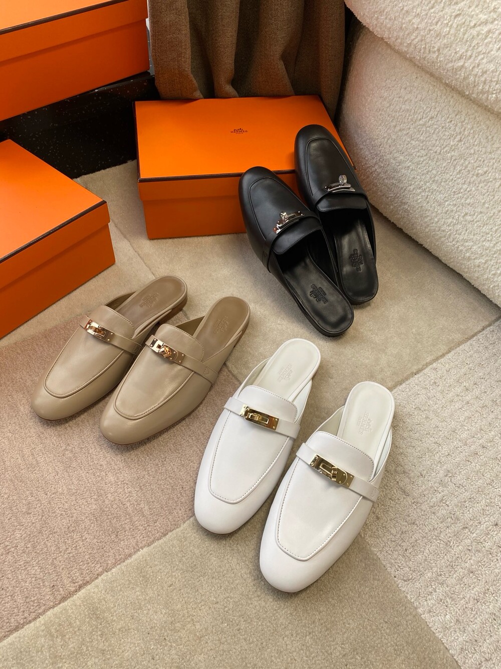 아이코닉 페르마브라스 도금 Kelly 버클이 특징인 카프스킨 소재의 뮬