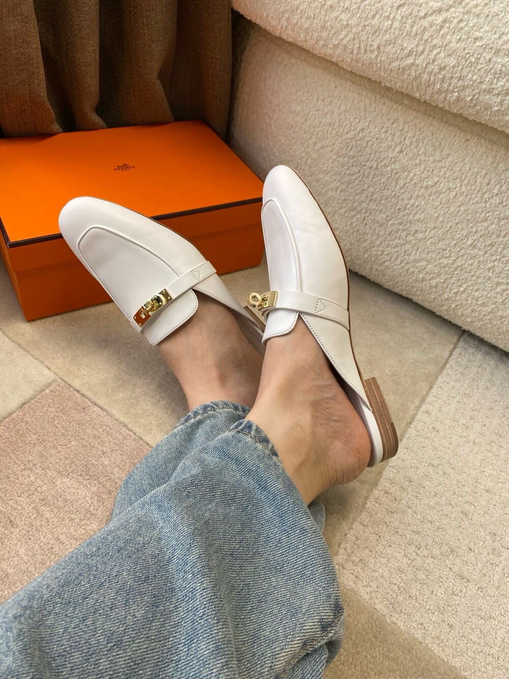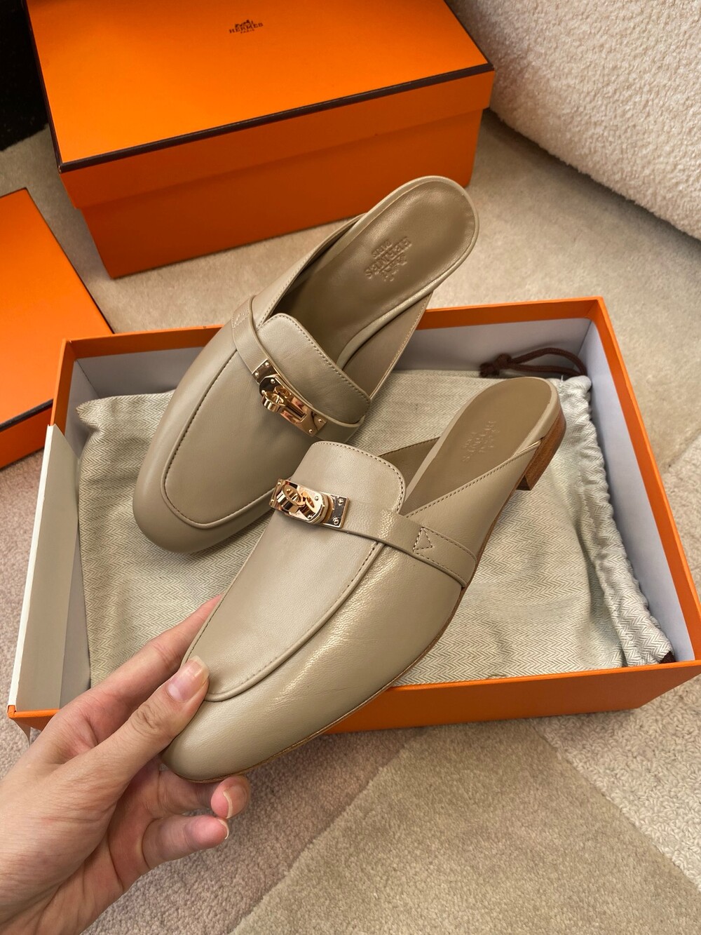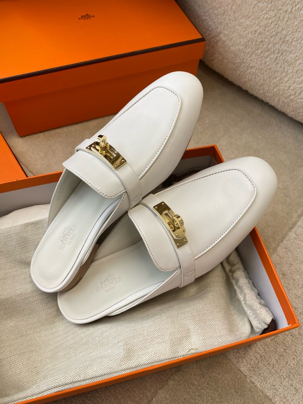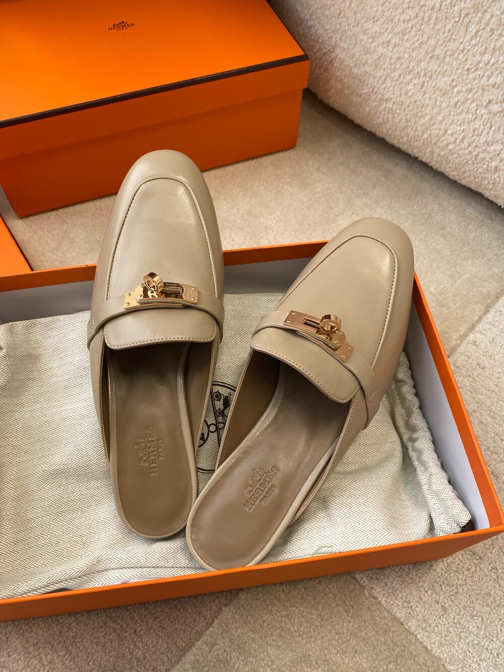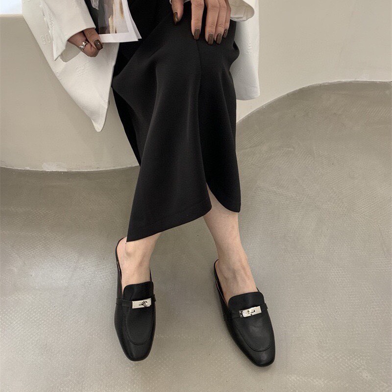 아이코닉 페르마브라스 도금 Kelly 버클이 특징인 카프스킨 소재의 뮬