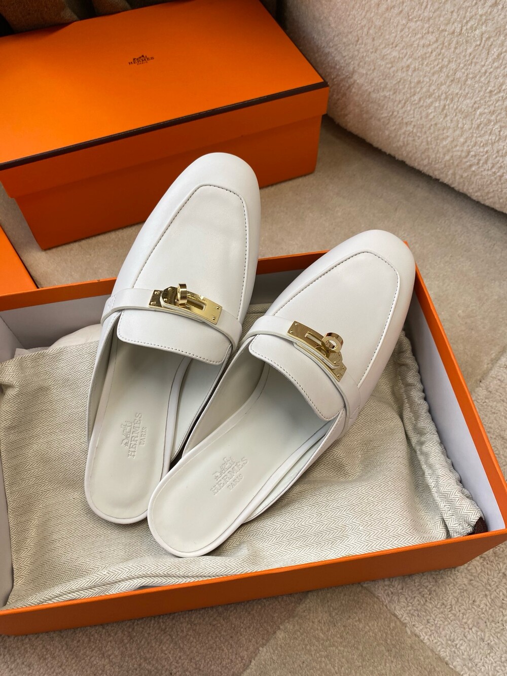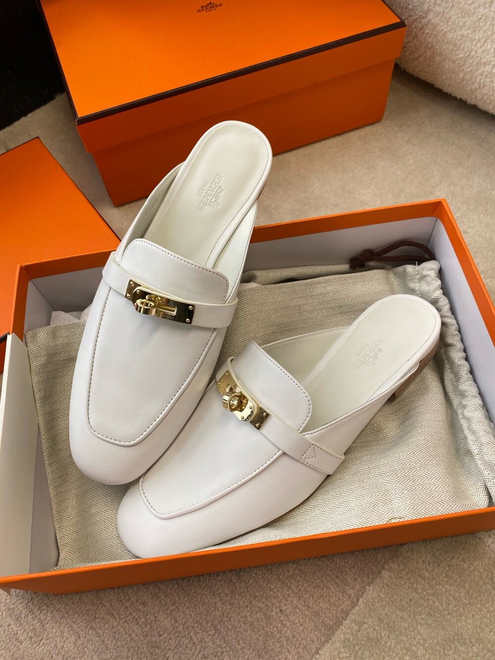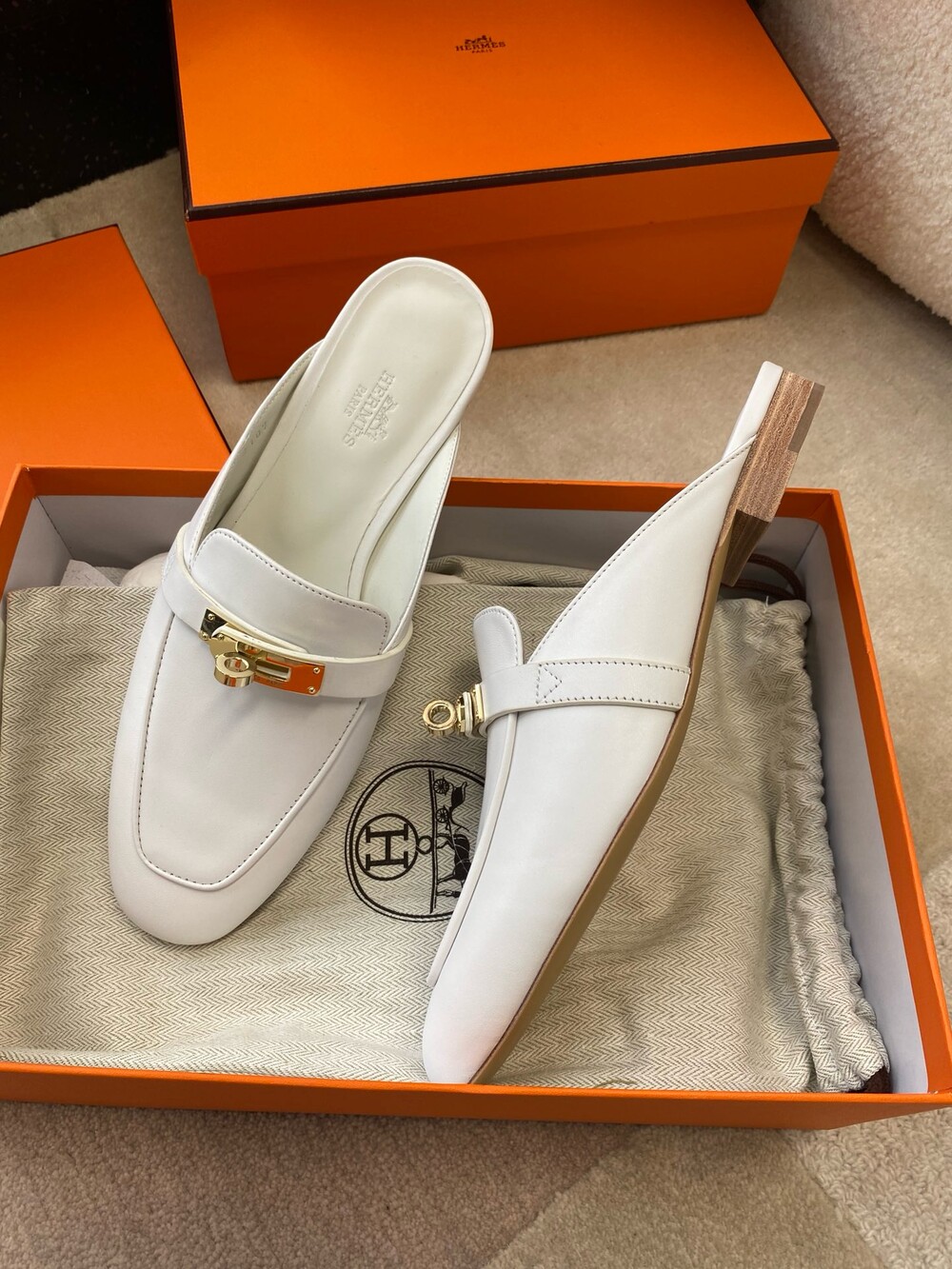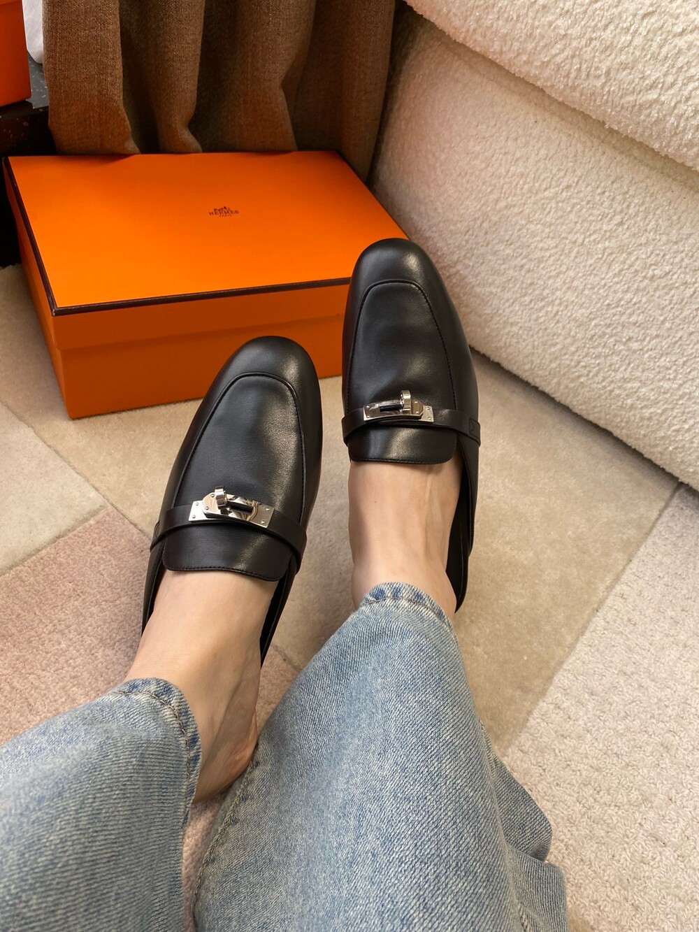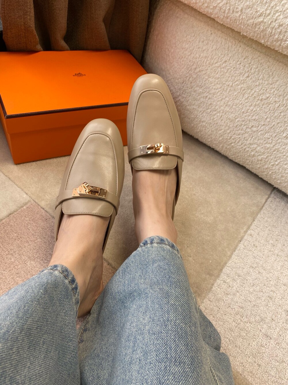 아이코닉 페르마브라스 도금 Kelly 버클이 특징인 카프스킨 소재의 뮬