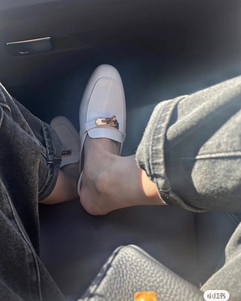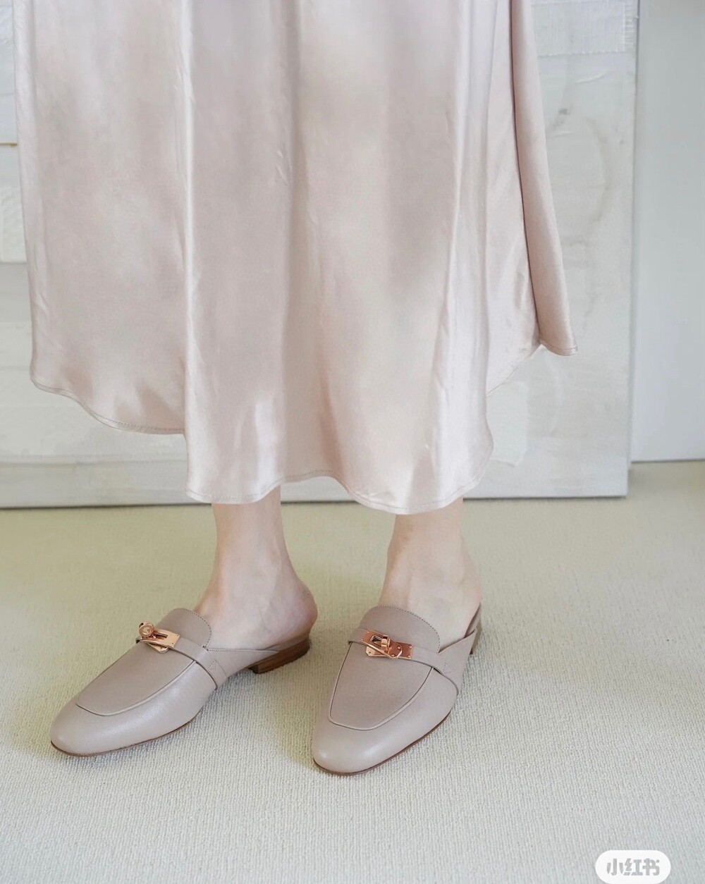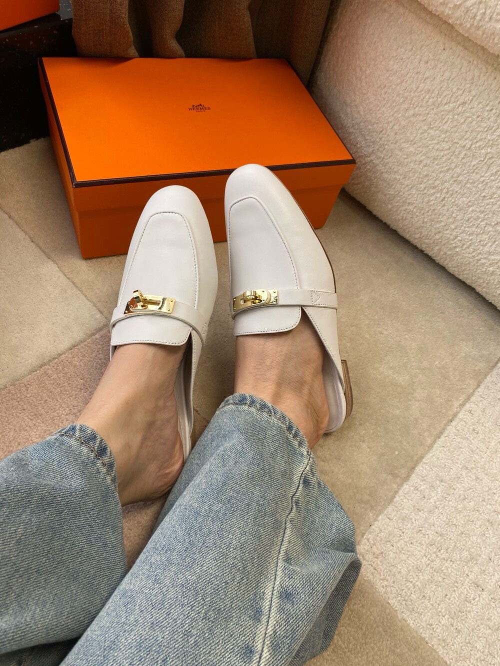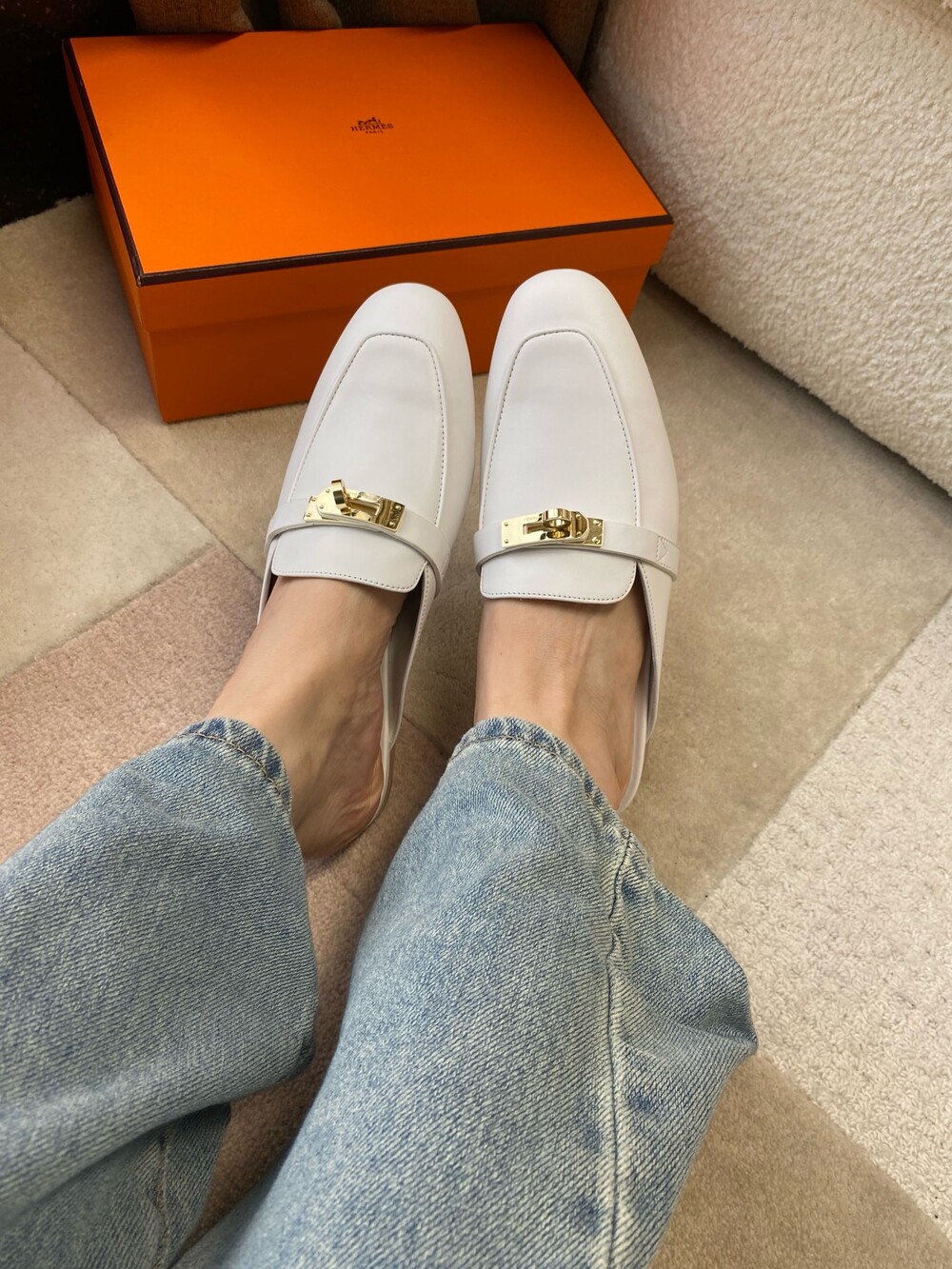 아이코닉 페르마브라스 도금 Kelly 버클이 특징인 카프스킨 소재의 뮬