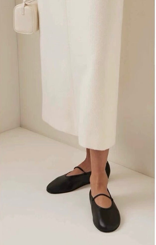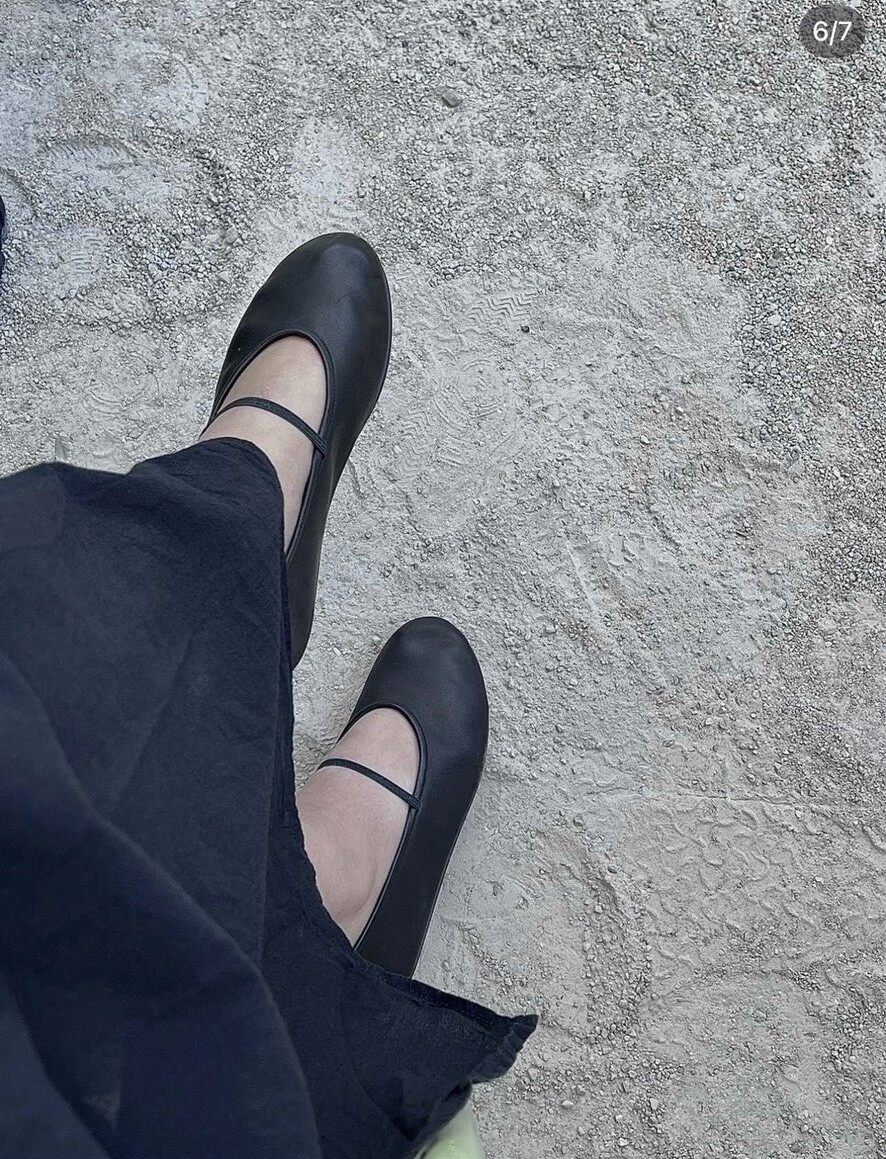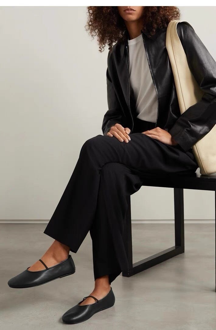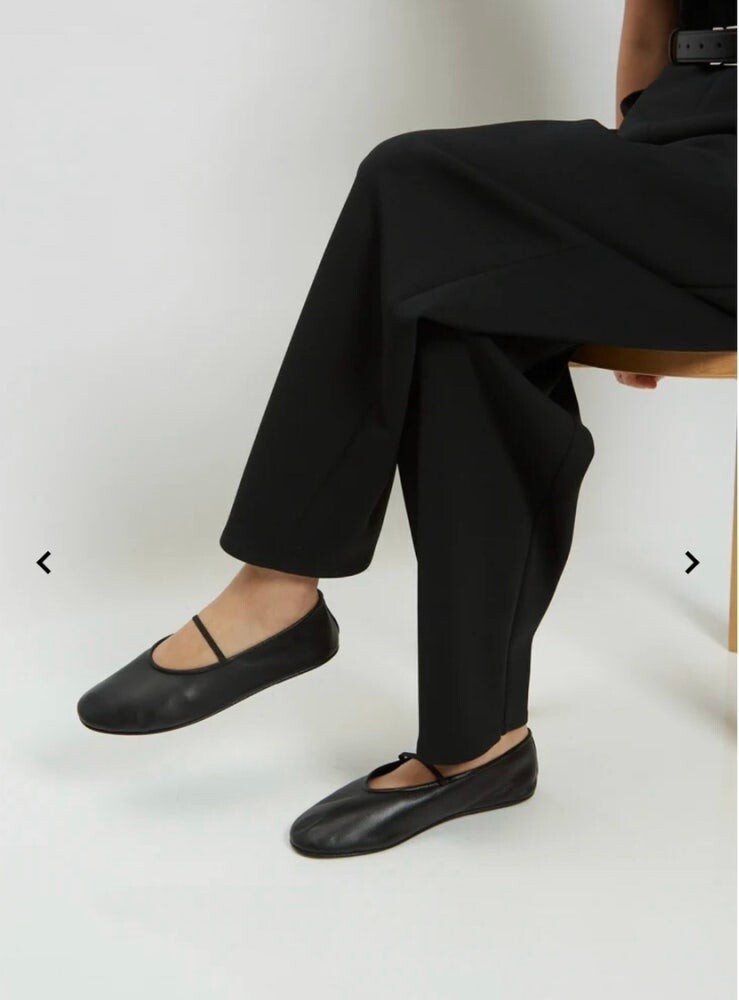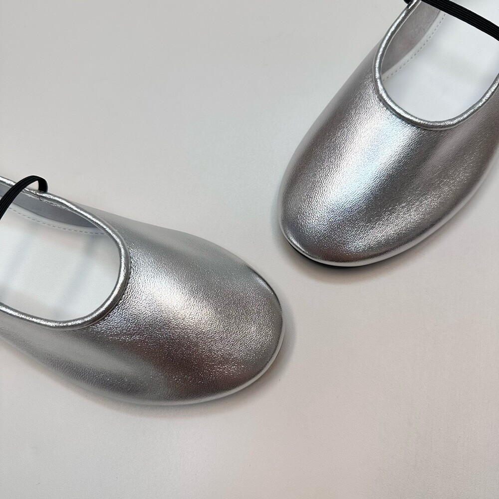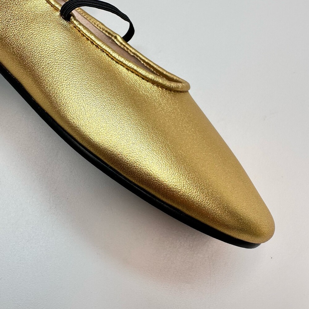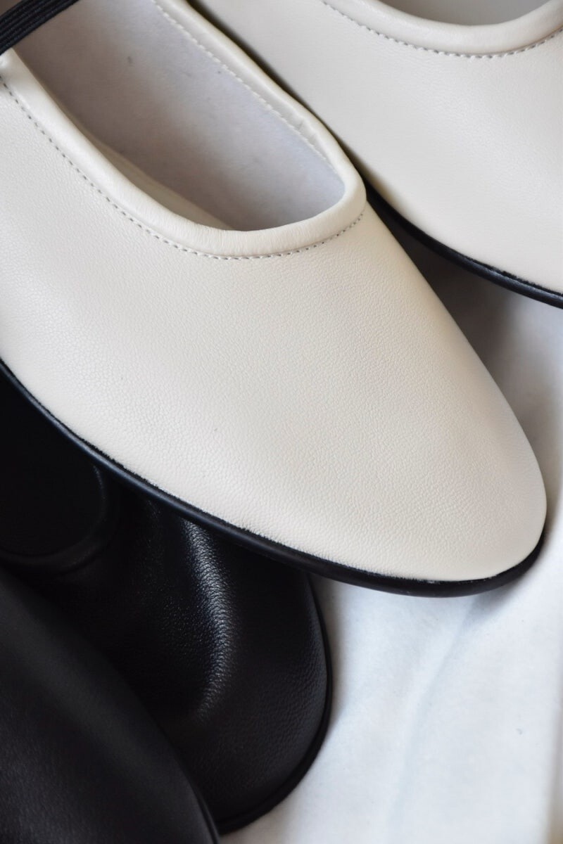 유연한 디컨스트럭티드 카프스킨 나파 가죽 소재의 클래식 발레 슬리퍼. 라운드 토 및 발등 부분의 섬세한 엘라스틱 스트랩.