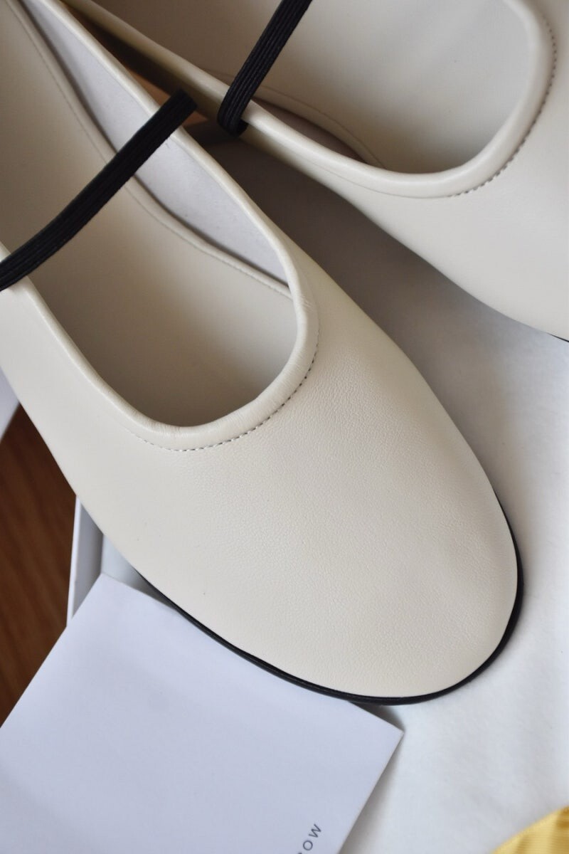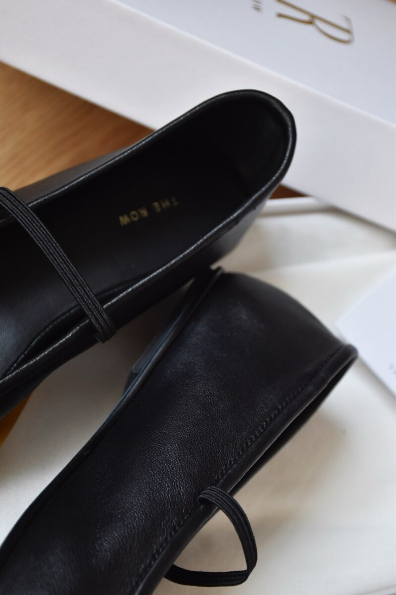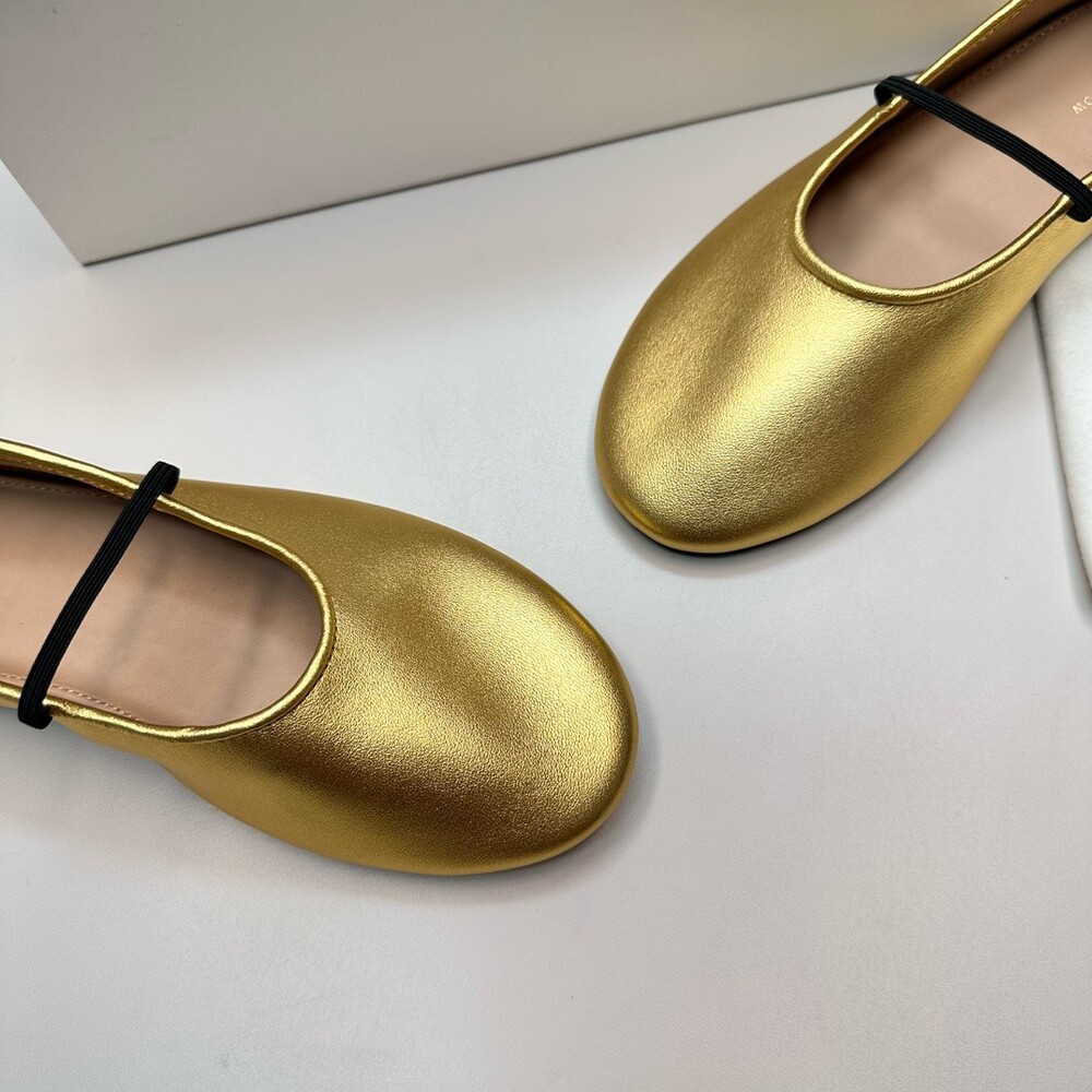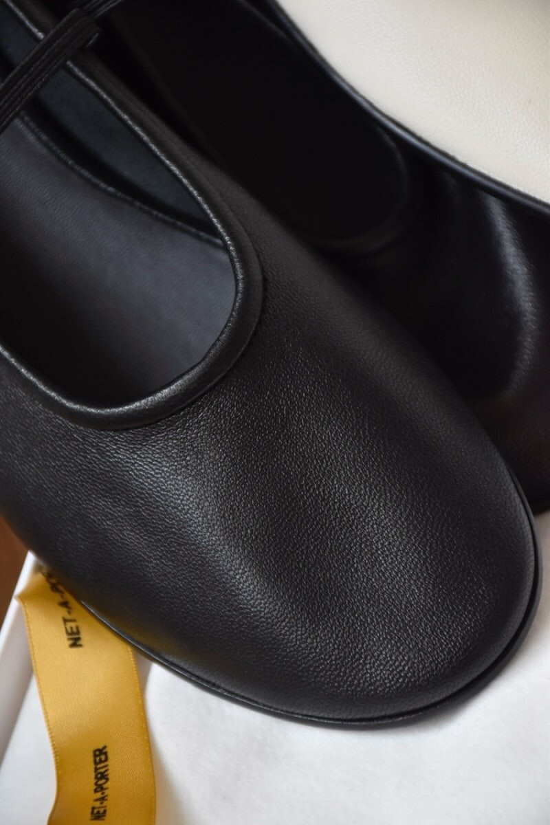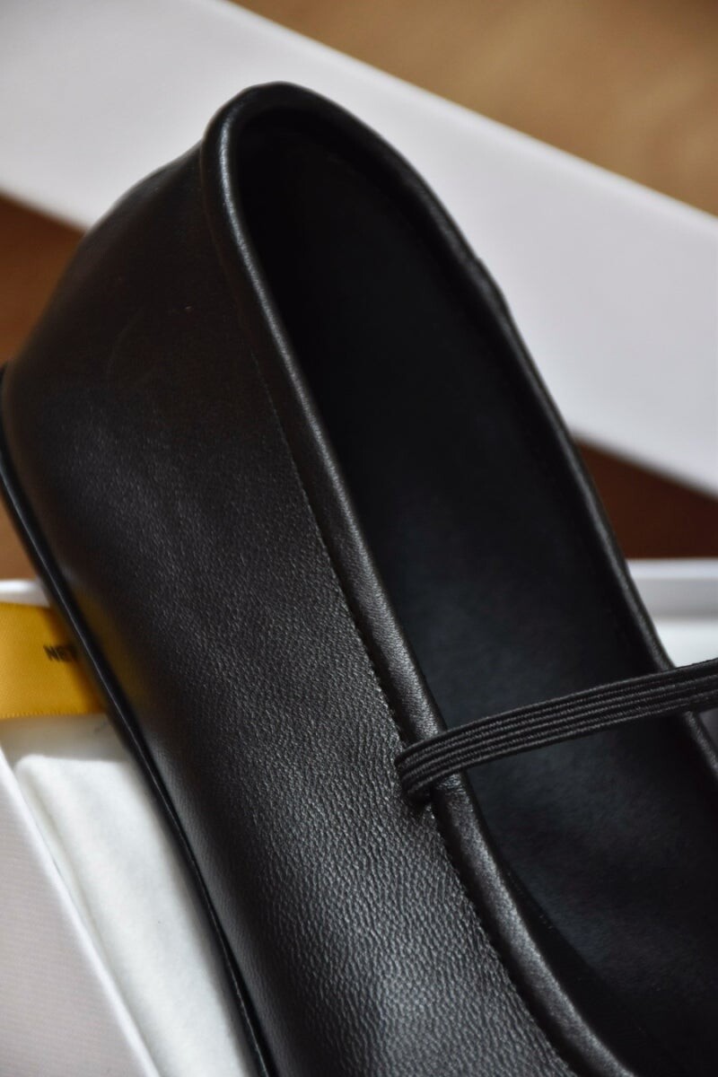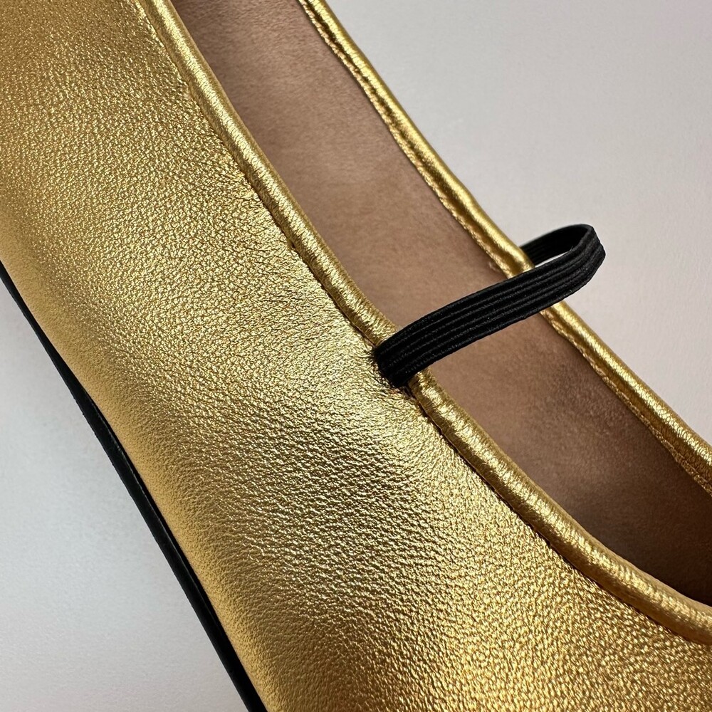 유연한 디컨스트럭티드 카프스킨 나파 가죽 소재의 클래식 발레 슬리퍼. 라운드 토 및 발등 부분의 섬세한 엘라스틱 스트랩.