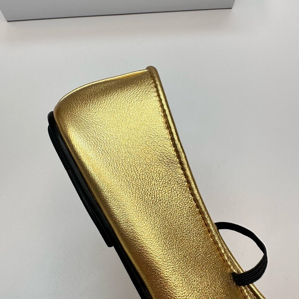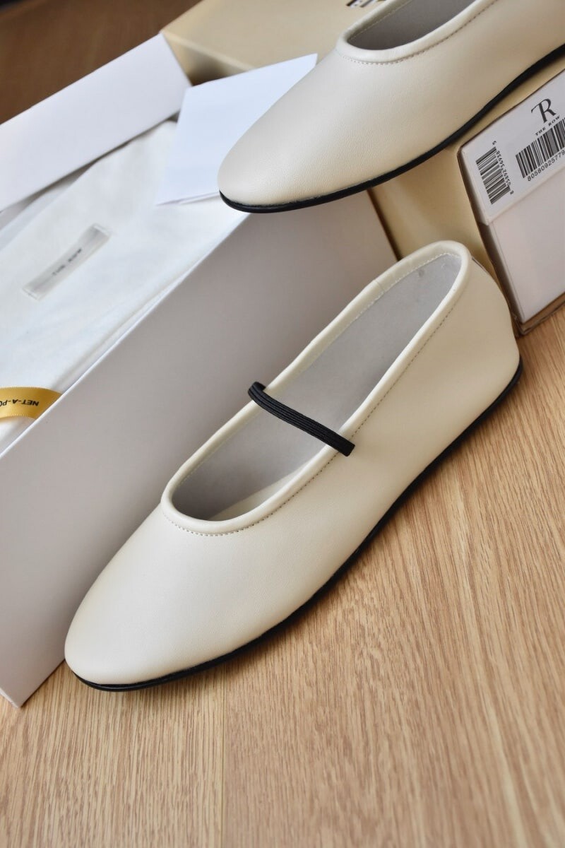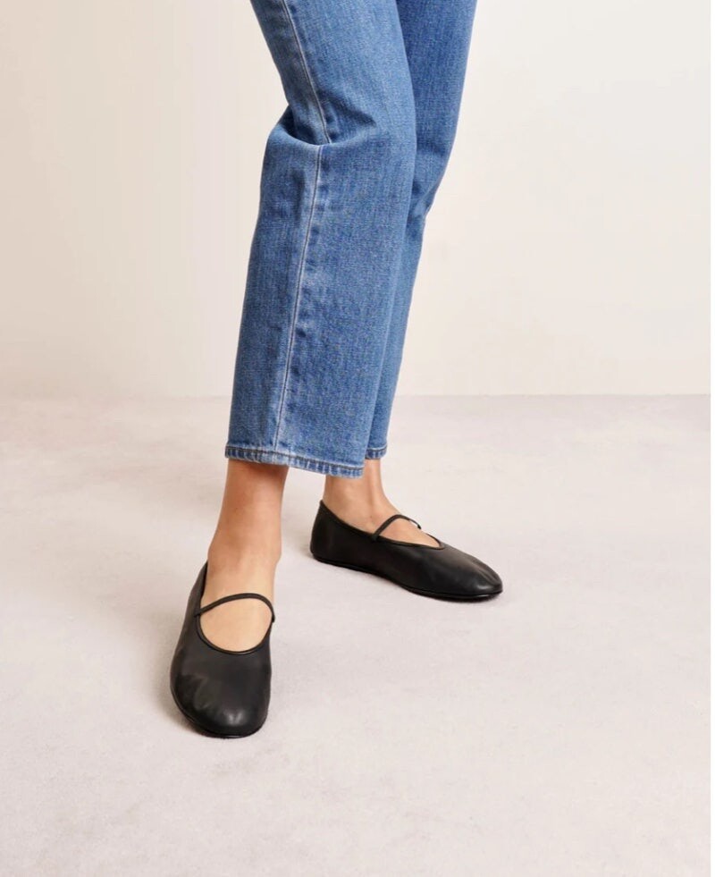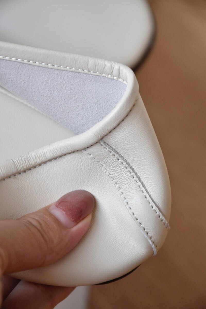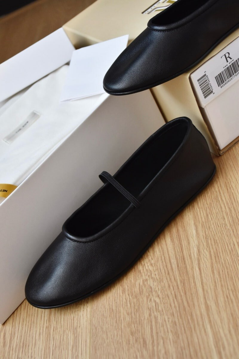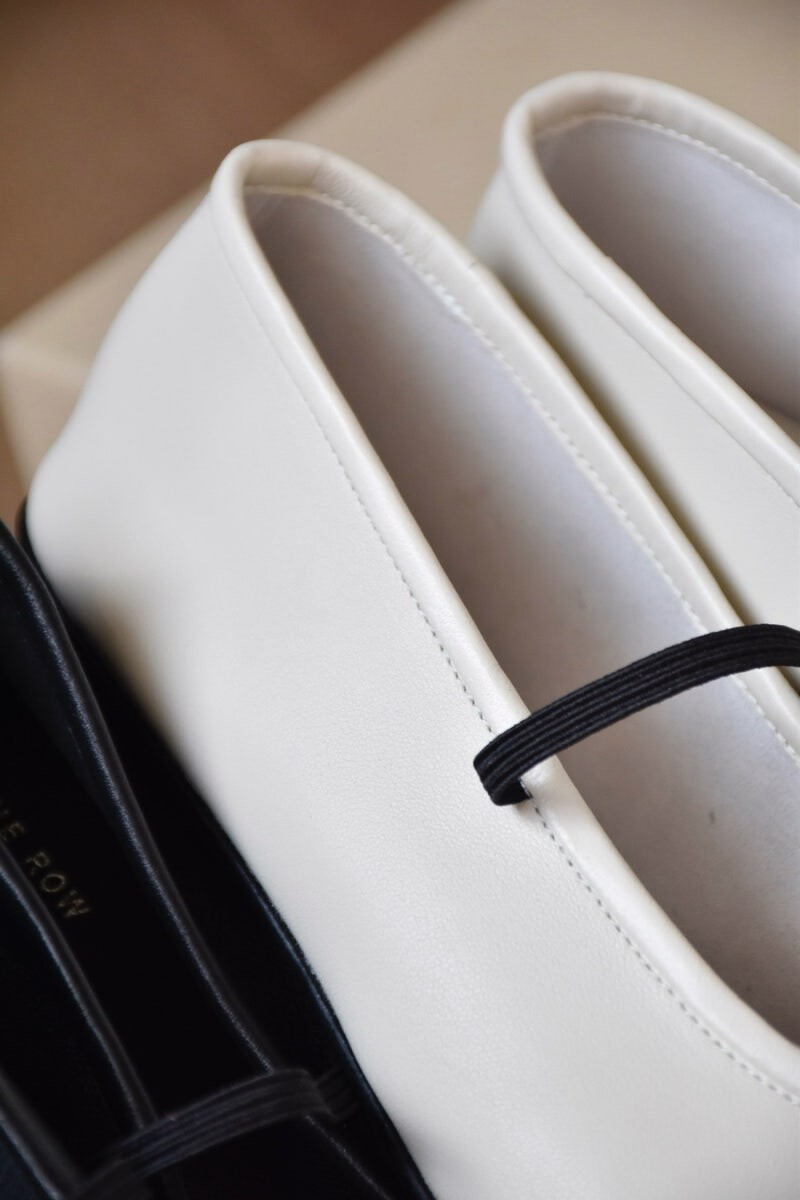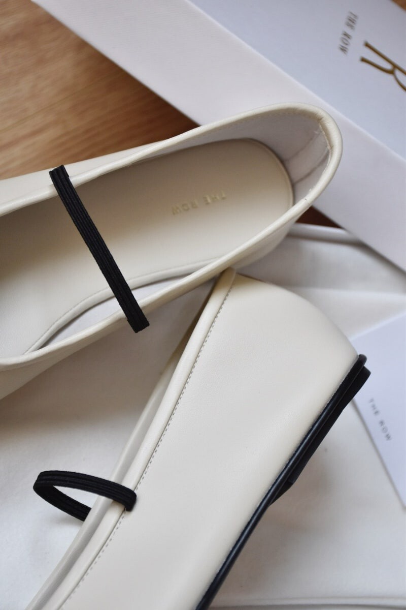 유연한 디컨스트럭티드 카프스킨 나파 가죽 소재의 클래식 발레 슬리퍼. 라운드 토 및 발등 부분의 섬세한 엘라스틱 스트랩.