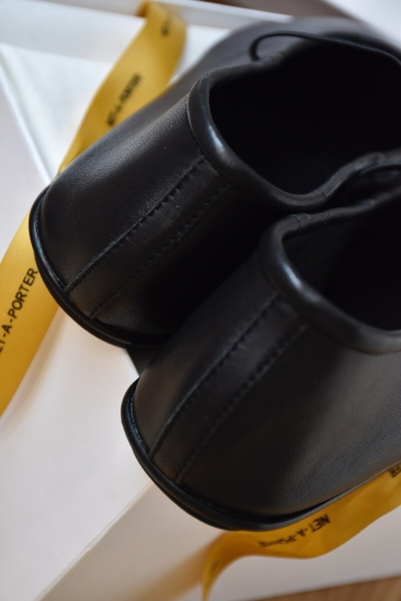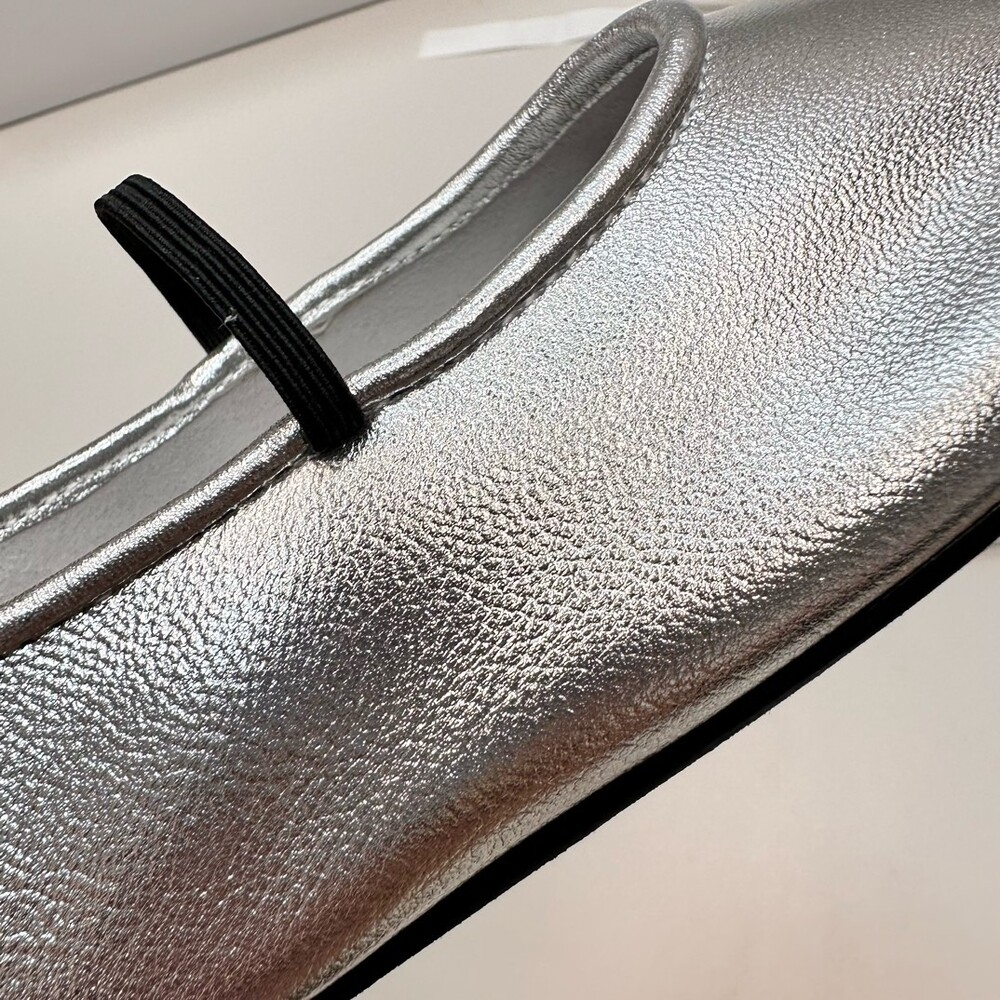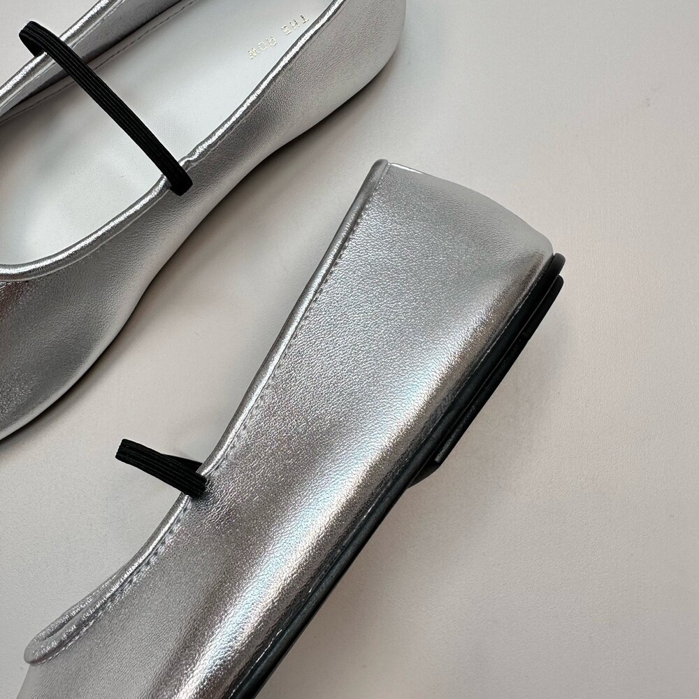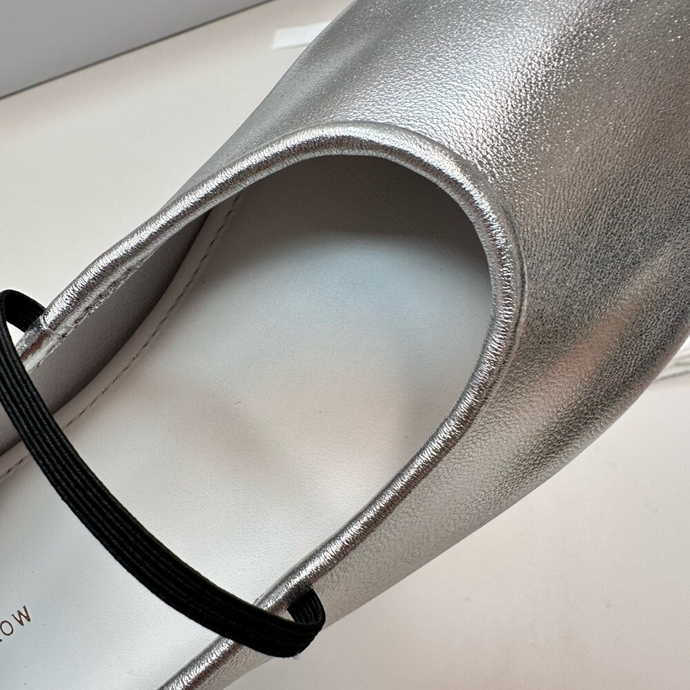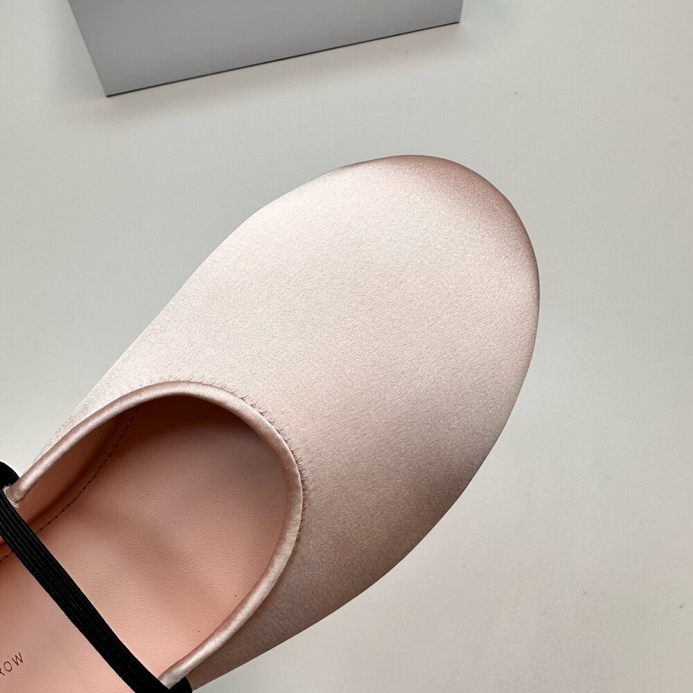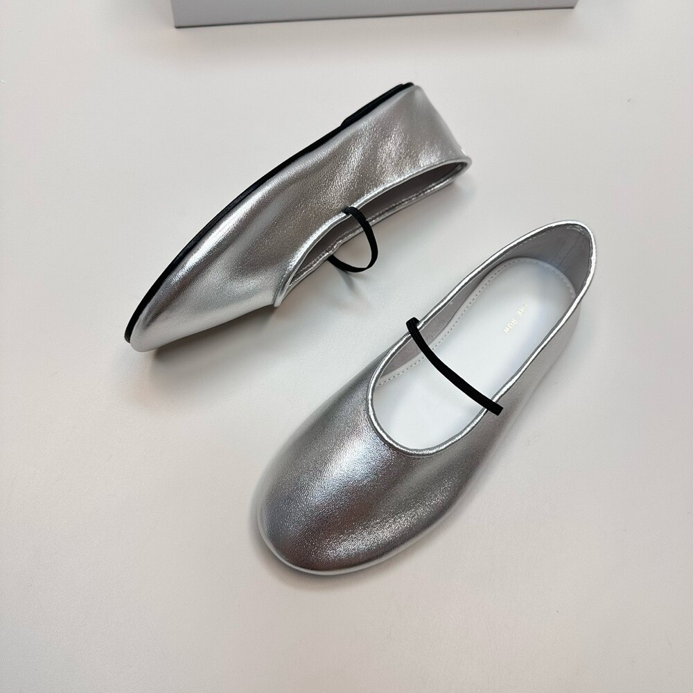 유연한 디컨스트럭티드 카프스킨 나파 가죽 소재의 클래식 발레 슬리퍼. 라운드 토 및 발등 부분의 섬세한 엘라스틱 스트랩.