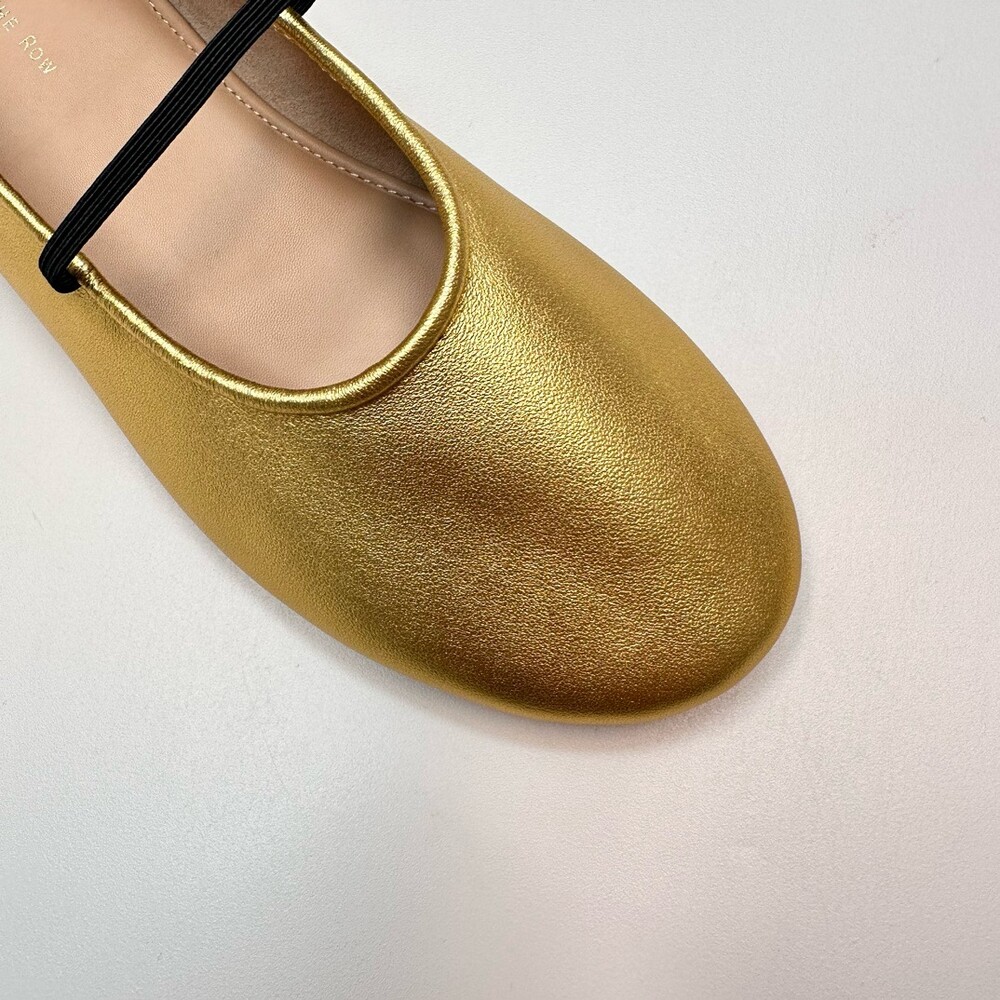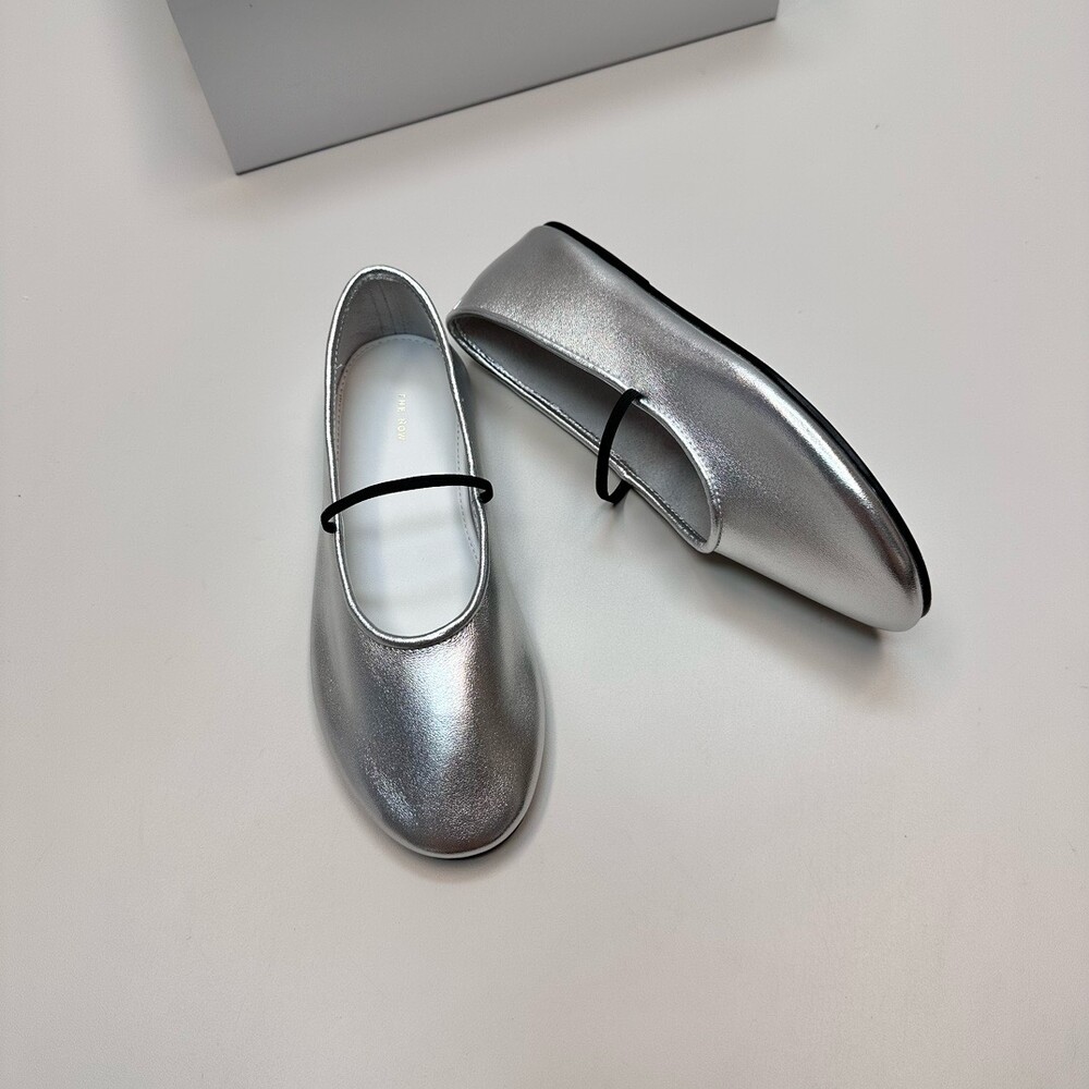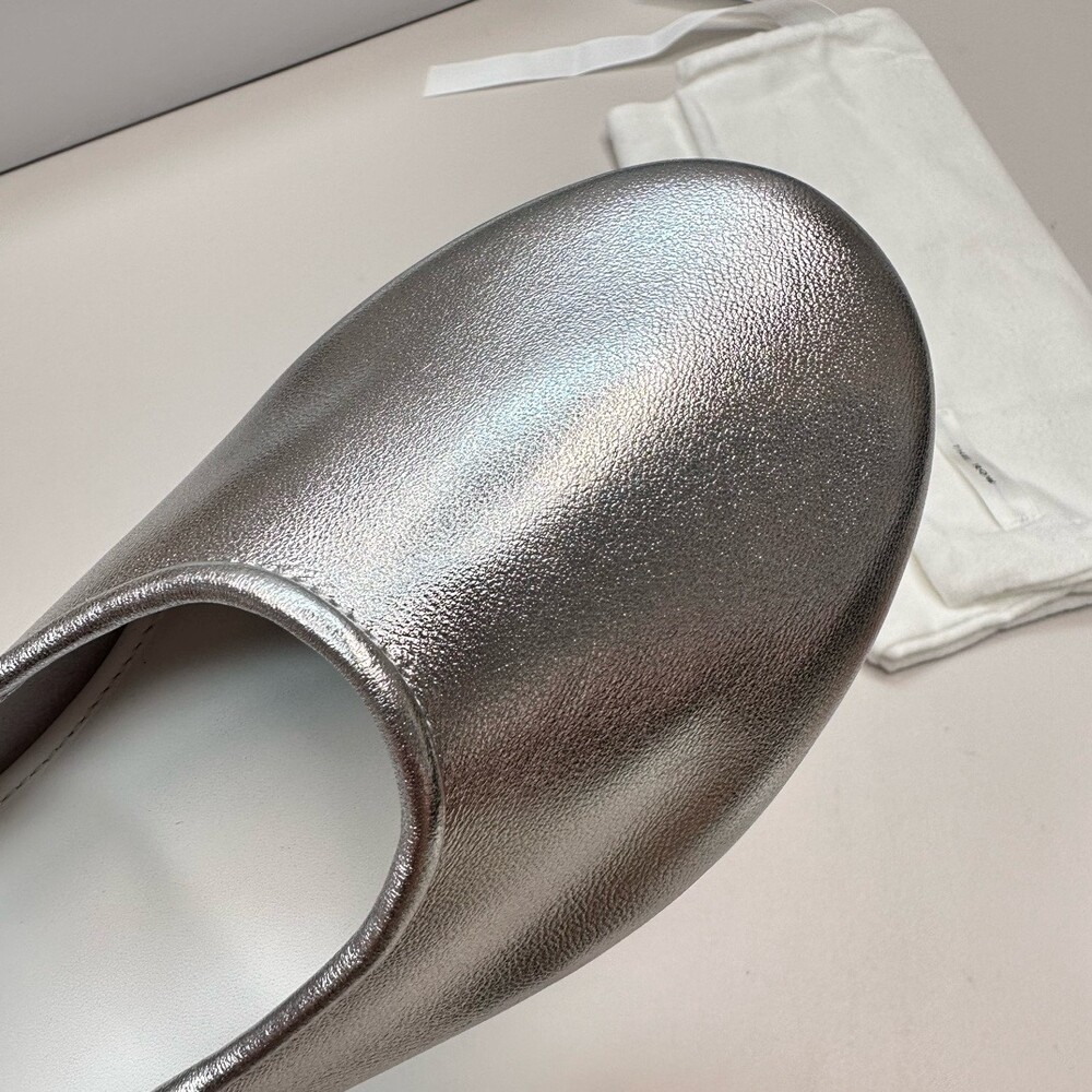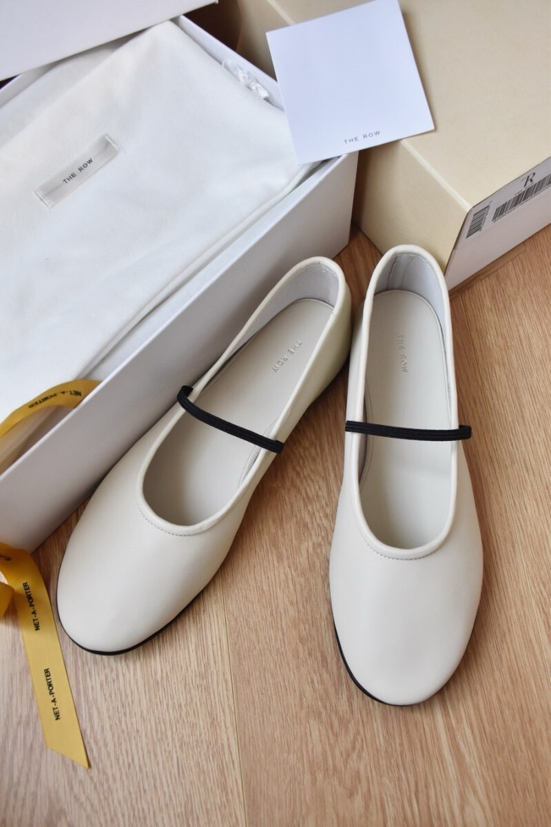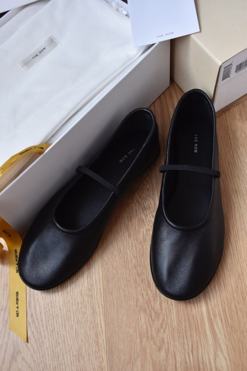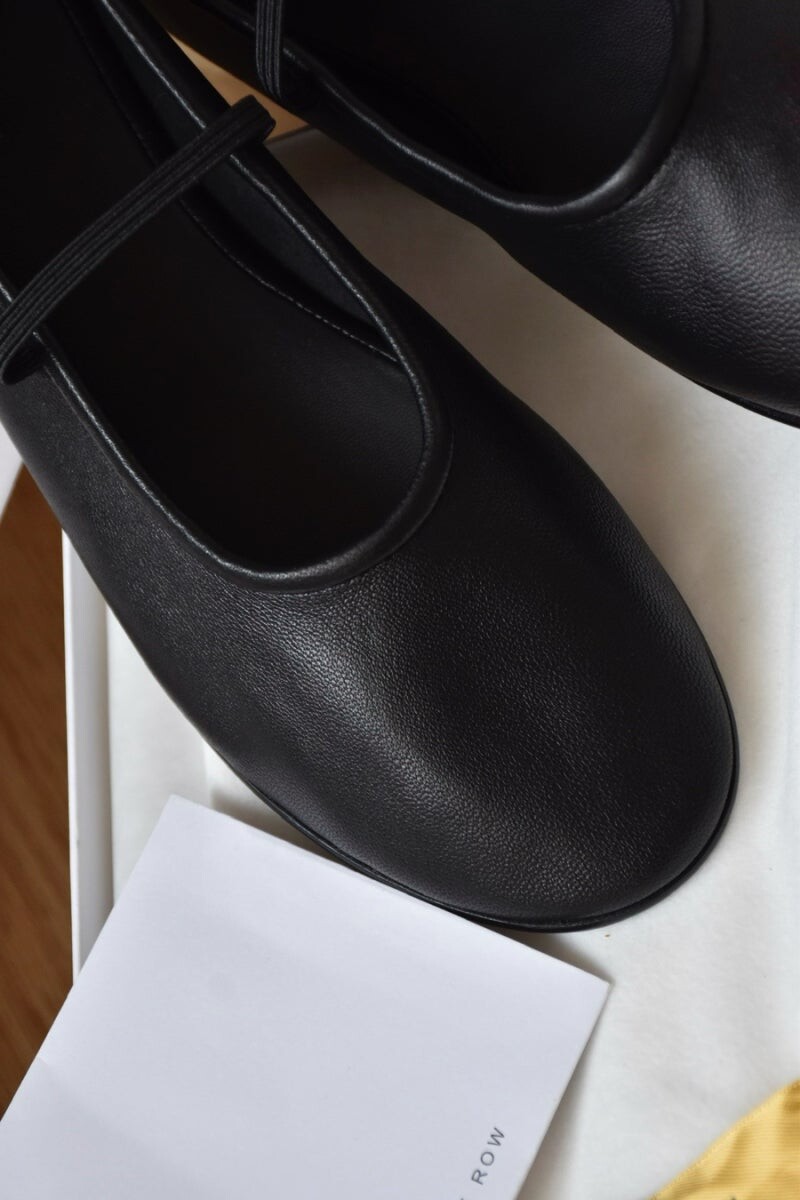 유연한 디컨스트럭티드 카프스킨 나파 가죽 소재의 클래식 발레 슬리퍼. 라운드 토 및 발등 부분의 섬세한 엘라스틱 스트랩.