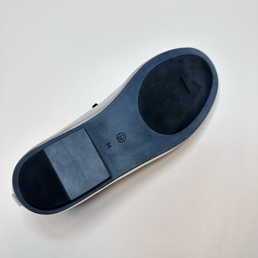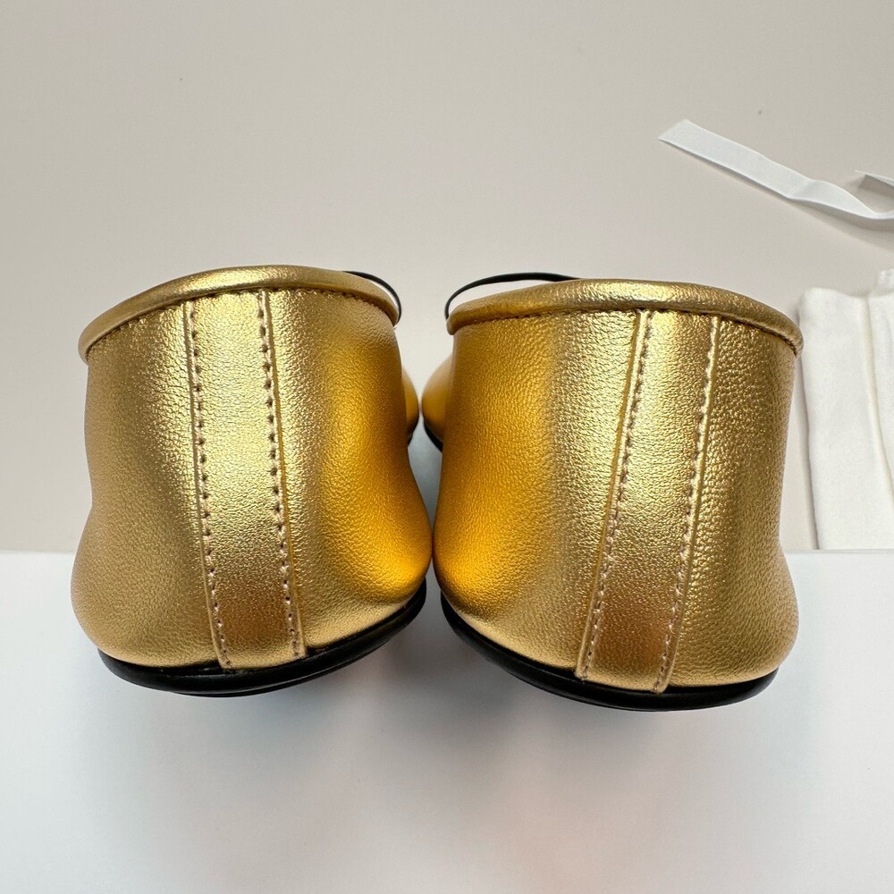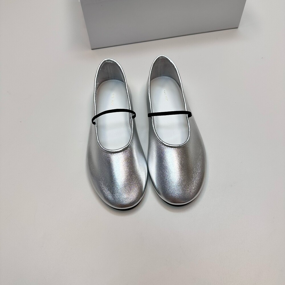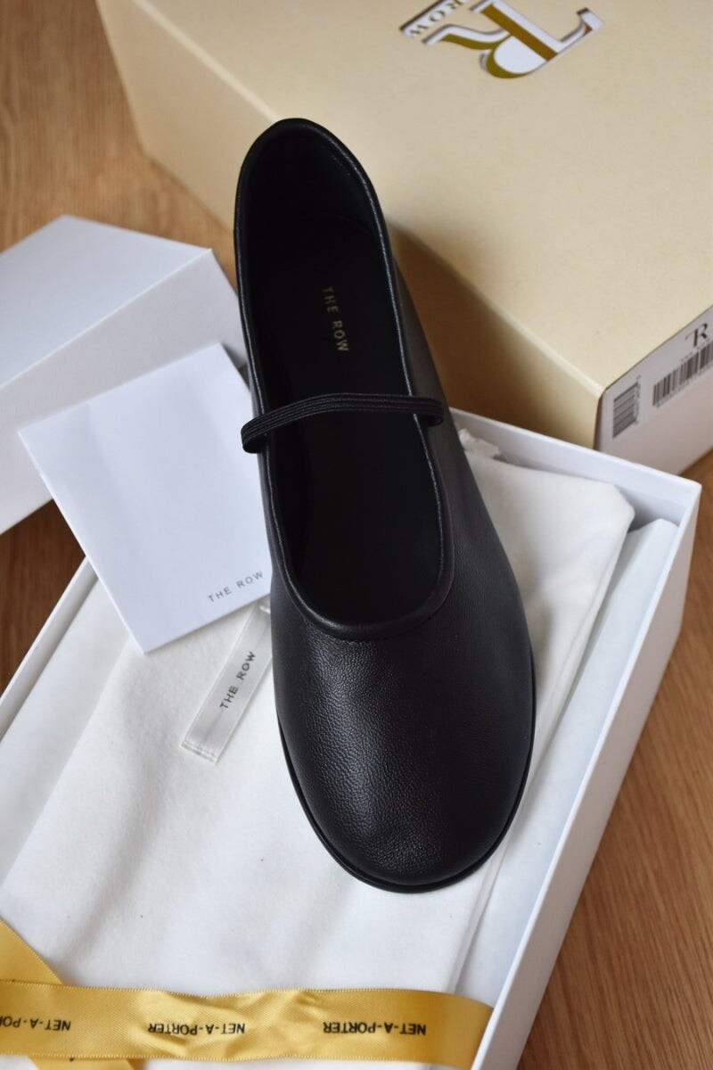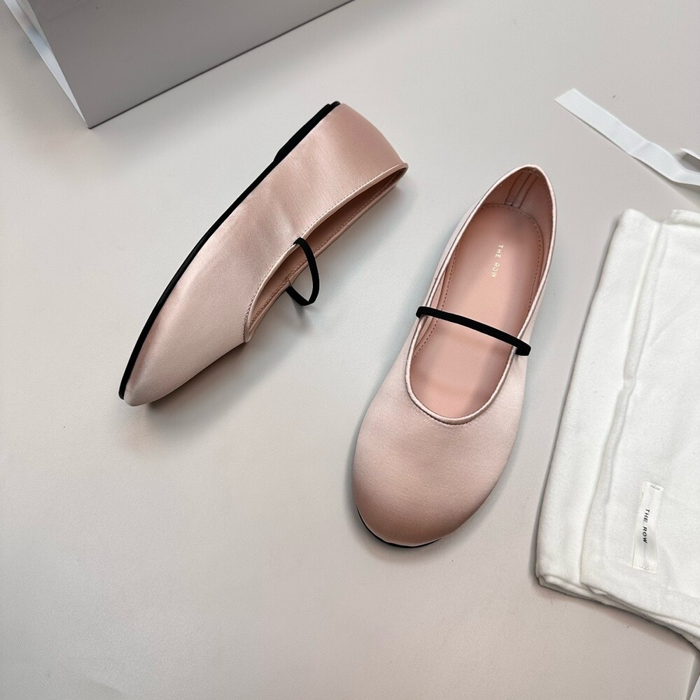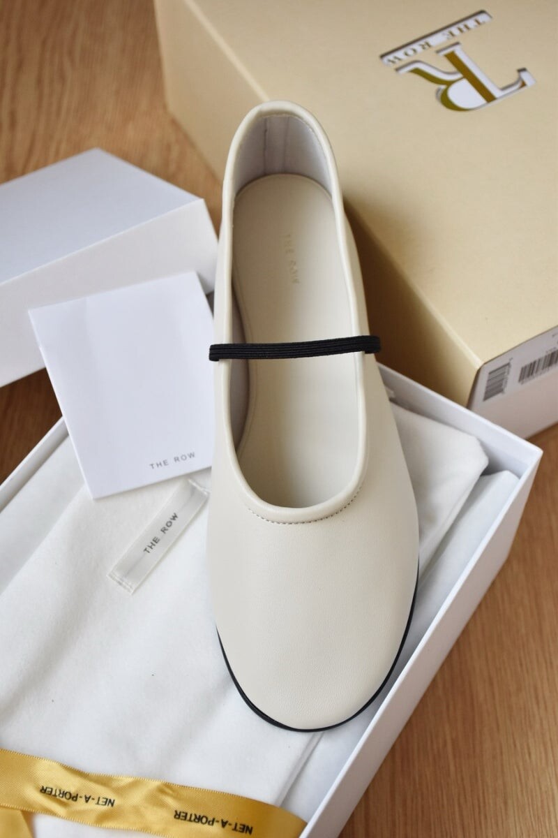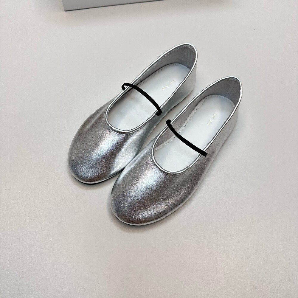 유연한 디컨스트럭티드 카프스킨 나파 가죽 소재의 클래식 발레 슬리퍼. 라운드 토 및 발등 부분의 섬세한 엘라스틱 스트랩.