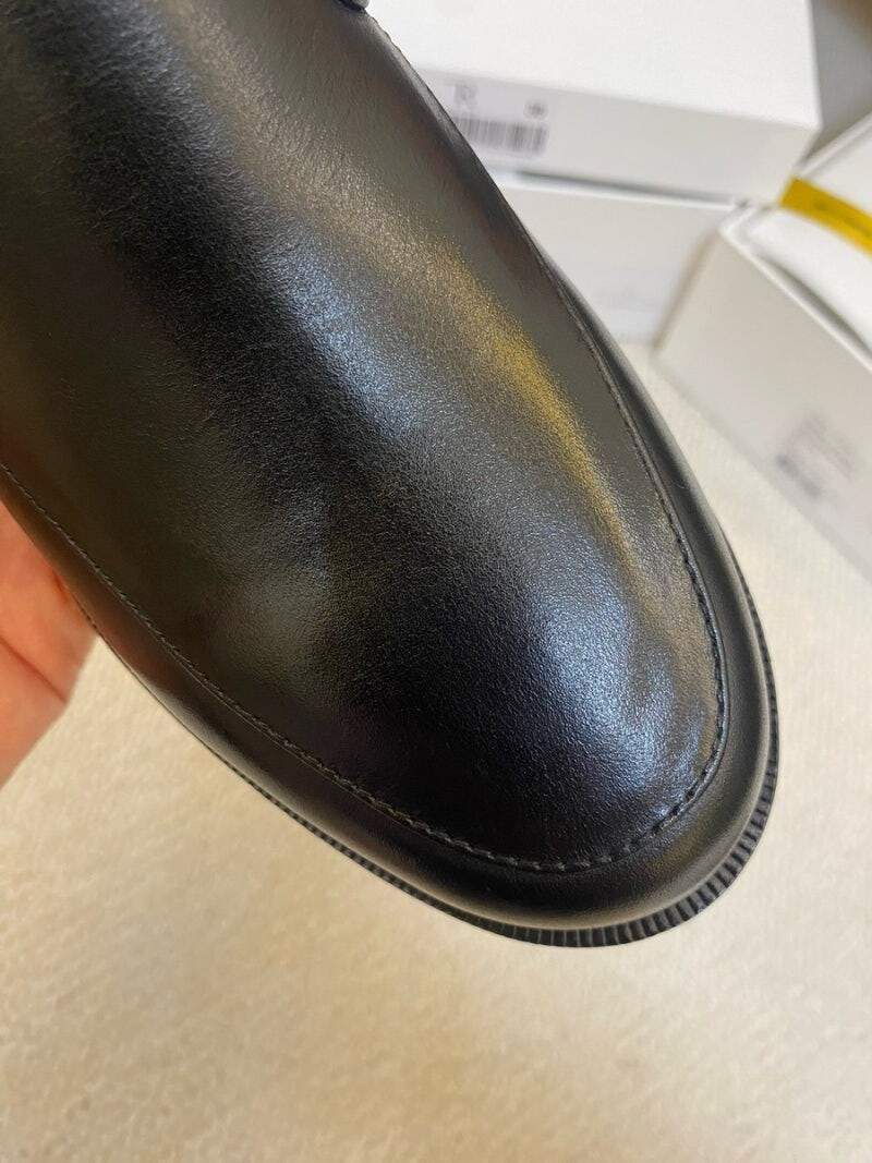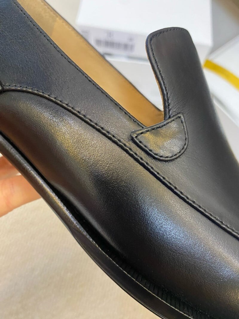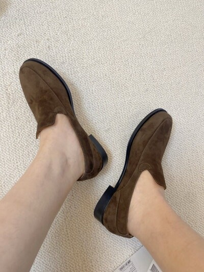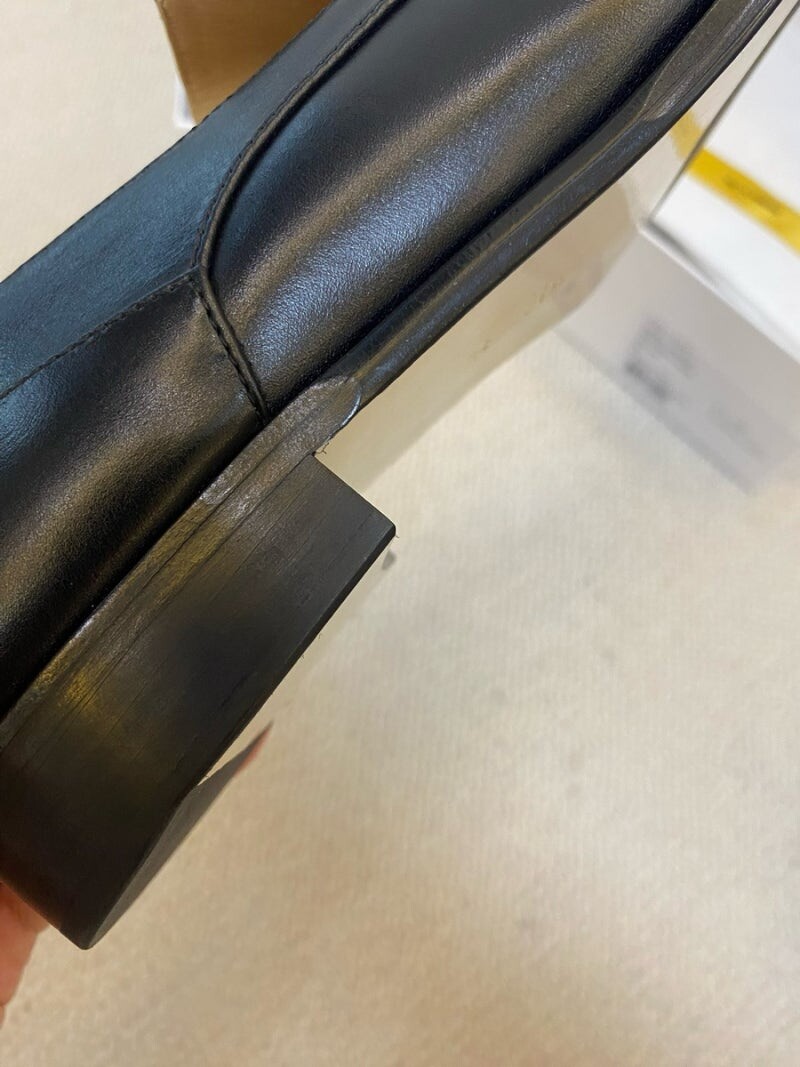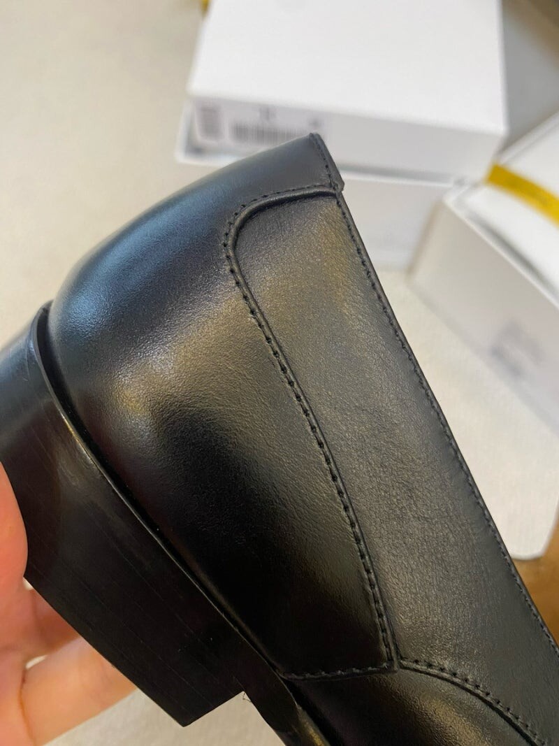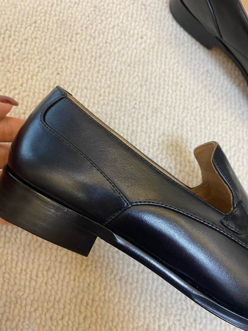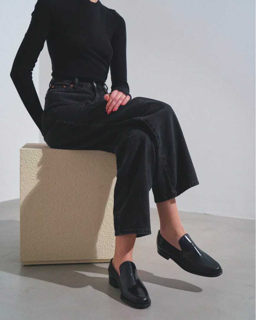 폴리시드 나파 가죽 소재의 모카신 스타일 로퍼. 길게 디자인된 토 및 낮은 스택 힐.