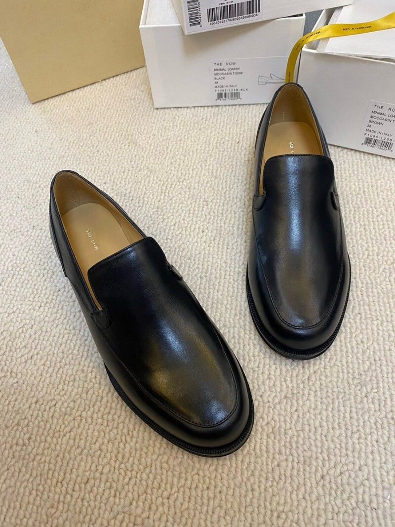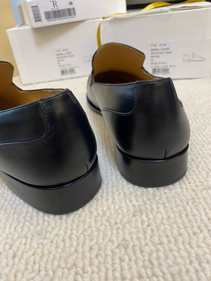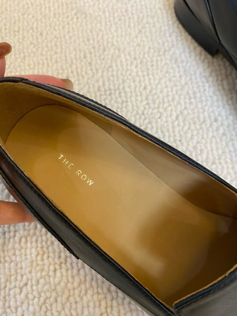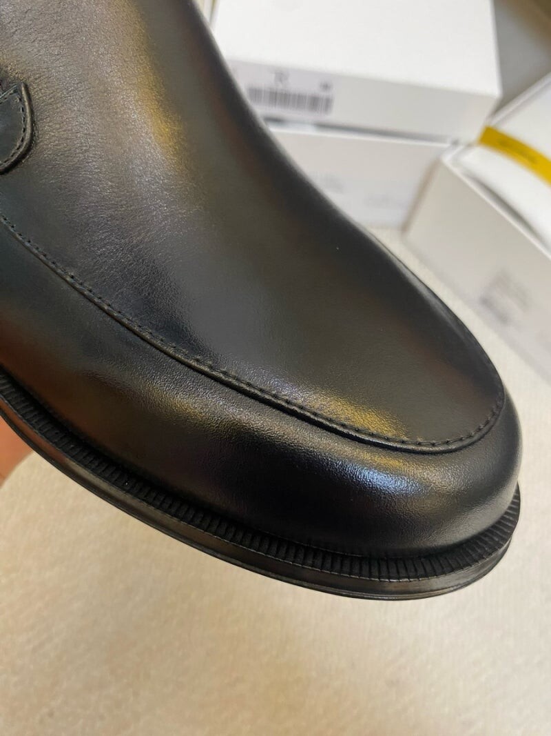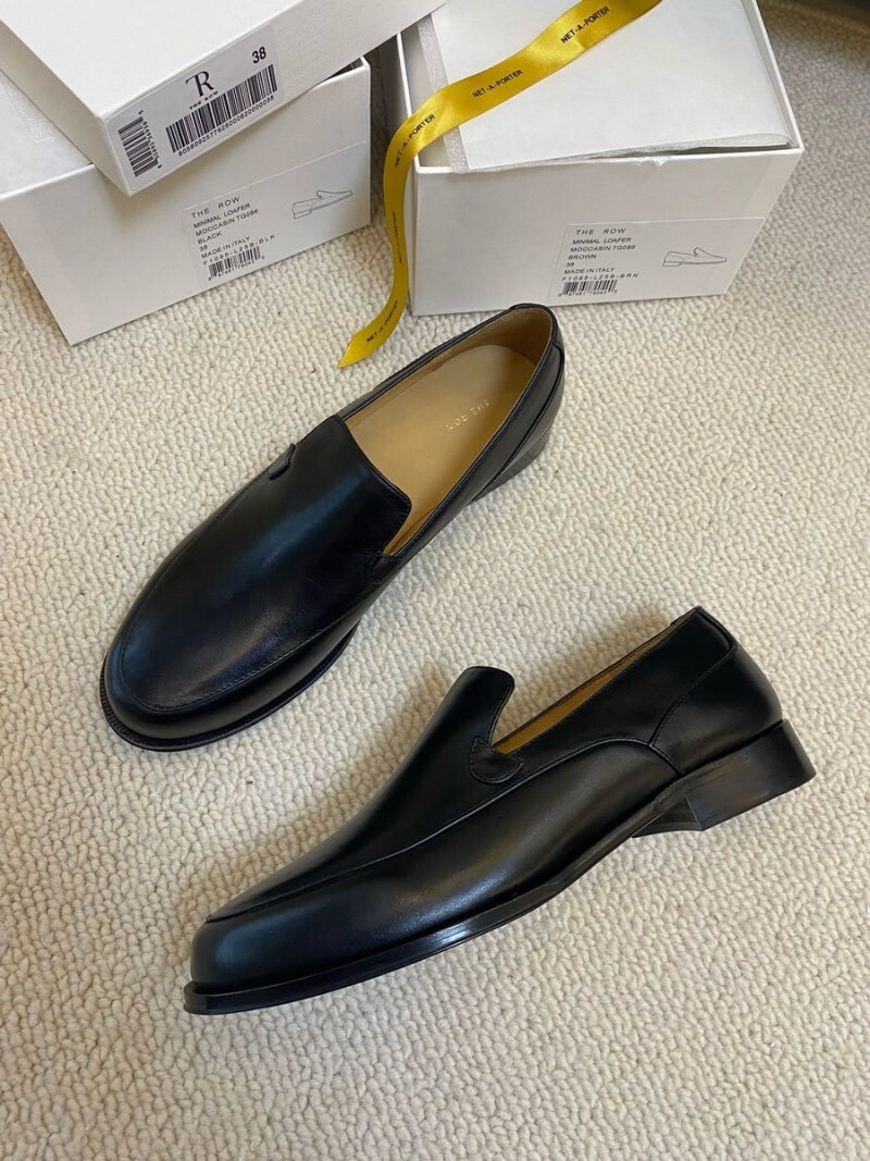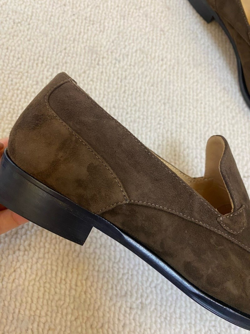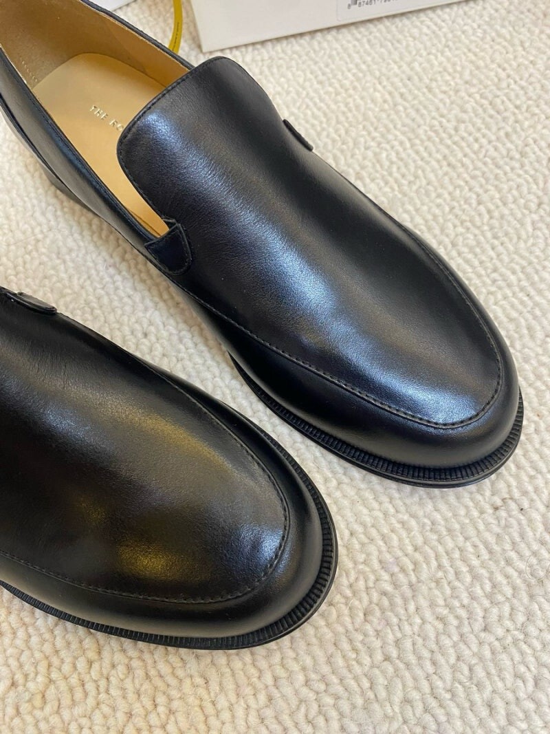 폴리시드 나파 가죽 소재의 모카신 스타일 로퍼. 길게 디자인된 토 및 낮은 스택 힐.