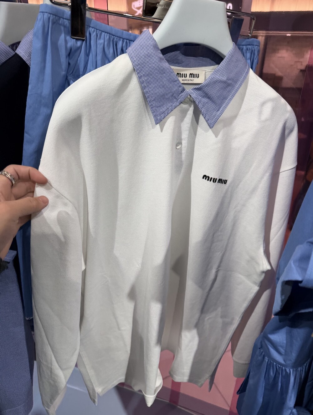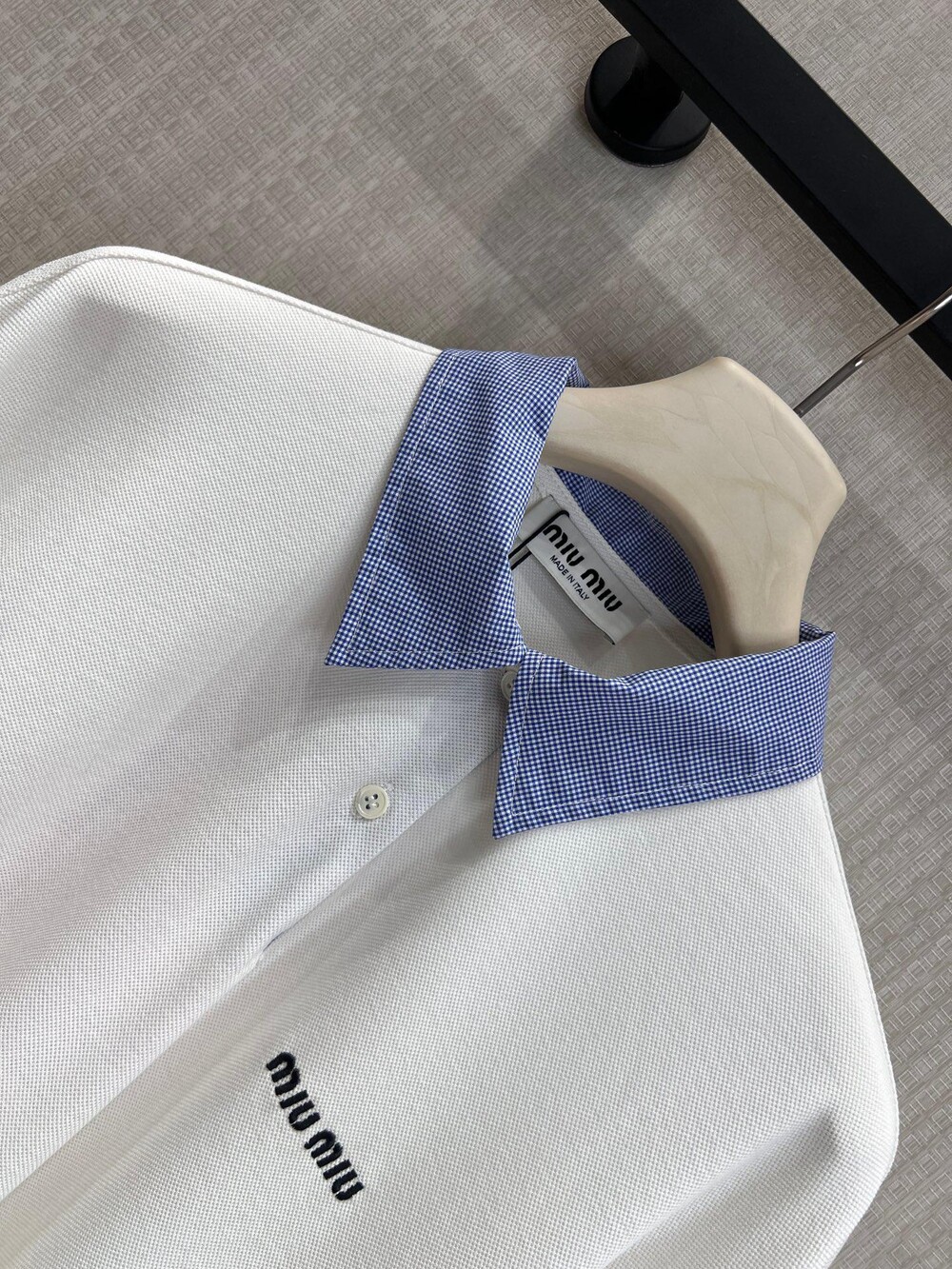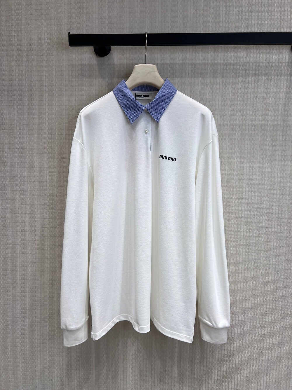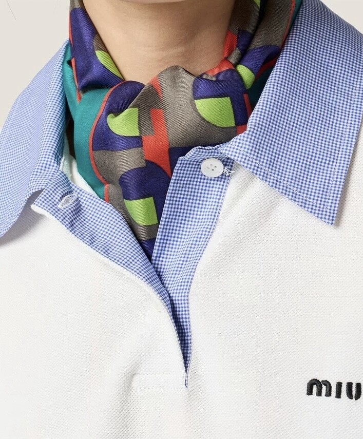 미우미우의 아이코닉한 감성이 담긴 이 코튼 피케 폴로 셔츠는 로고 자수 장식과 남성복에서 영감을 받은 체크 포플린 칼라가 특징으로, 룩에 세련된 개성을 더합니다.